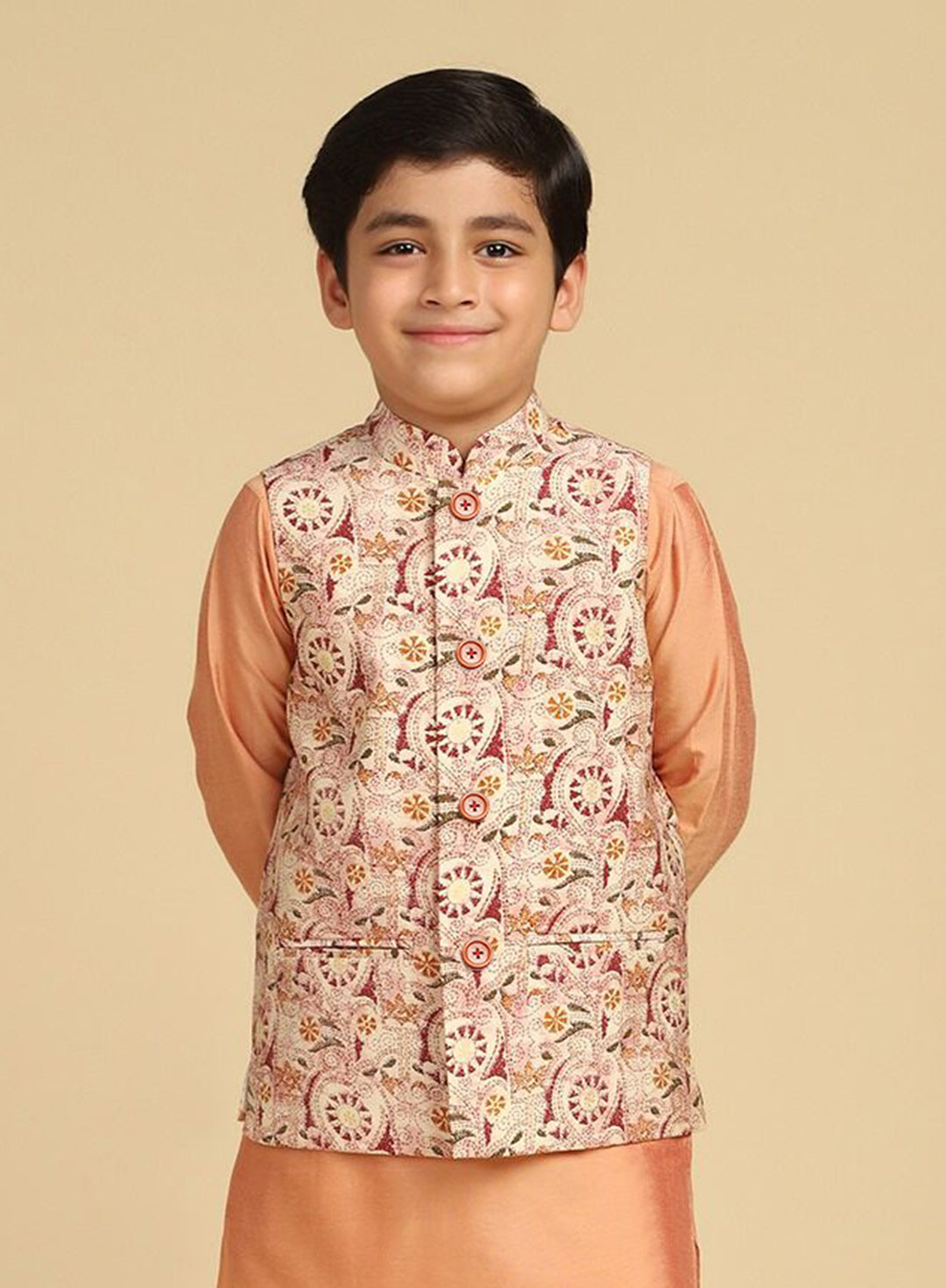 Experience classic elegance with this Kisah Boy's Multi Cotton Blend Printed Nehru Jacket. The breathable fabric ensures comfort throughout the day. Ideal for festive events or casual wear.
