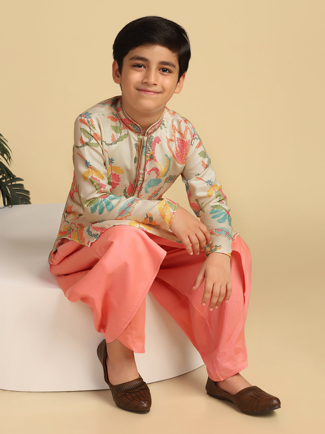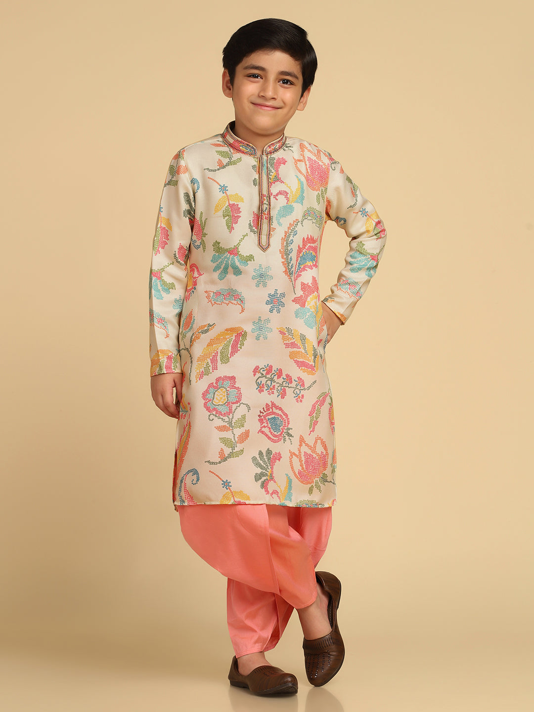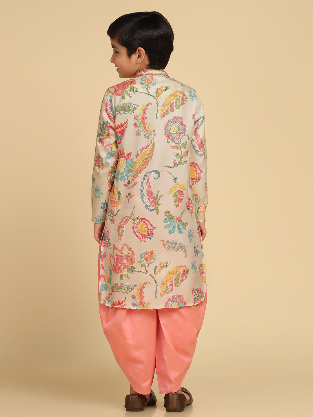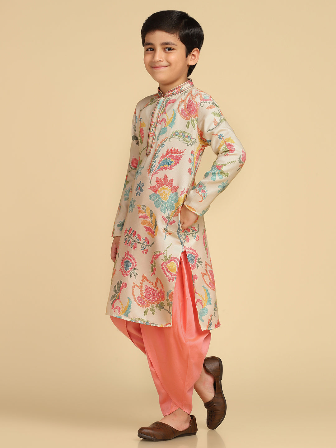 Experience classic elegance with this Kisah Boy's Multi Cotton Blend Printed Kurta Dhoti Pant Set. The breathable fabric ensures comfort throughout the day. Ideal for festive events or casual wear.