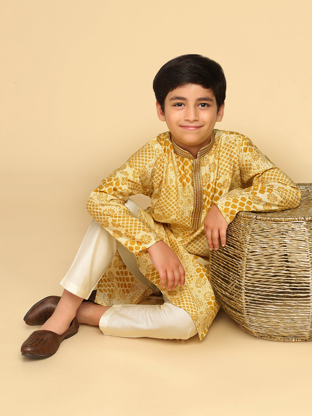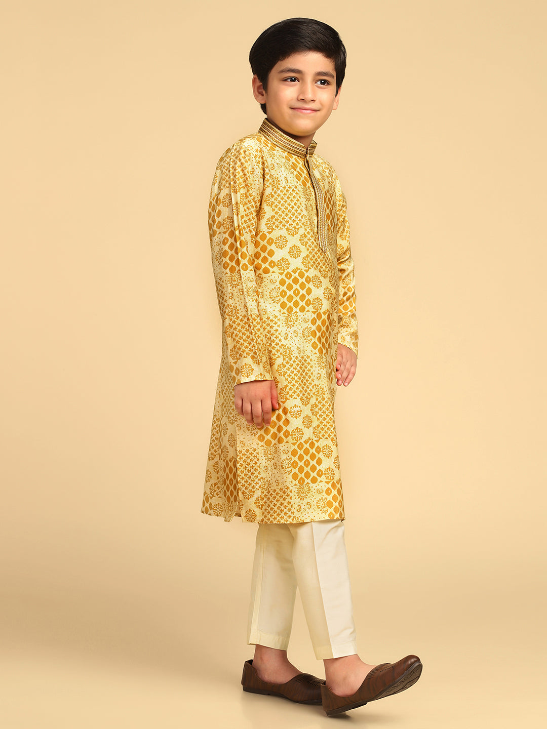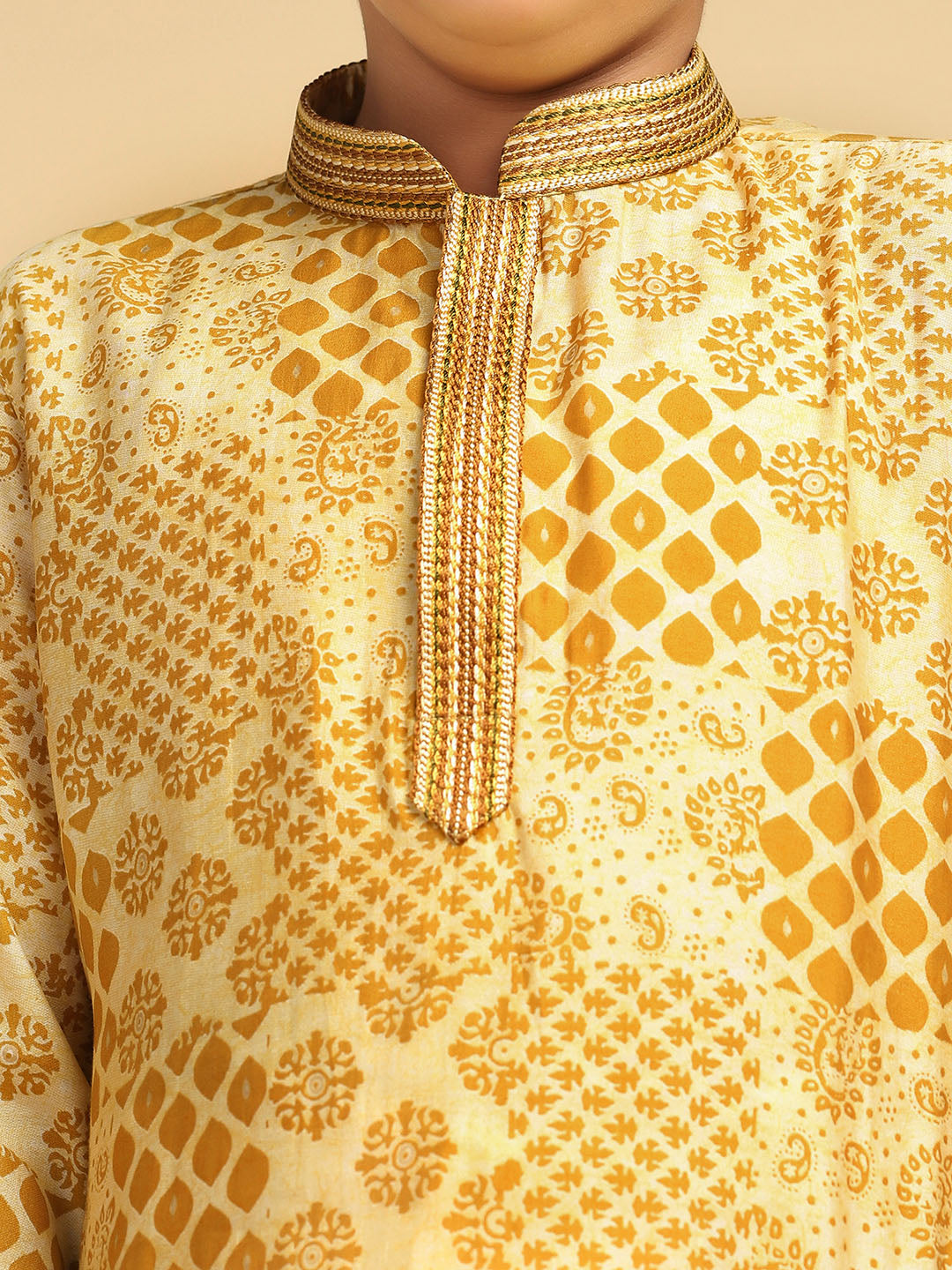 Experience classic elegance with this Kisah Boy's Mustard Cotton Blend Printed Kurta Pyjama Set. The breathable fabric ensures comfort throughout the day. Ideal for festive events or casual wear.