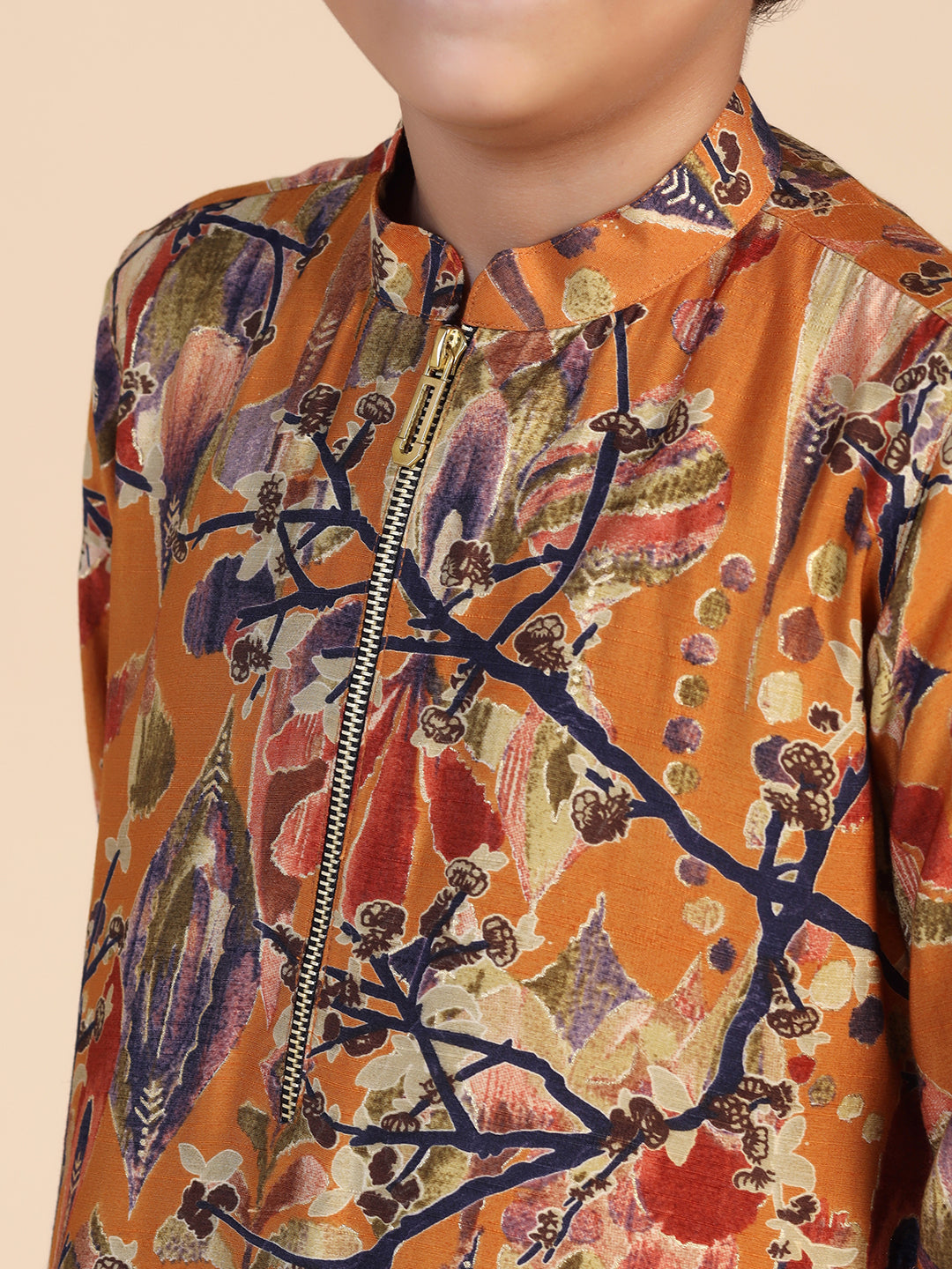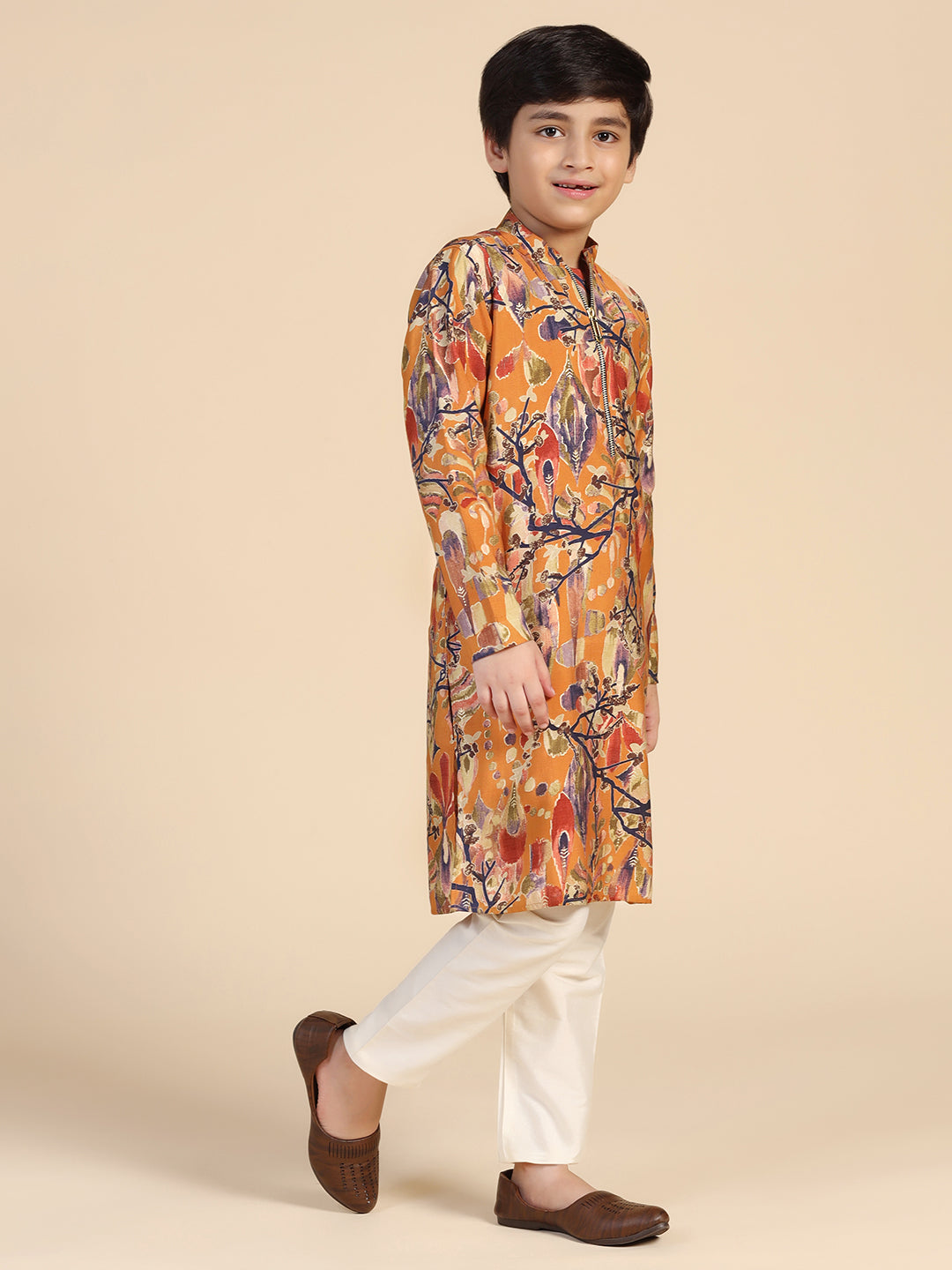 Experience classic elegance with this Kisah Boy's Mustard Printed Kurta. The breathable fabric ensures comfort throughout the day. Ideal for festive events or casual wear.