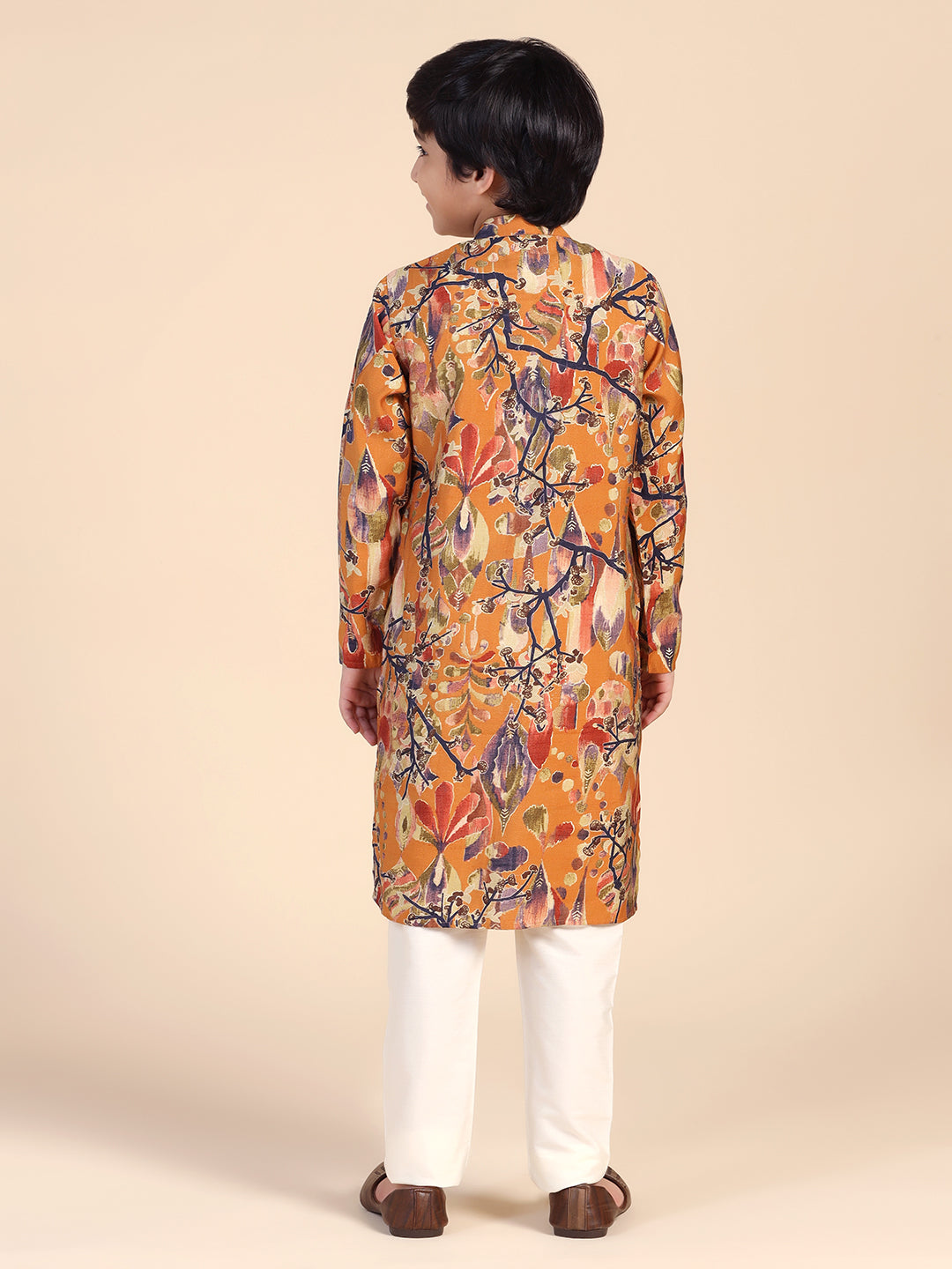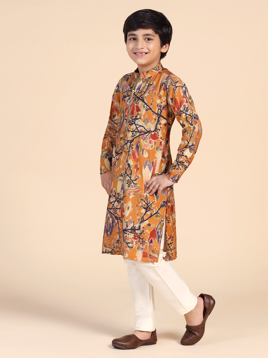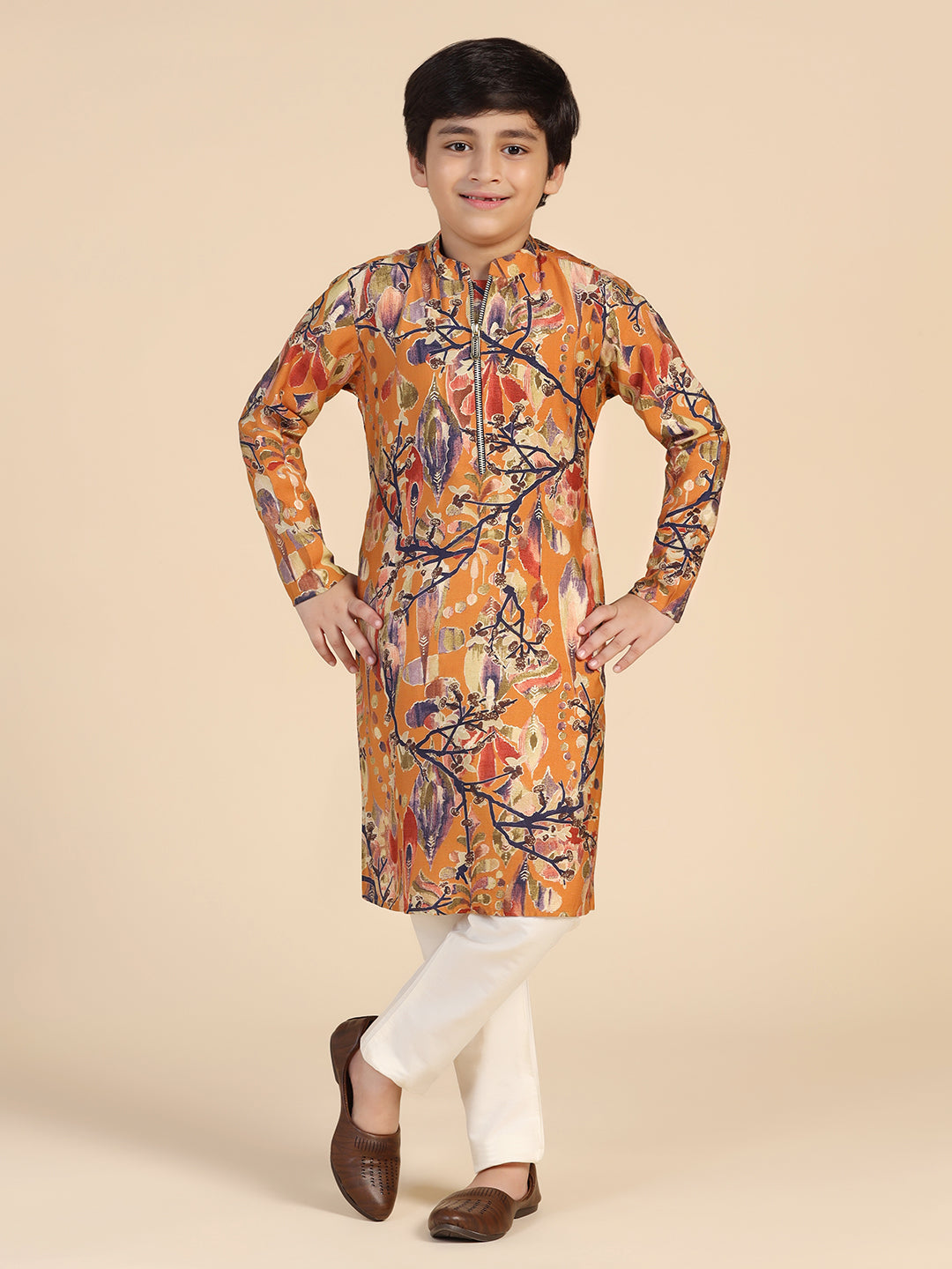 Experience classic elegance with this Kisah Boy's Mustard Printed Kurta Pyjama Set. The breathable fabric ensures comfort throughout the day. Ideal for festive events or casual wear.