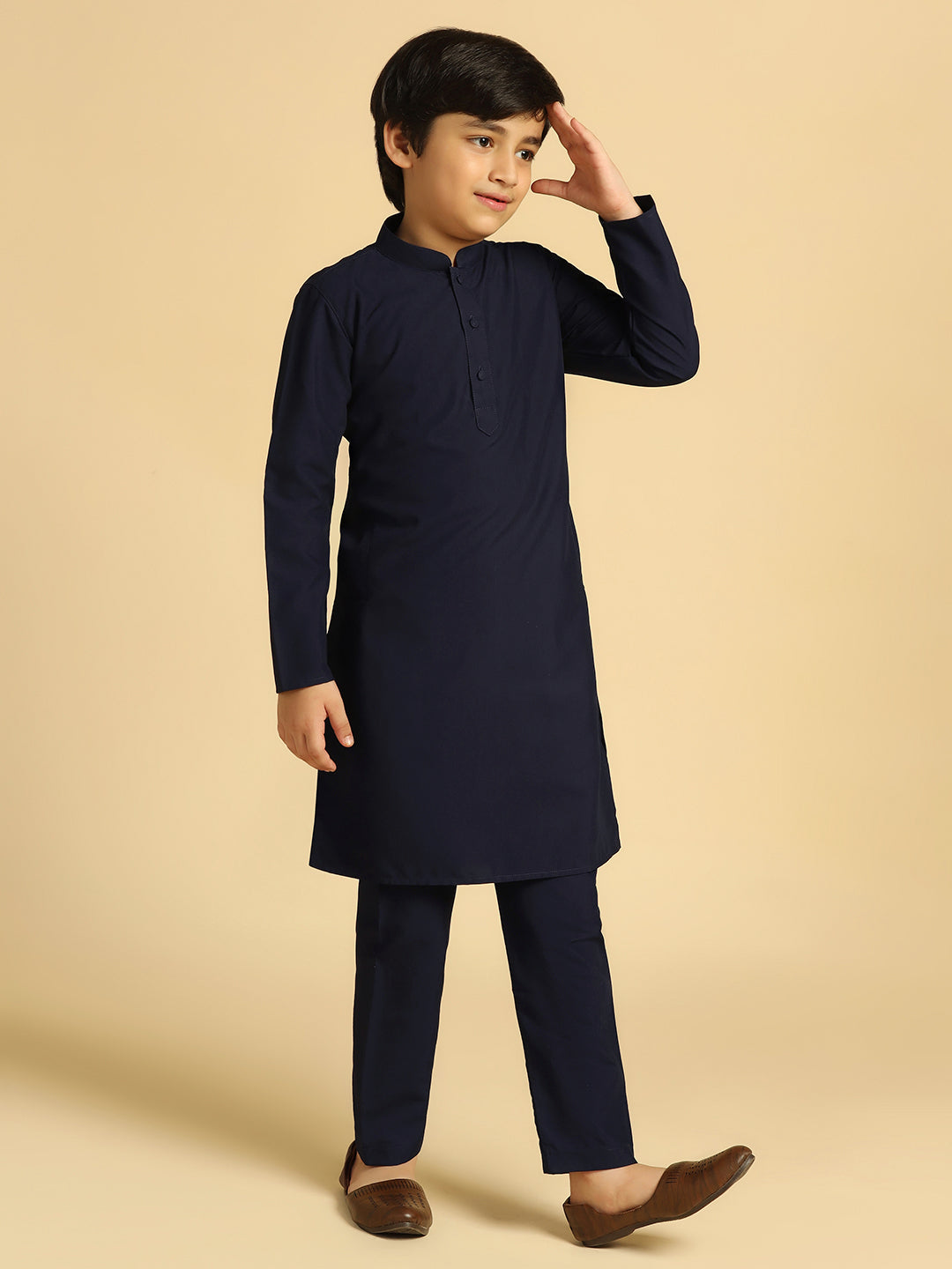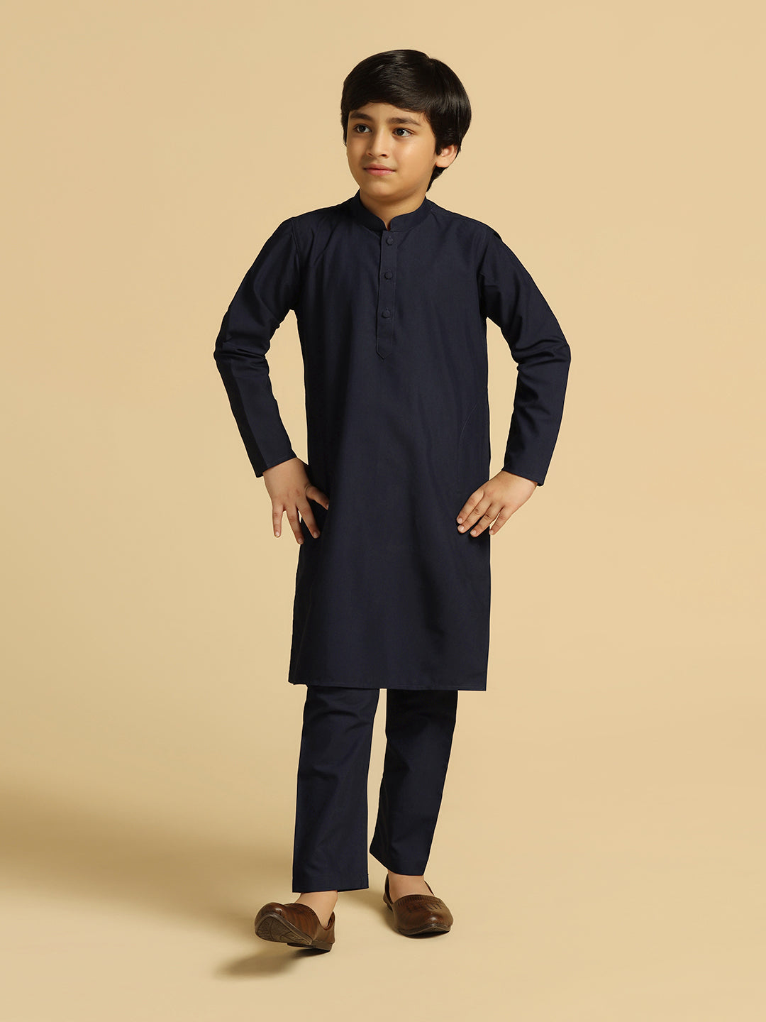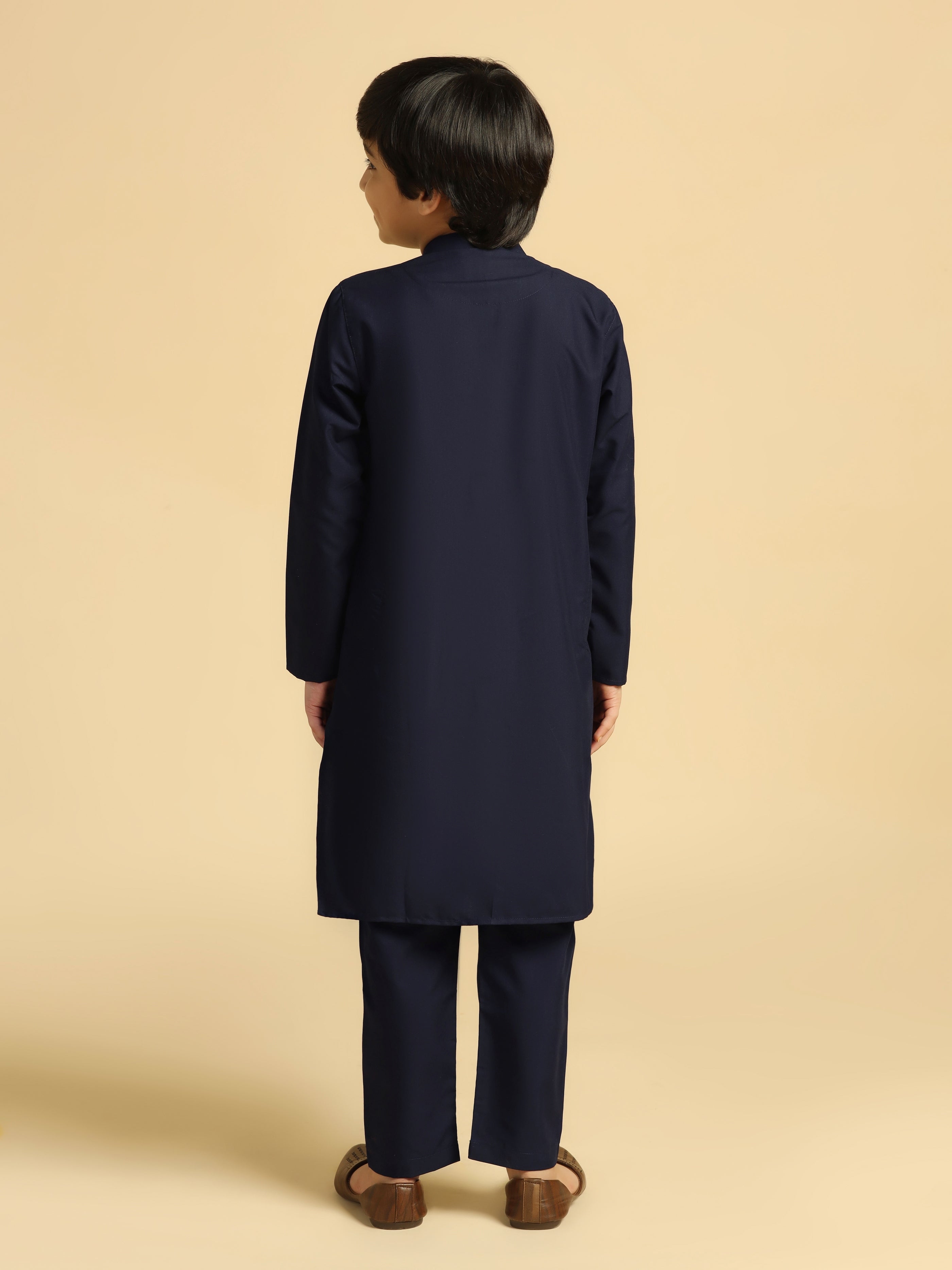 Experience classic elegance with this Kisah Boy's Navy Blue Cotton Solid Kurta. The breathable fabric ensures comfort throughout the day. Ideal for festive events or casual wear.