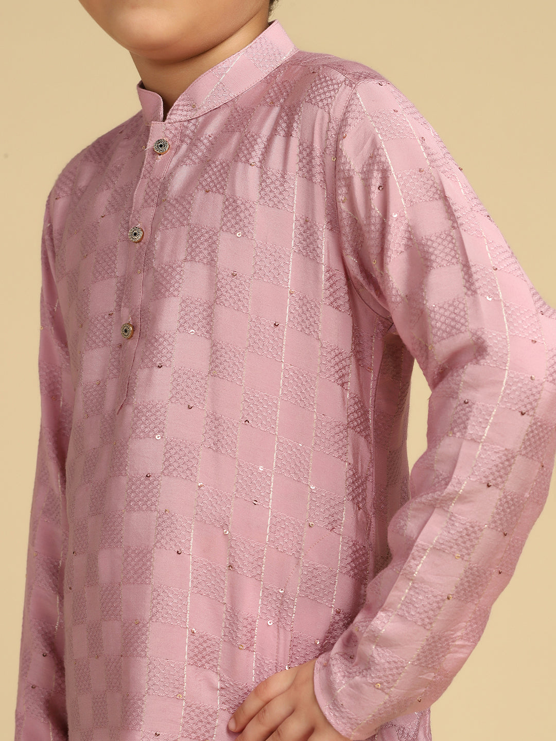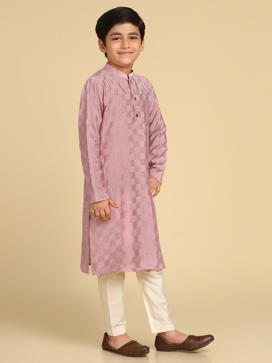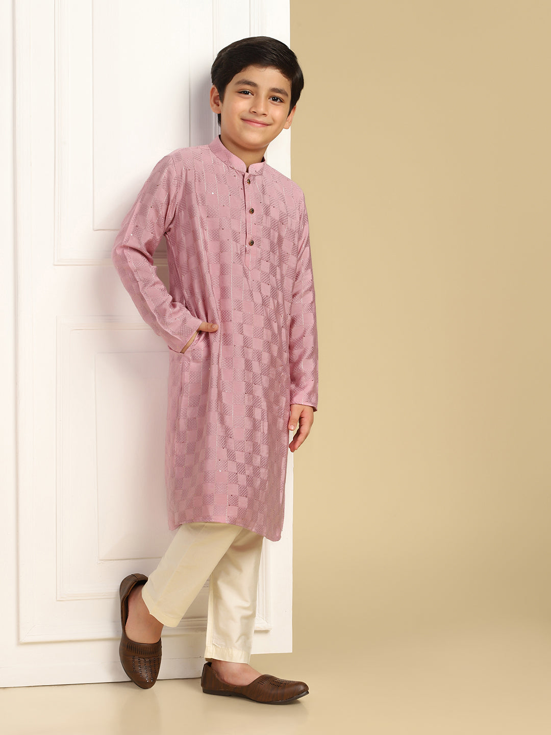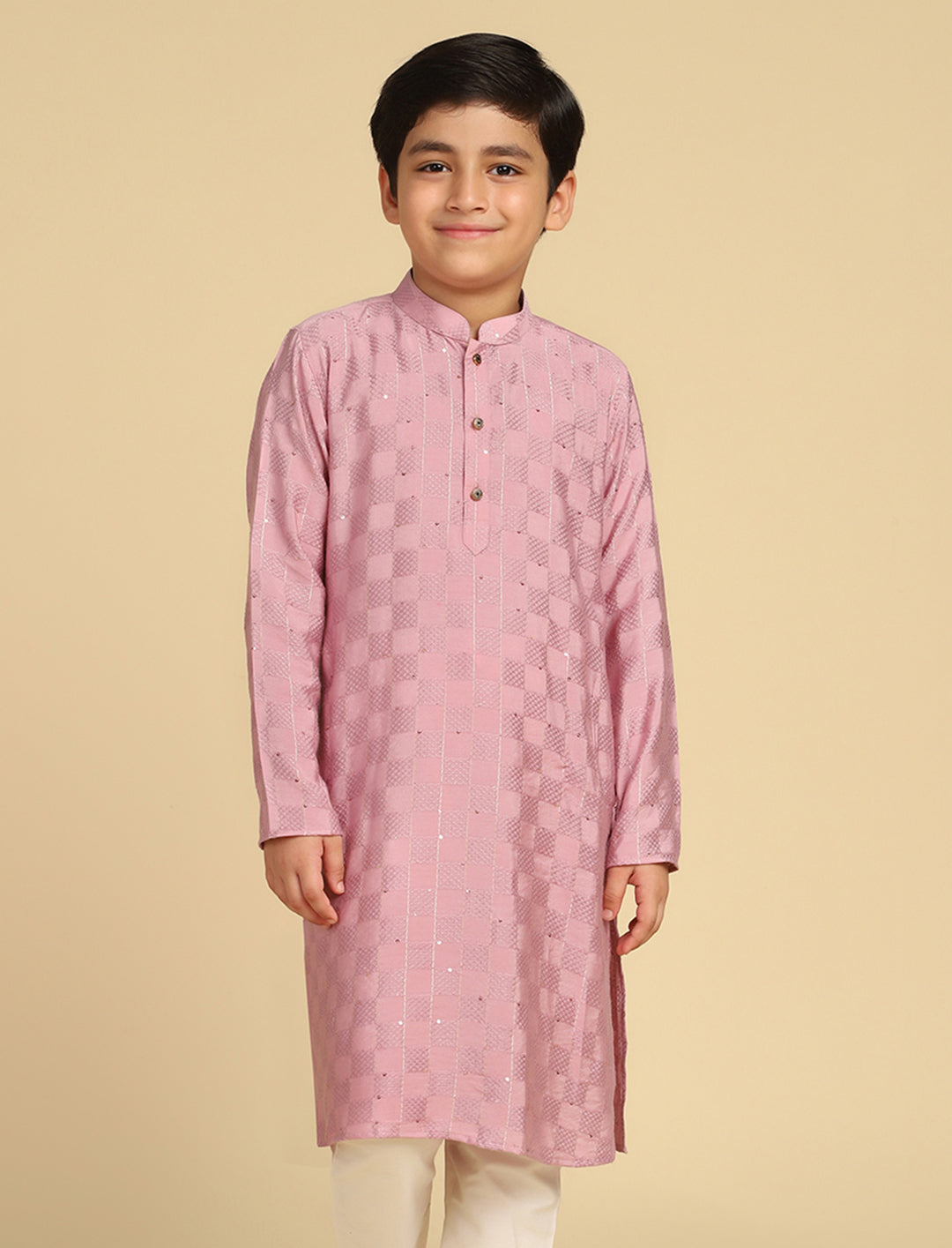 Experience classic elegance with this Kisah Boy's Onion Pink Cotton Blend Woven Design Kurta. The breathable fabric ensures comfort throughout the day. Ideal for festive events or casual wear.