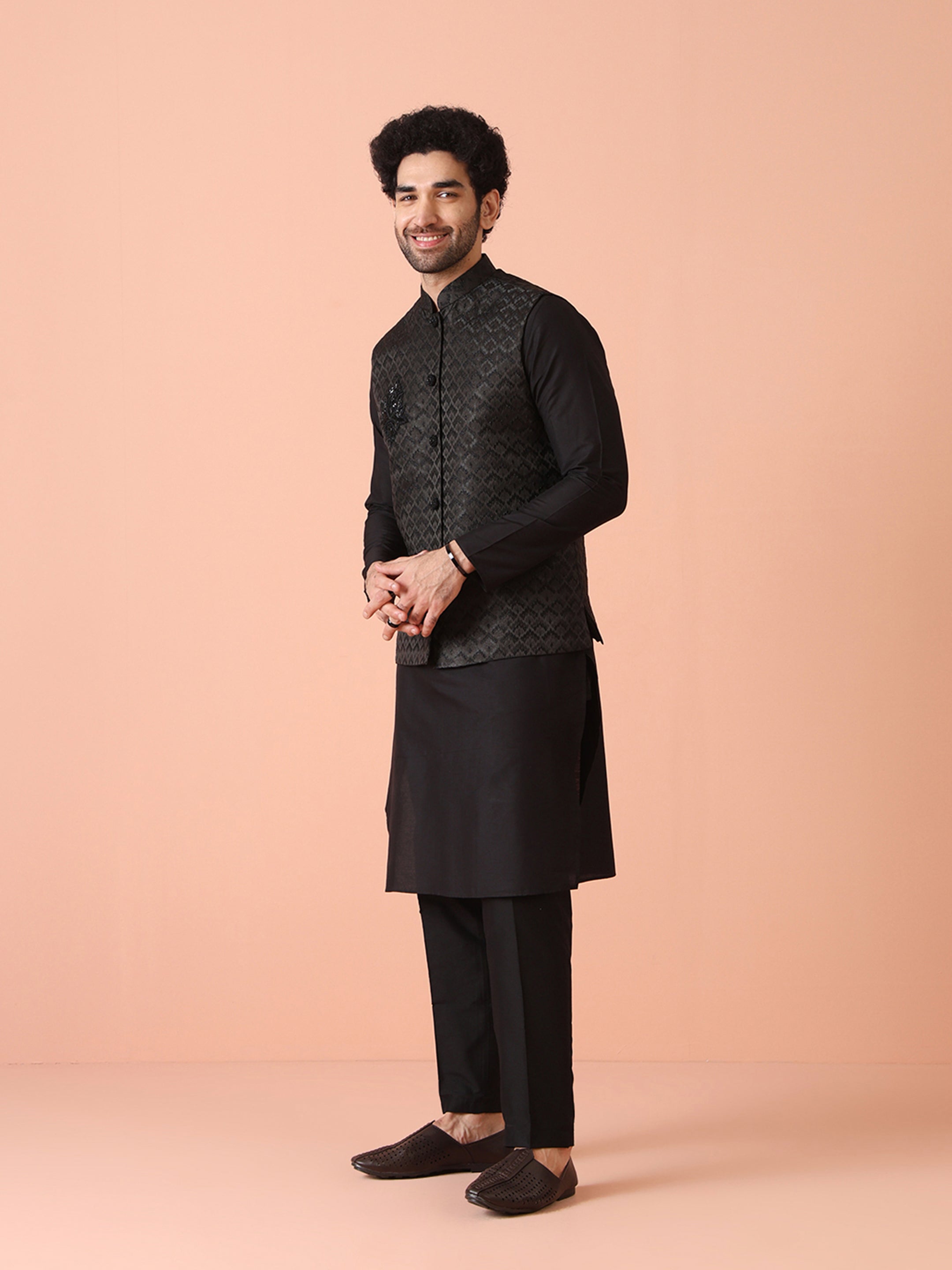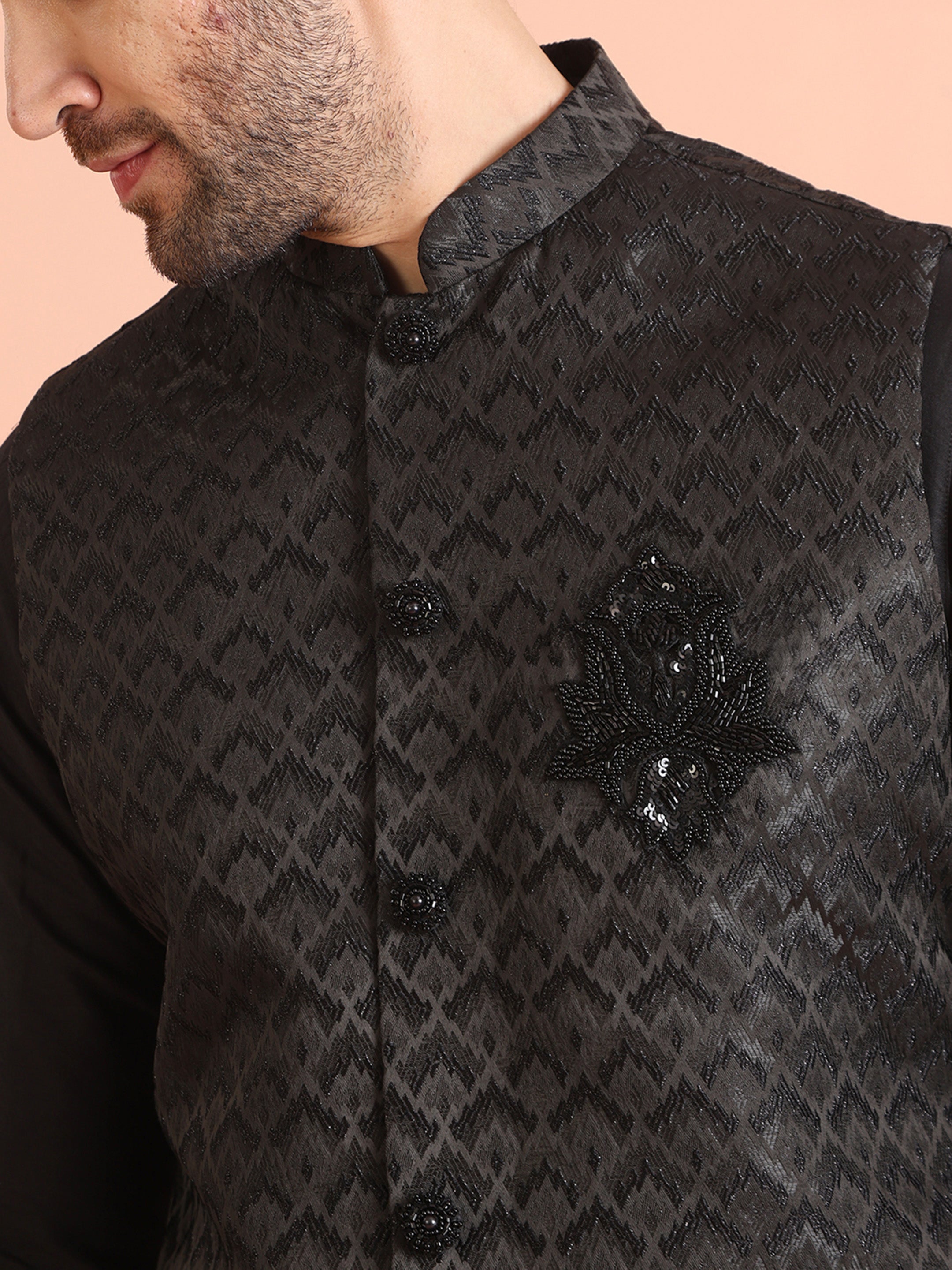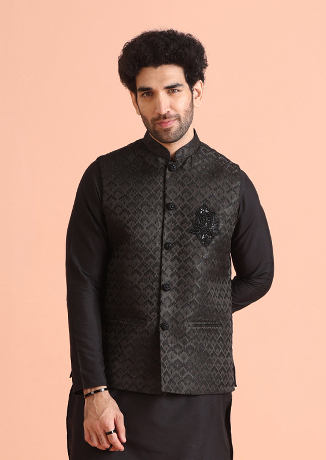 Experience classic elegance with this Men's Black Color Silk Blend Nehru Jacket. The Jacquard Pattern adds a refined touch, while the breathable fabric ensures comfort throughout the day. Ideal for festive events or casual wear, this Nehru Jacket is a wardrobe essential.