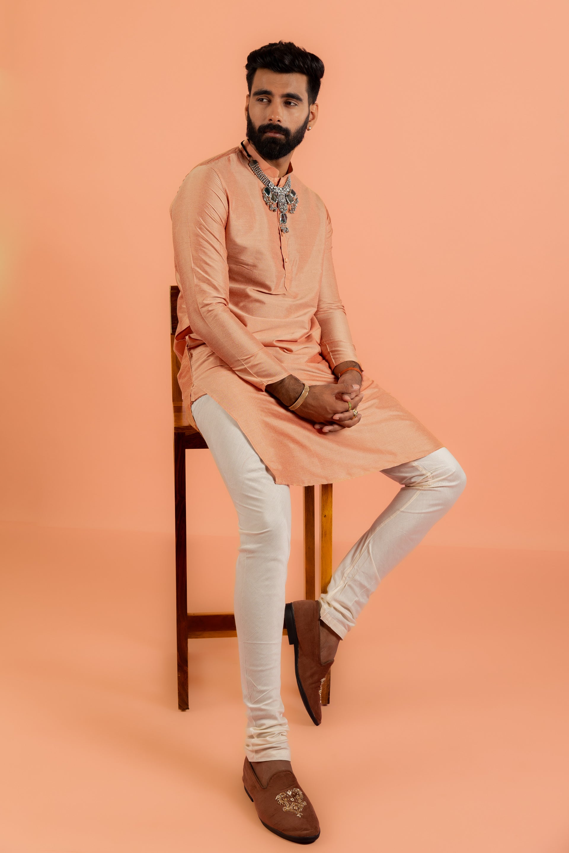 Experience classic elegance with this Kisah Men Coral Cotton Blend Solid Pattern, Kurta Churidar Set. The breathable fabric ensures comfort throughout the day. Ideal for festive events or casual wear.