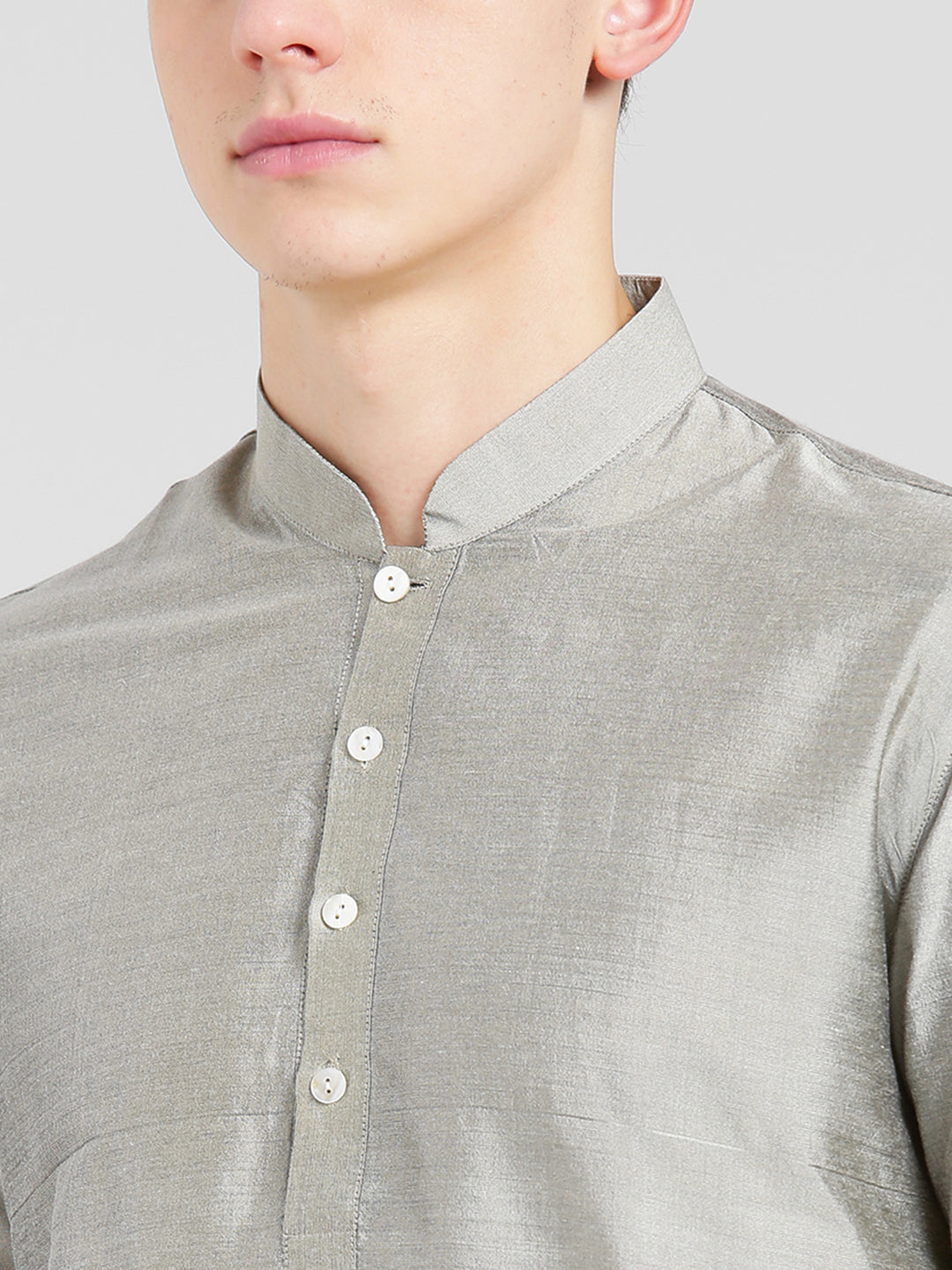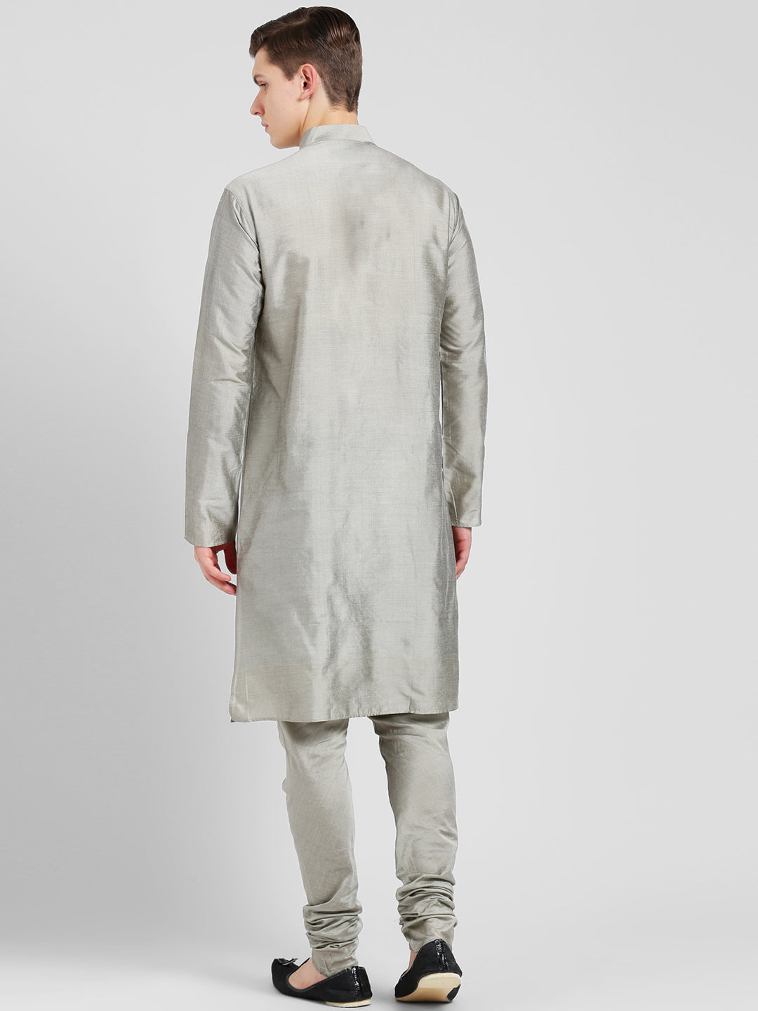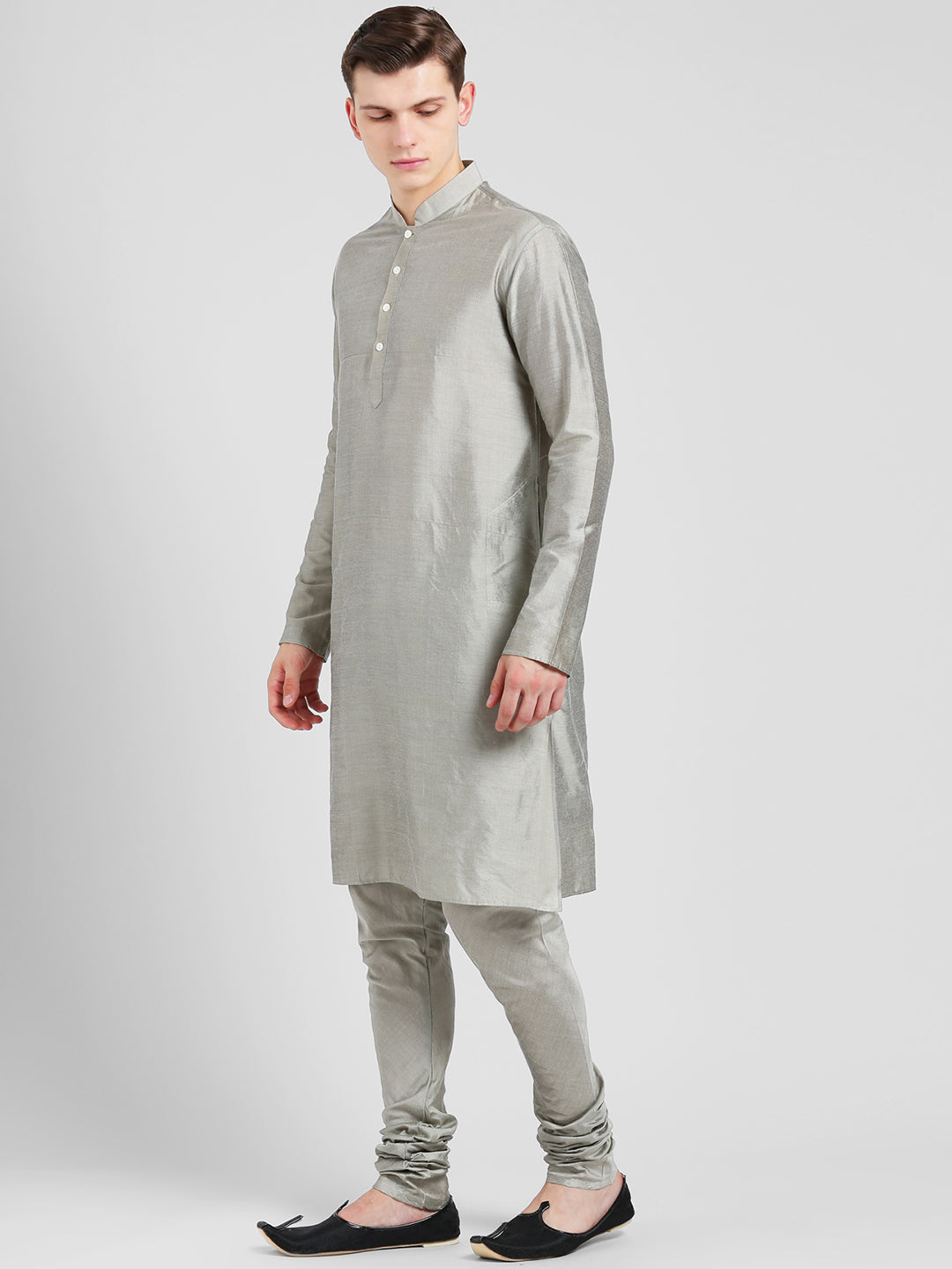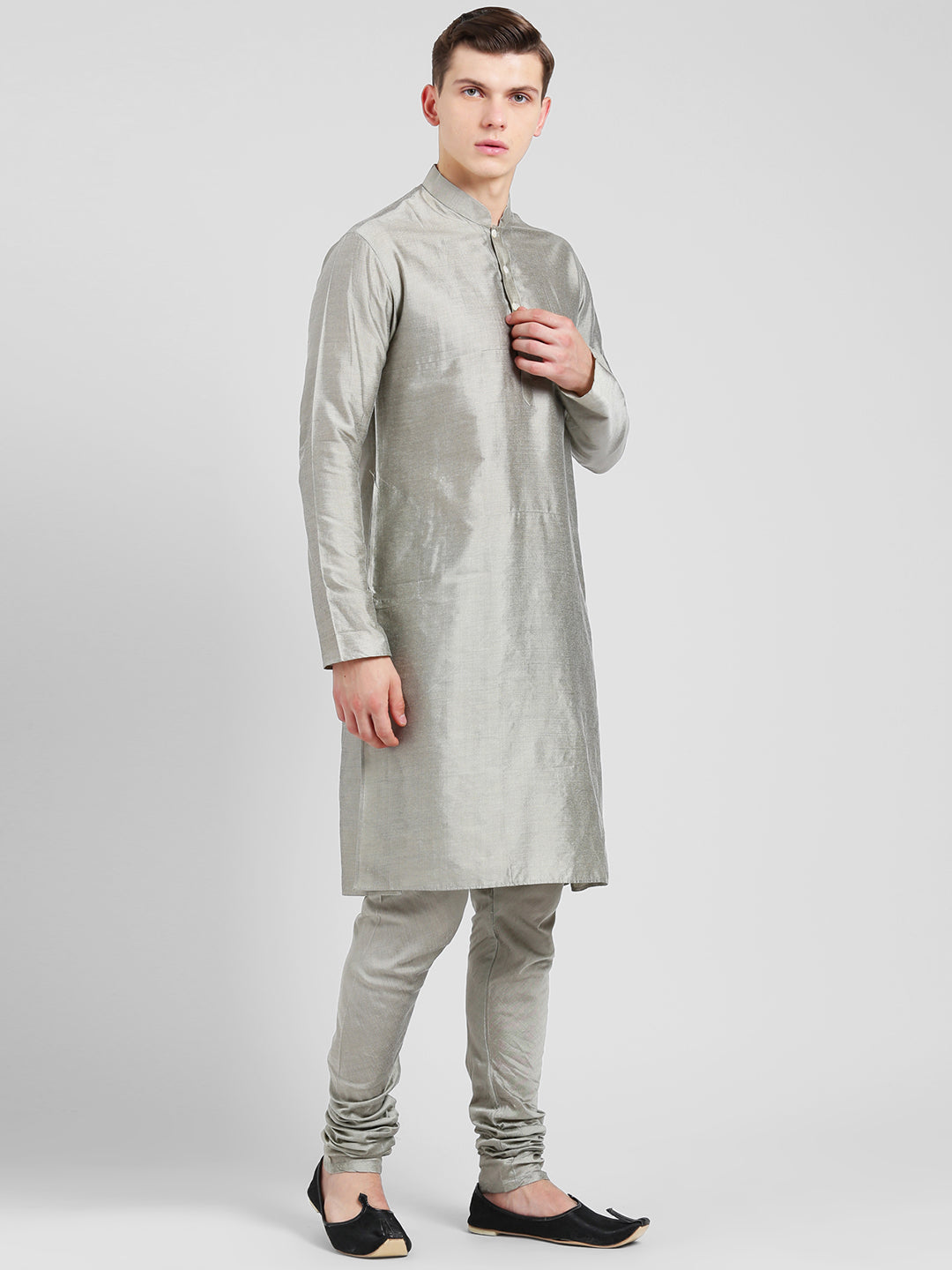 Elevate your style with this elegant Grey color Kurta Churidar Set. Made from a premium Cotton Silk Fabric and Solid pattern, it offers unmatched comfort and sophistication. Perfect for any festive occasion.