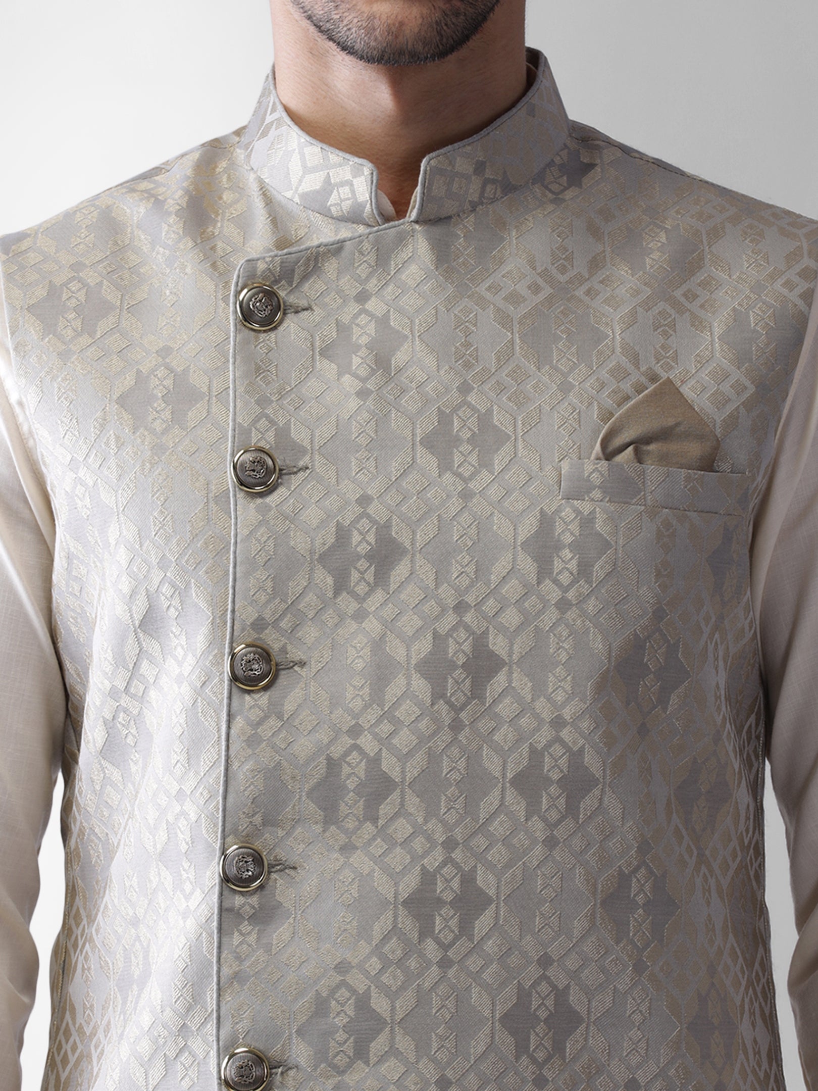 Elevate your style with this elegant Grey color Kurta Jacket Dhoti Set. Made from a premium Silk Blend Fabric and Jacquard pattern, it offers unmatched comfort and sophistication. Perfect for any festive occasion.