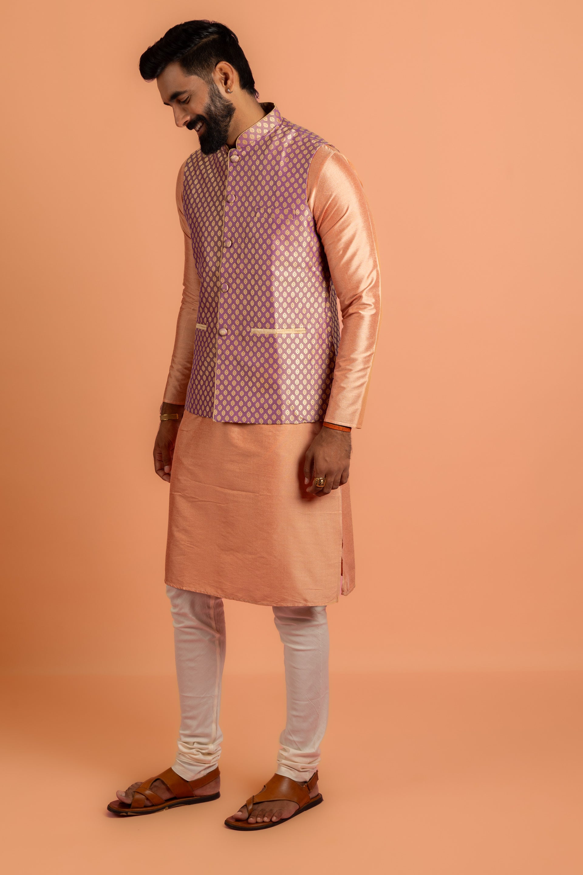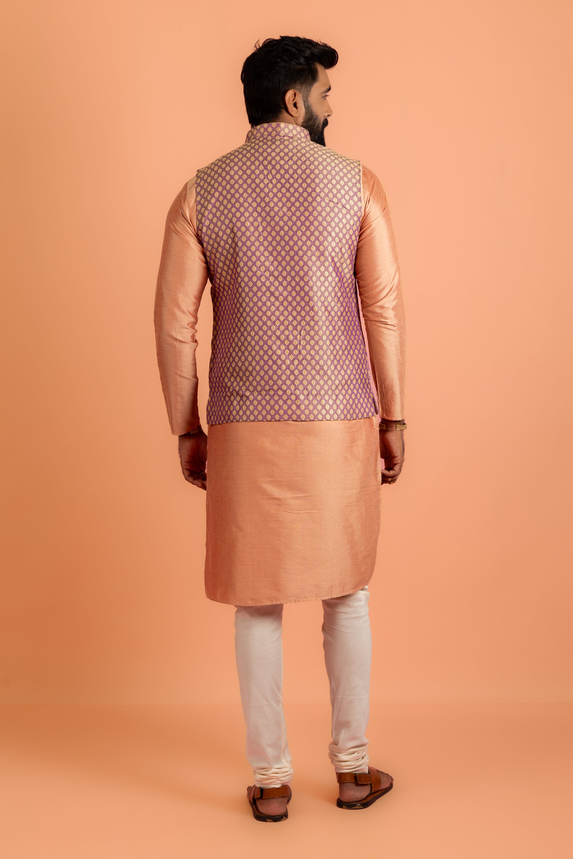 Men Purple Jacquard Kurta Jacket Churidar Set with Woven Design
