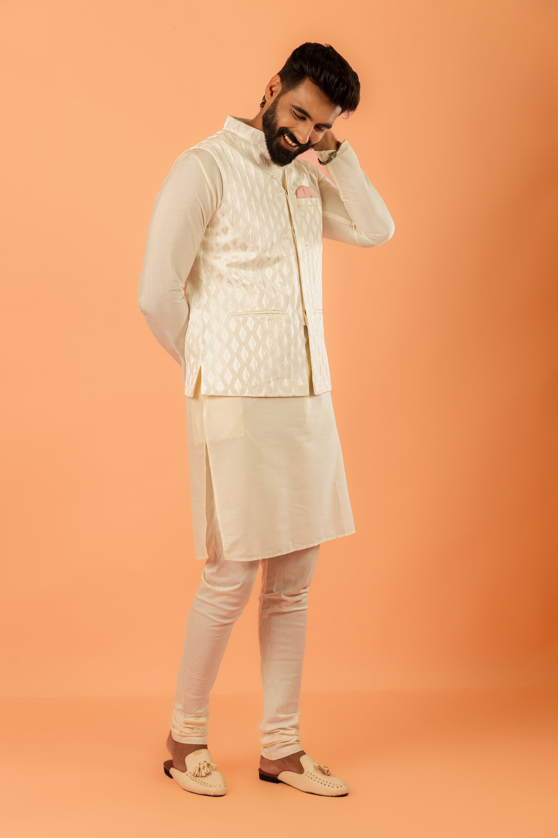 Elevate your style with this elegant White color Nehru Jacket. Made from a premium Silk Blend Fabric and Jacquard pattern, it offers unmatched comfort and sophistication. Perfect for any festive occasion.