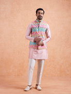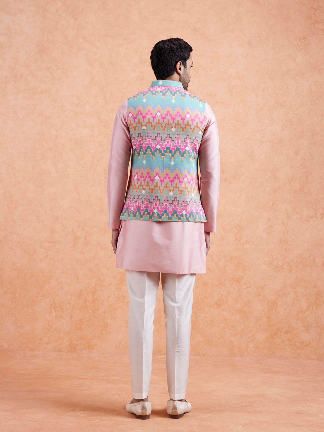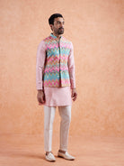 This multi-coloured cotton blend kurta, jacket, and trouser set features a printed design and regular fit. Perfect for casual or festive occasions, it offers a vibrant and comfortable look.