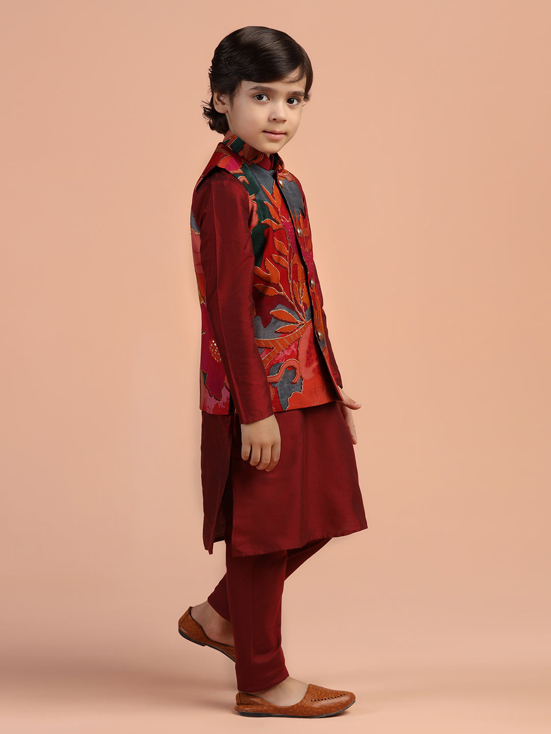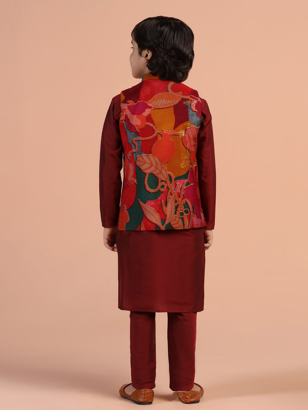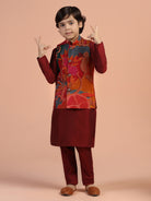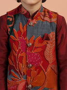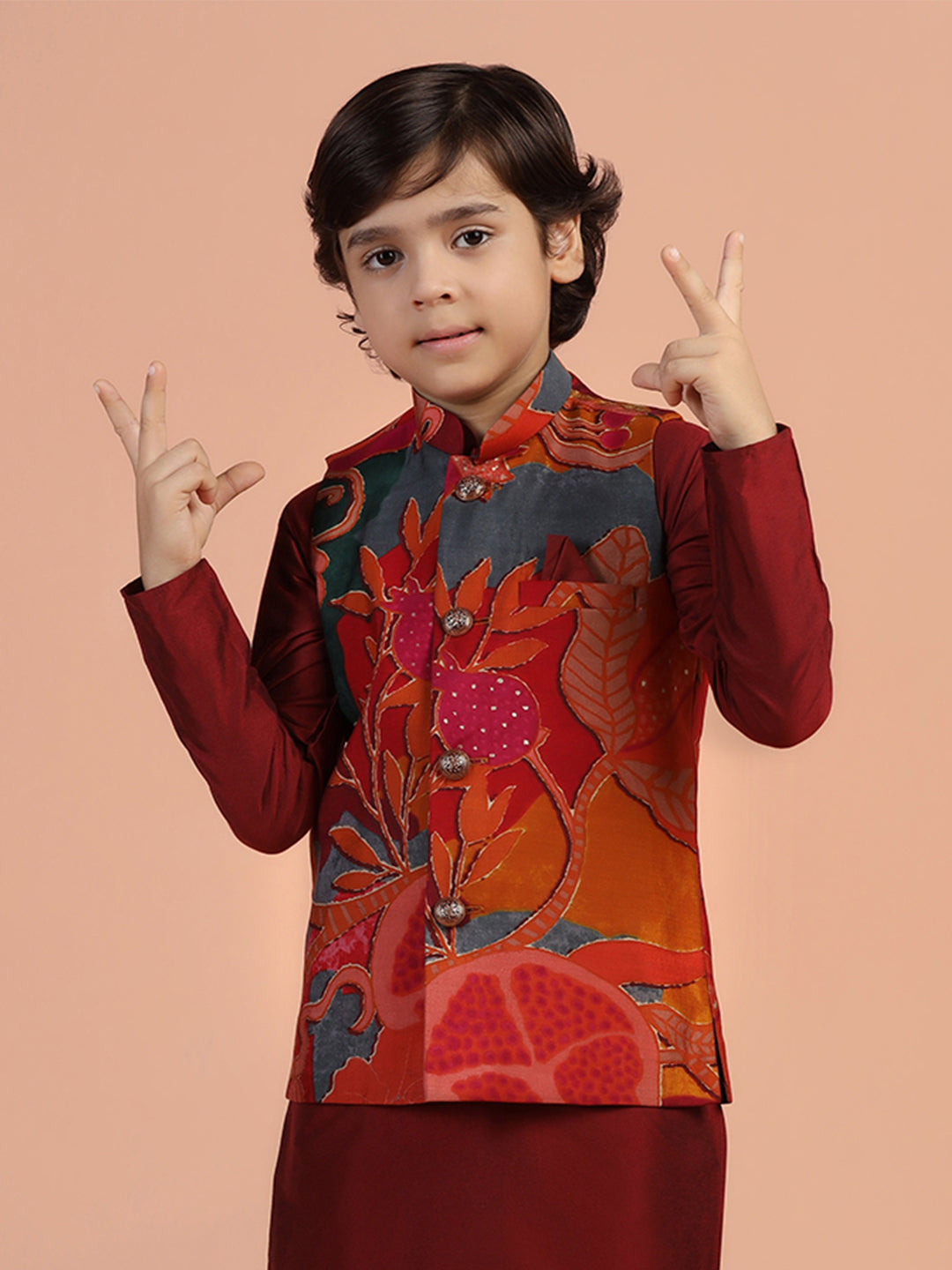 Multicolor printed art silk Nehru jacket for boys – perfect festive layering piece by Kisah Kids.