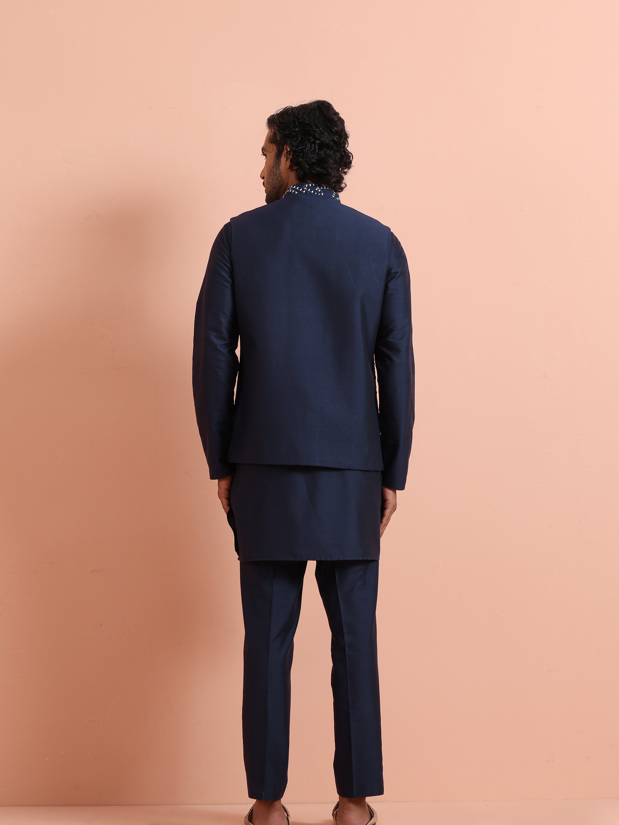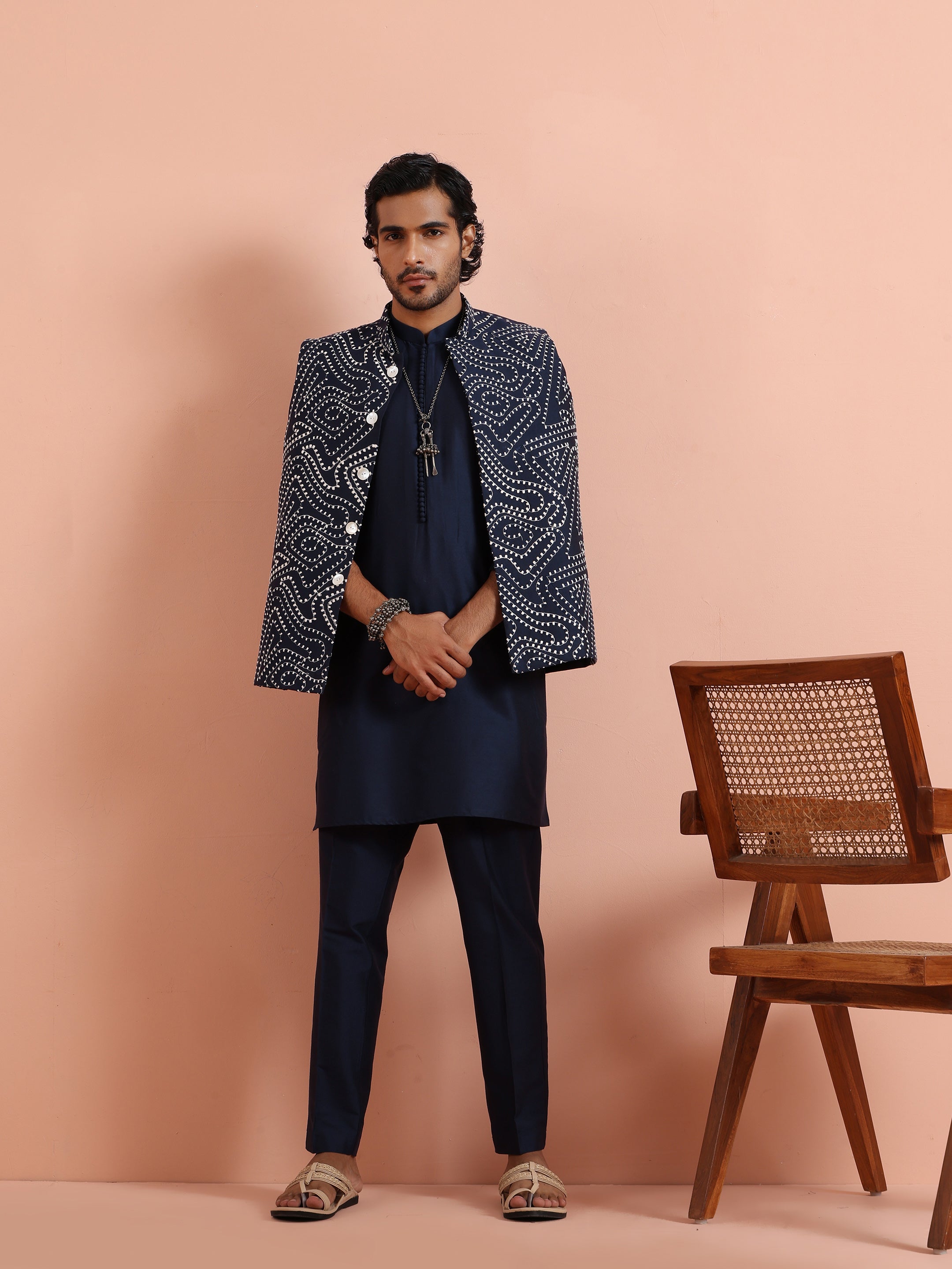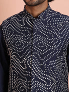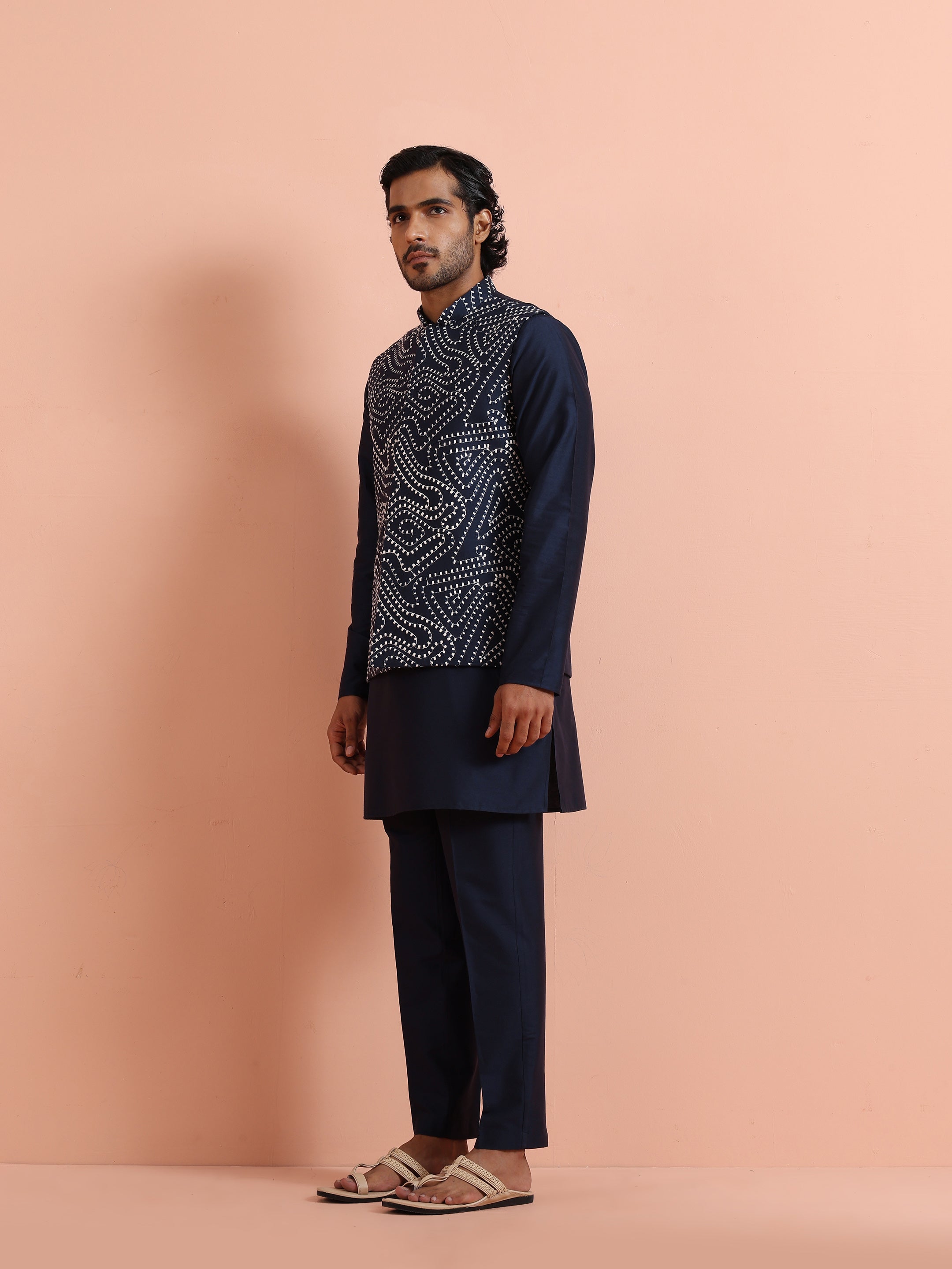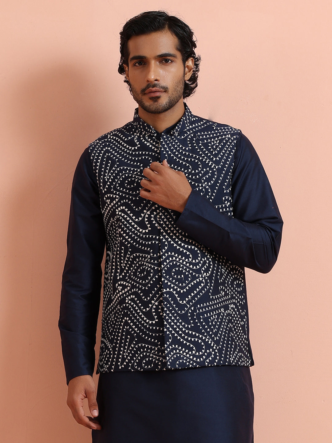 Nehru jacket showcases a bold abstract off-white print on a rich navy base. Featuring a mandarin collar, it offers a refined ethnic silhouette—perfect for festive occasions, weddings, and traditional celebrations with a modern touch.