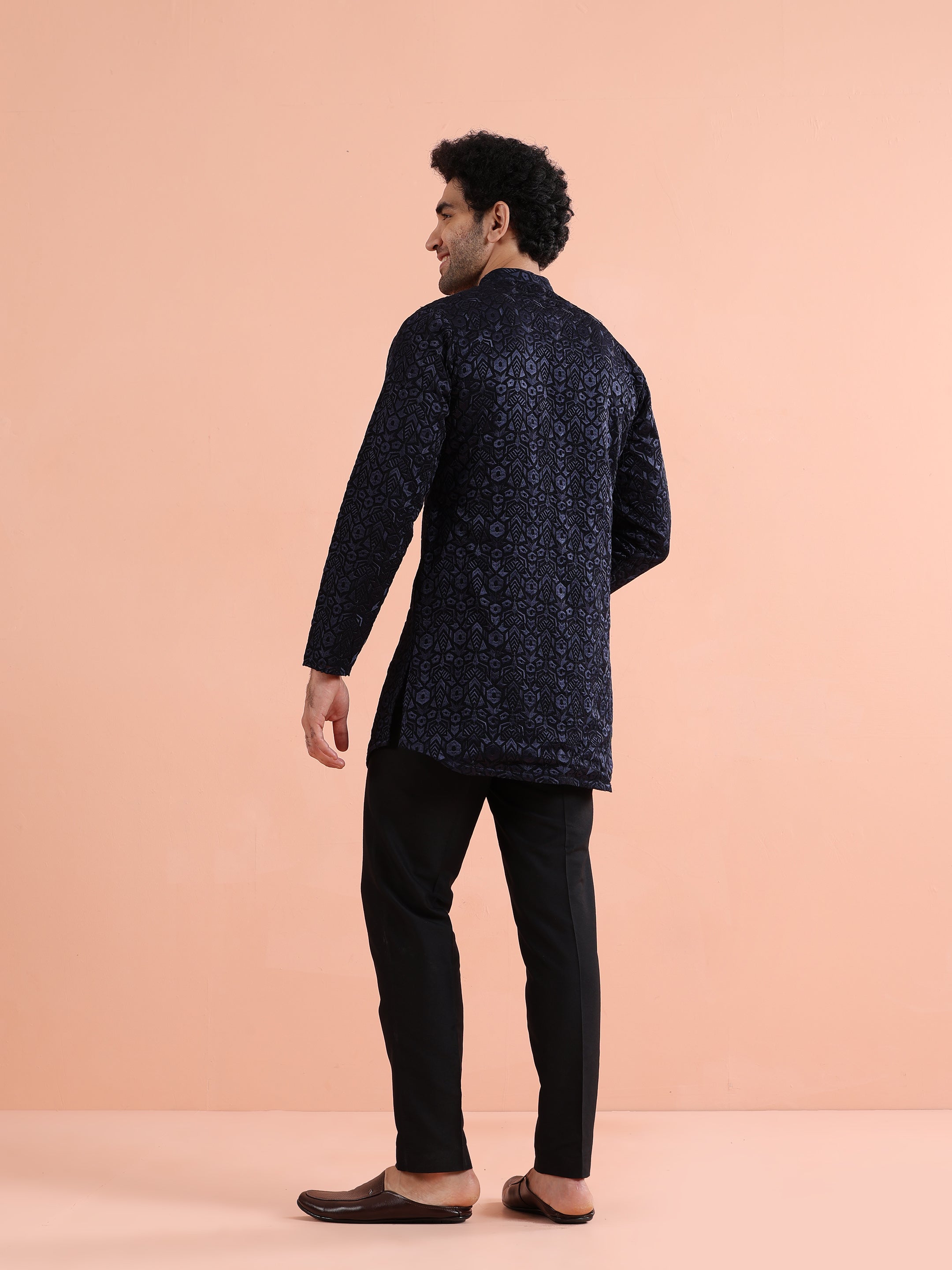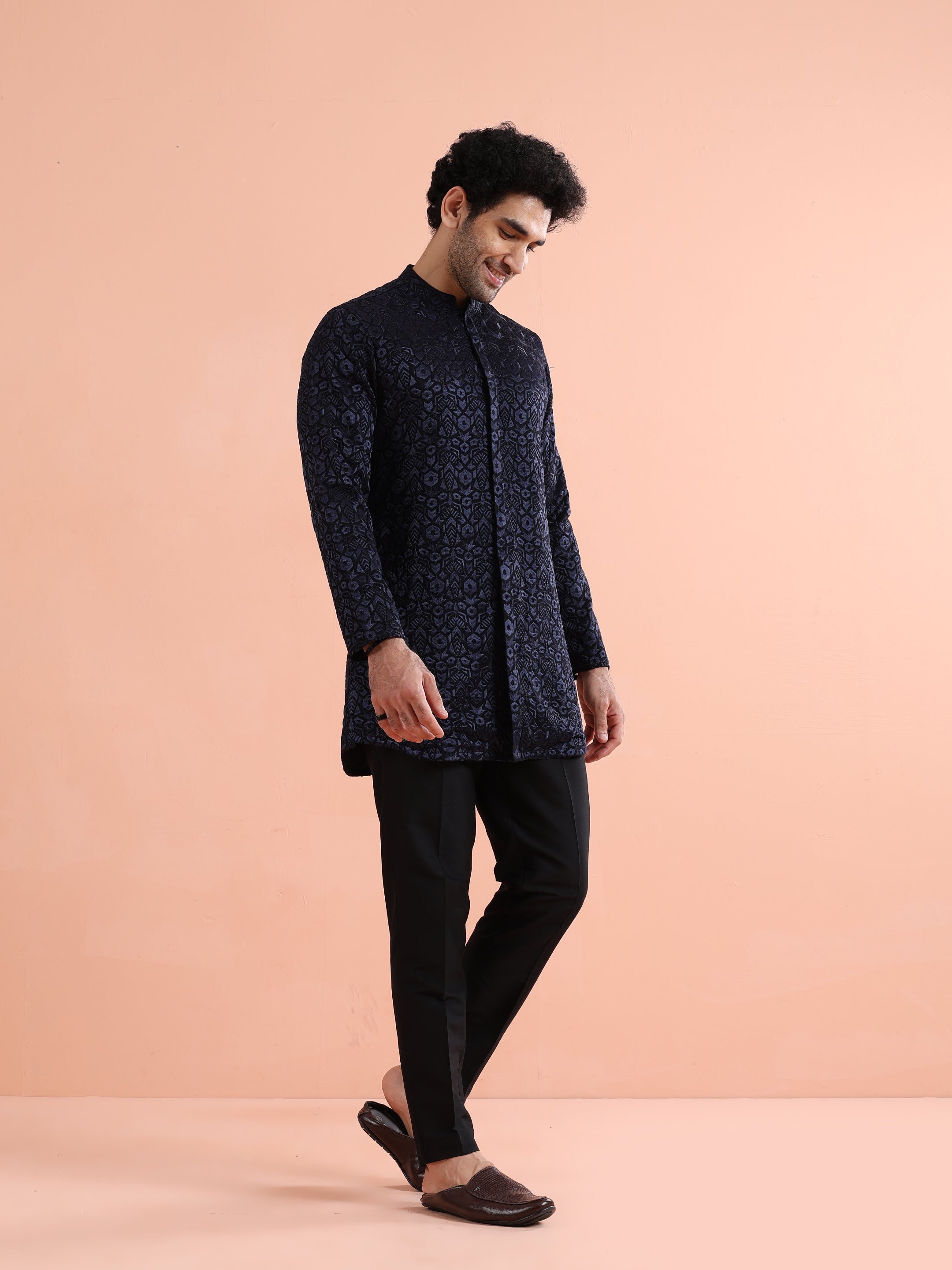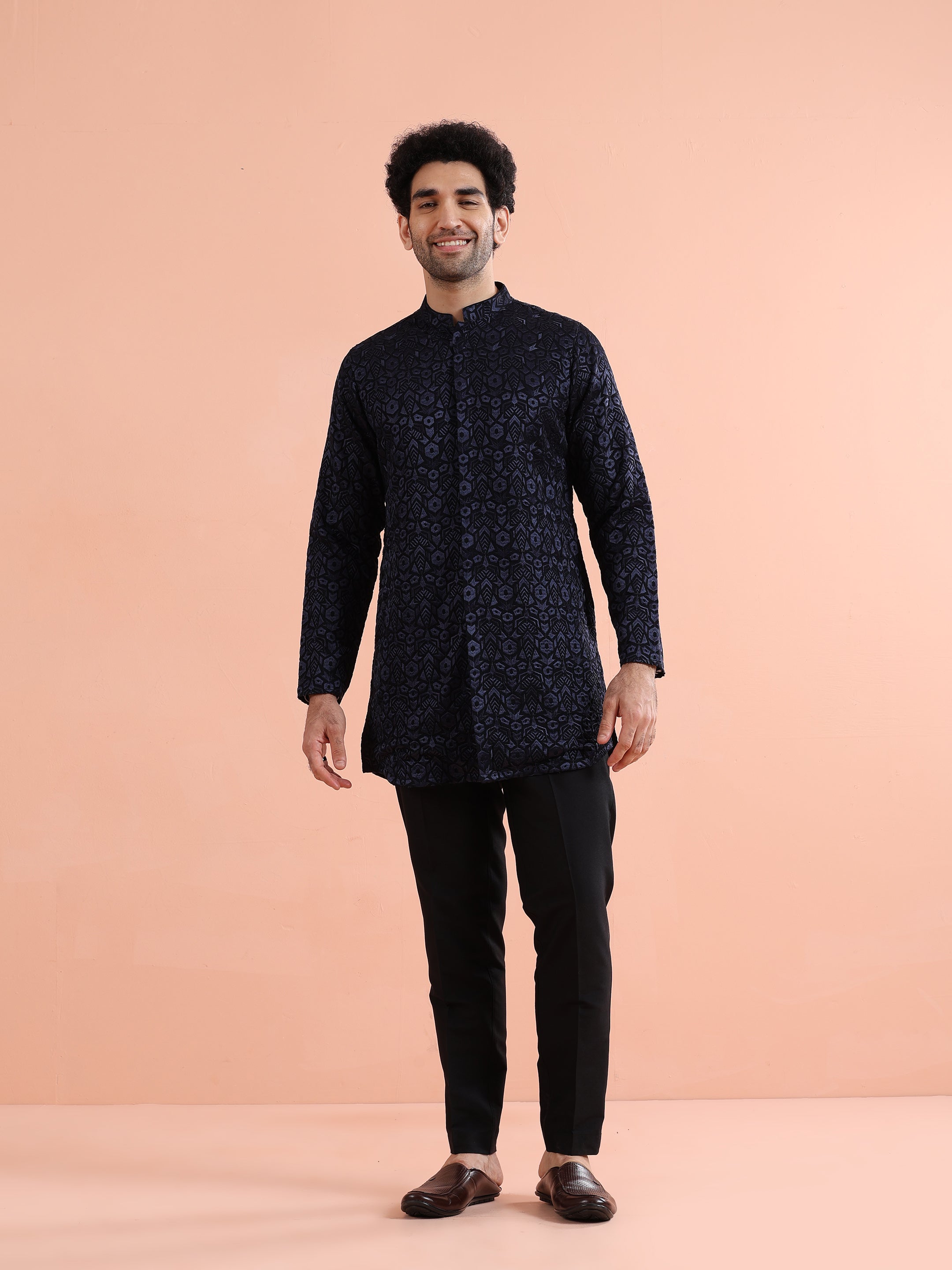 Navy blue velvet mid kurta with textured embroidery, mandarin collar, and side slits ideal for weddings, receptions, and festive evening wear.