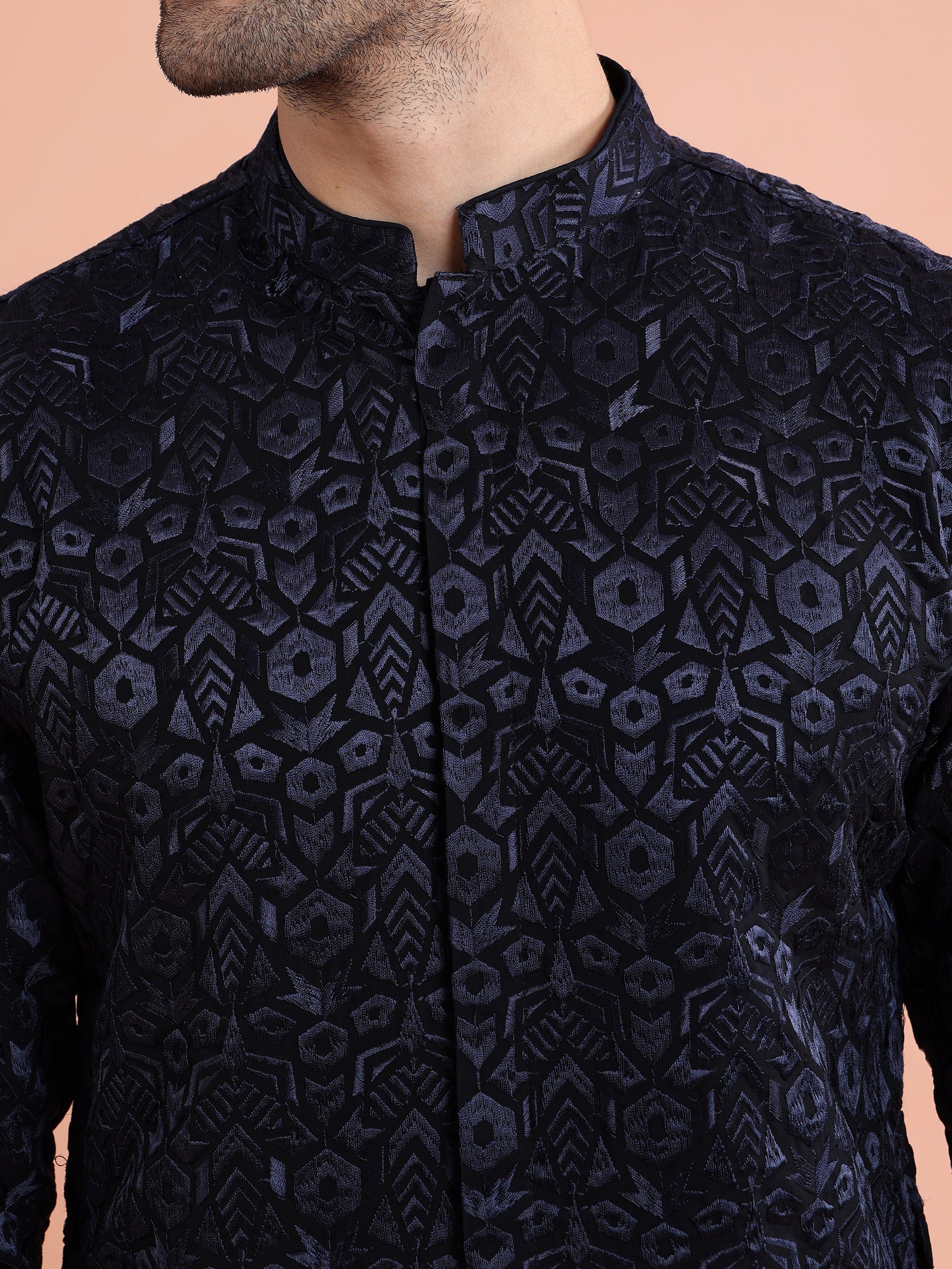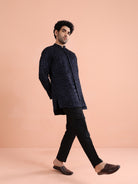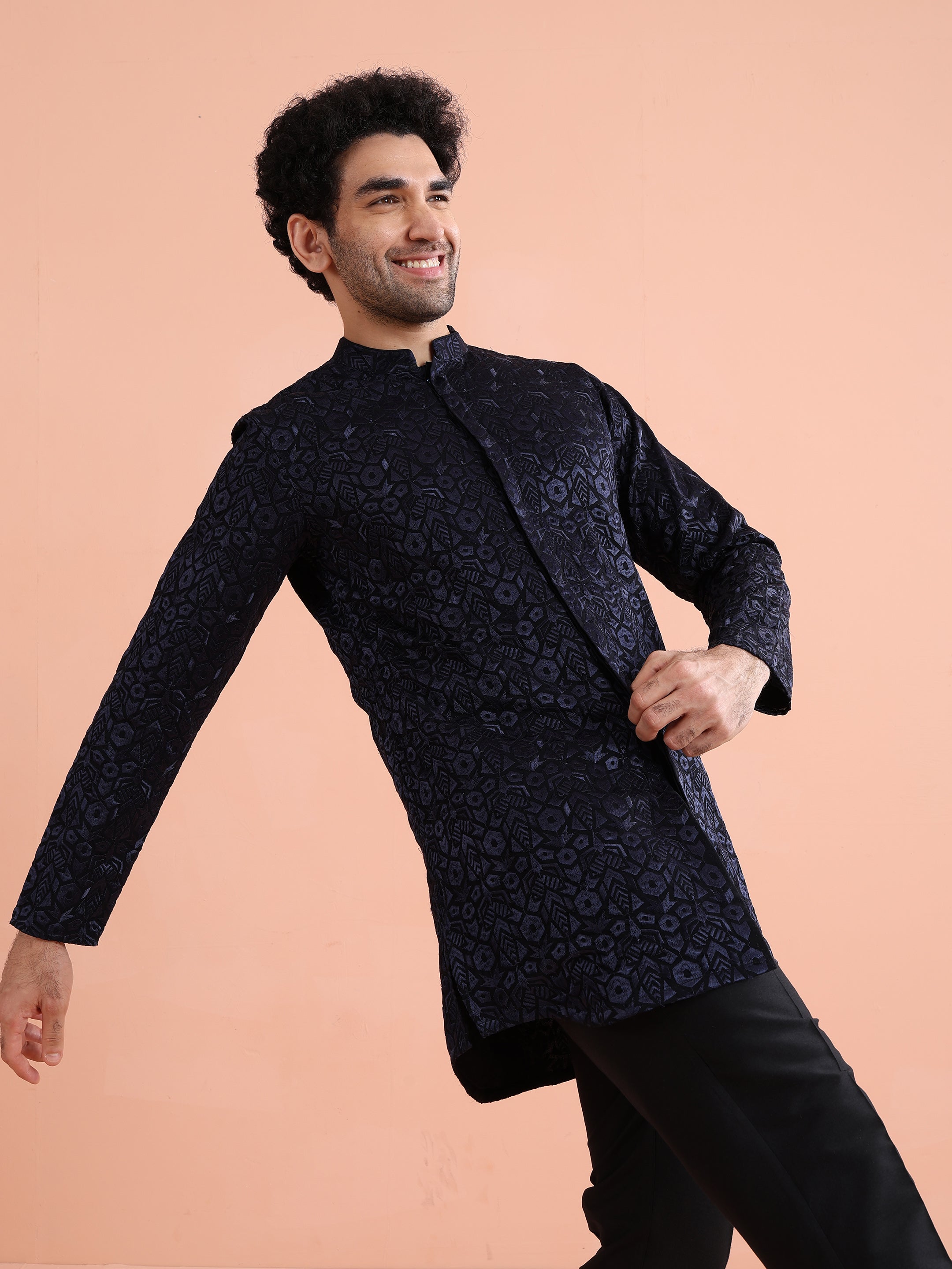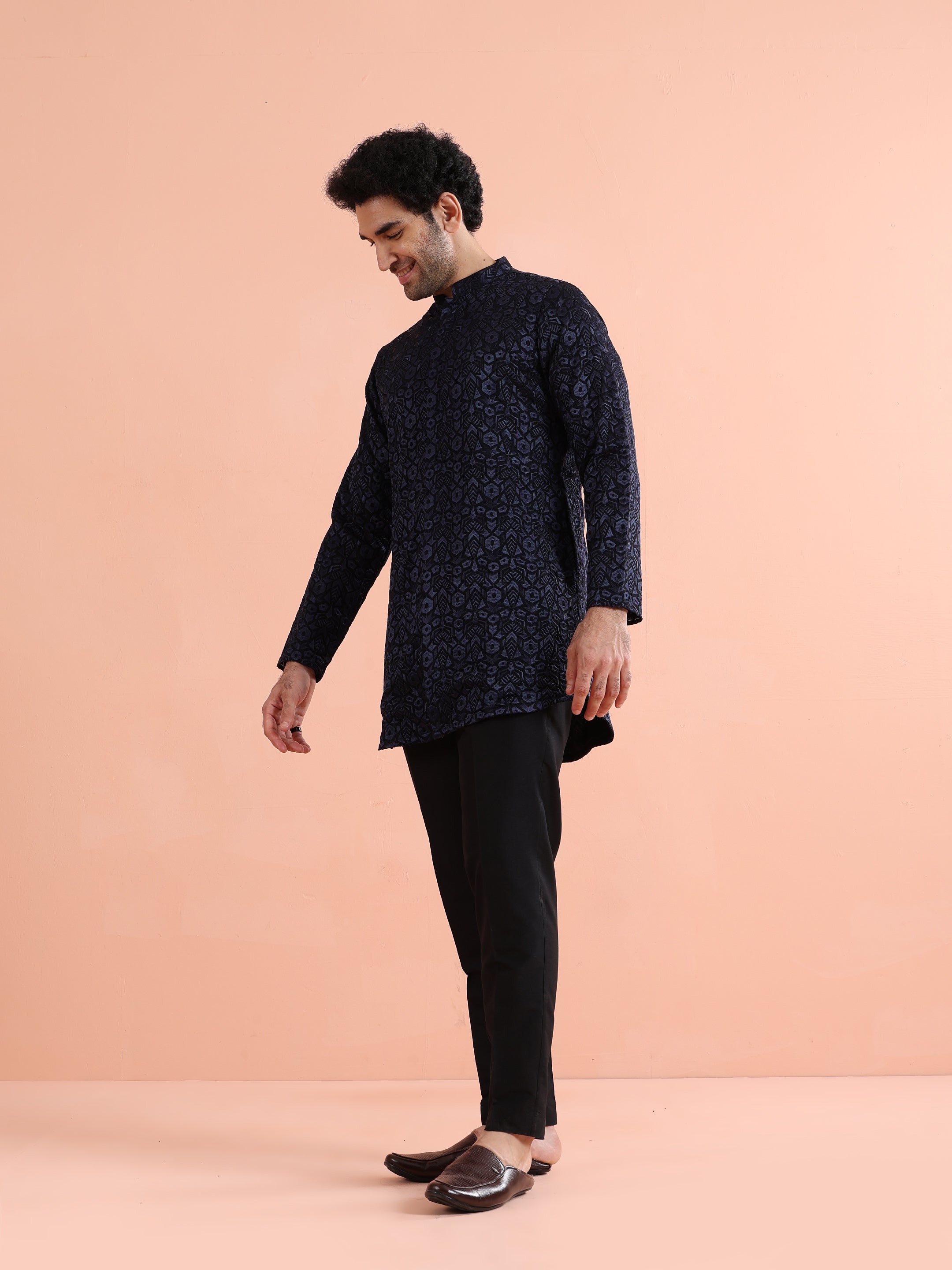 Navy blue velvet mid kurta with textured embroidery, mandarin collar, and side slits ideal for weddings, receptions, and festive evening wear.