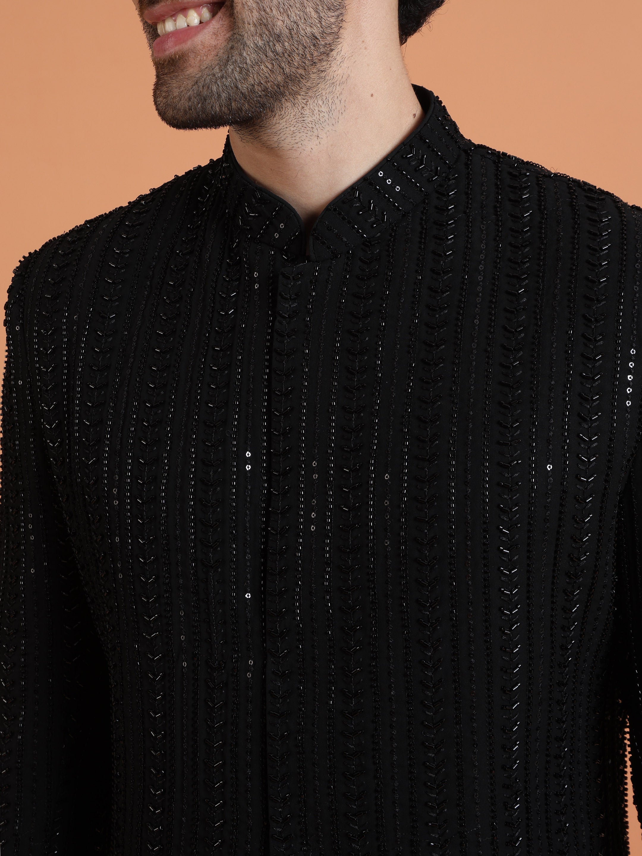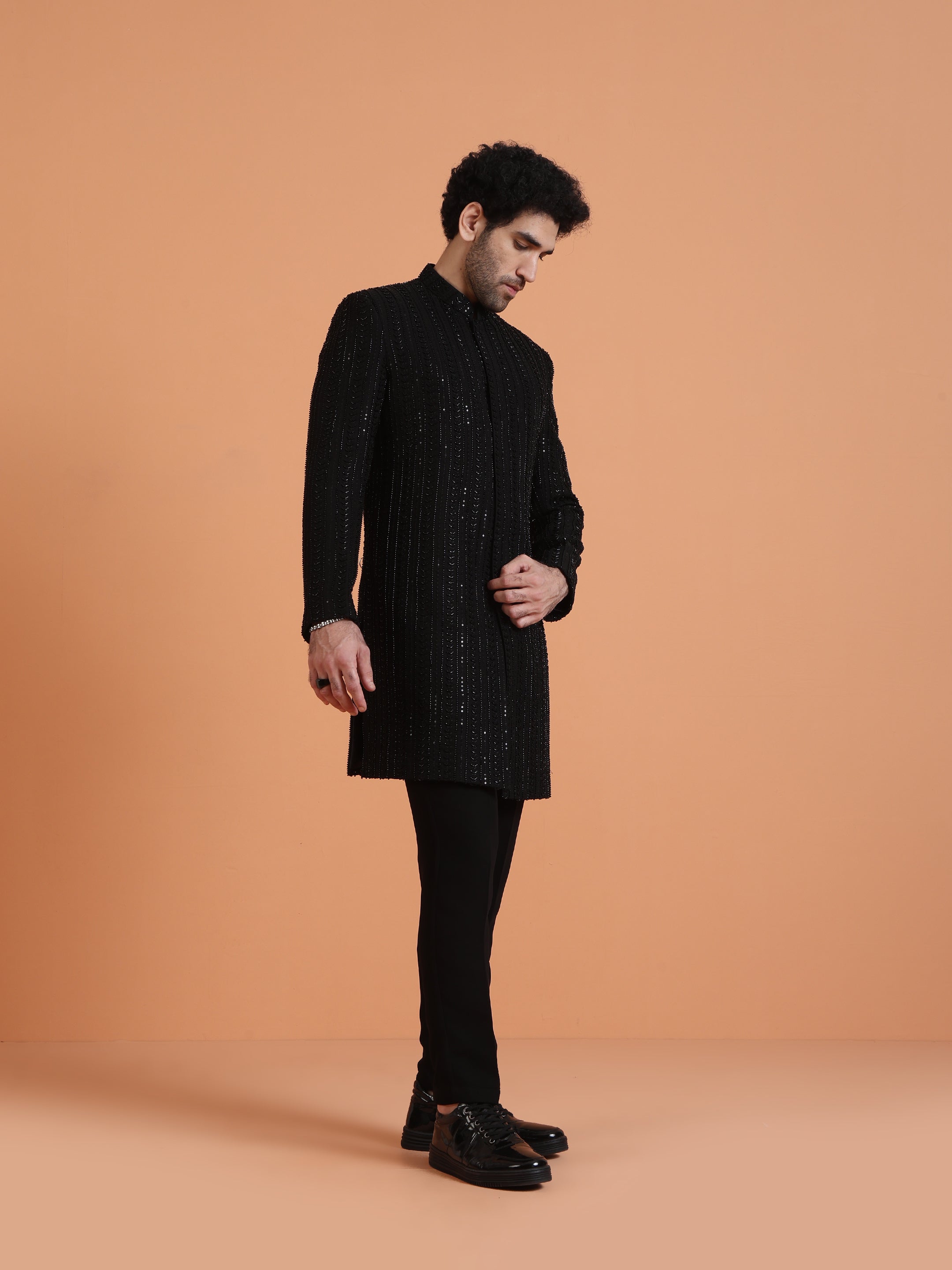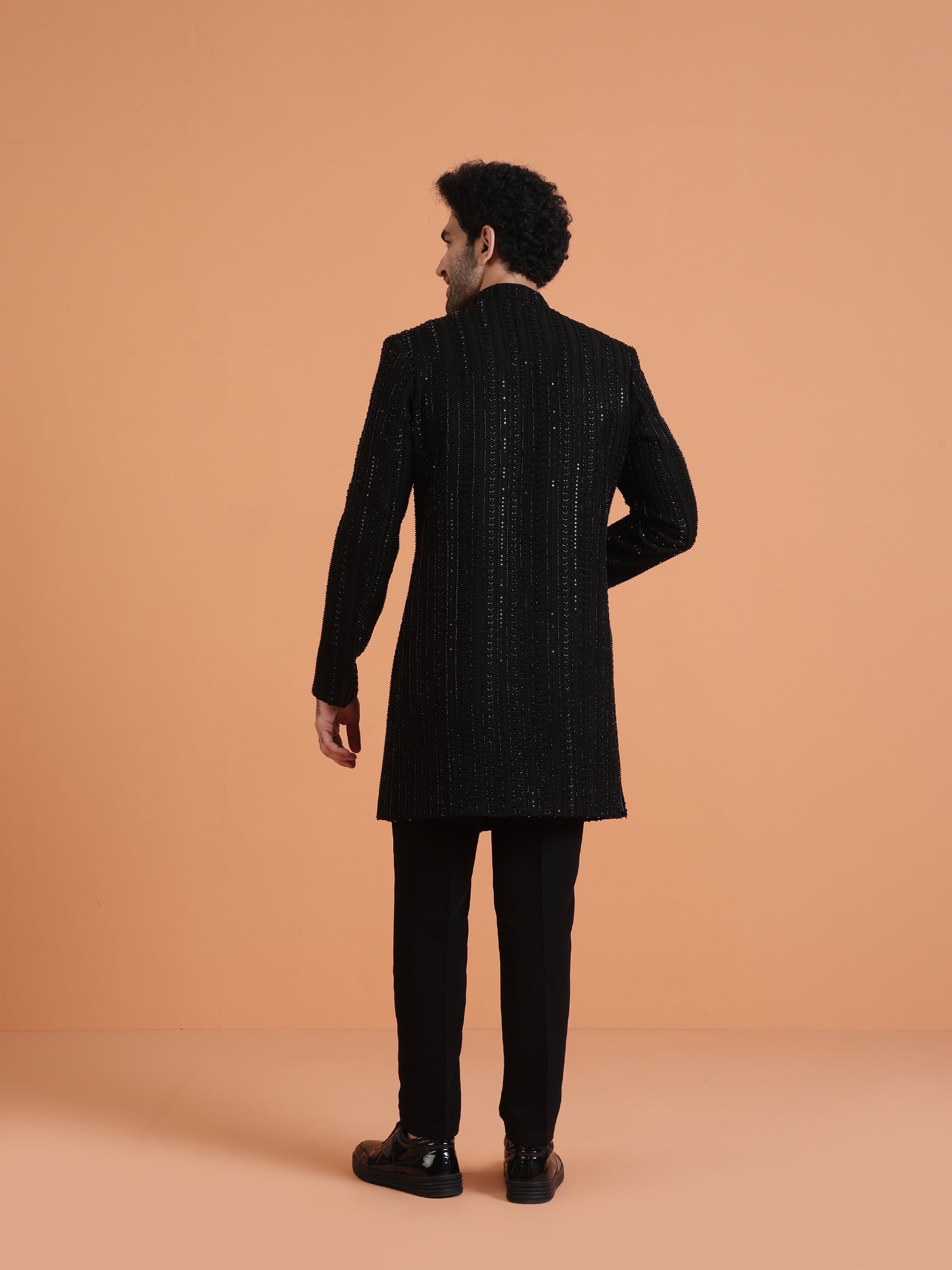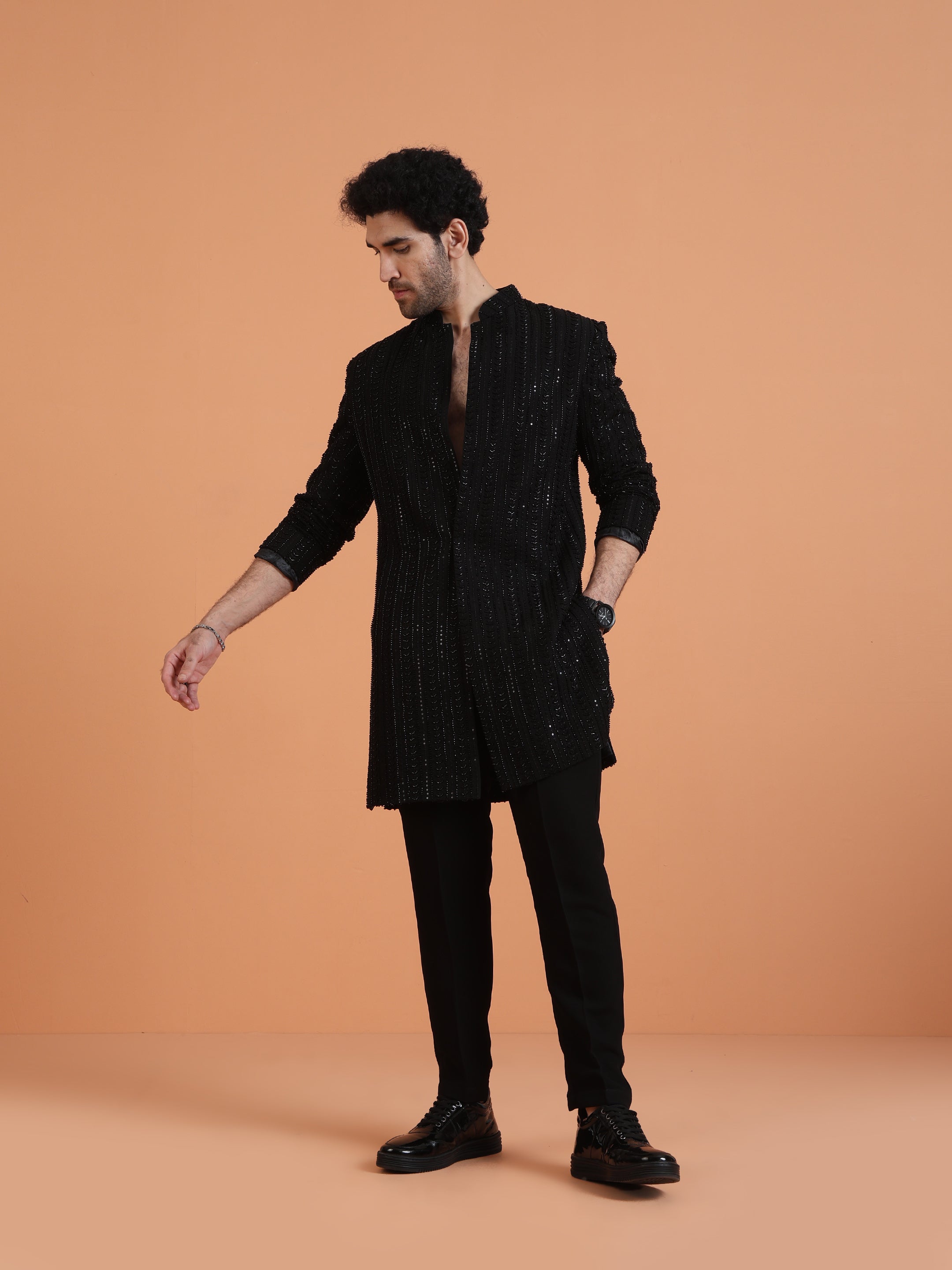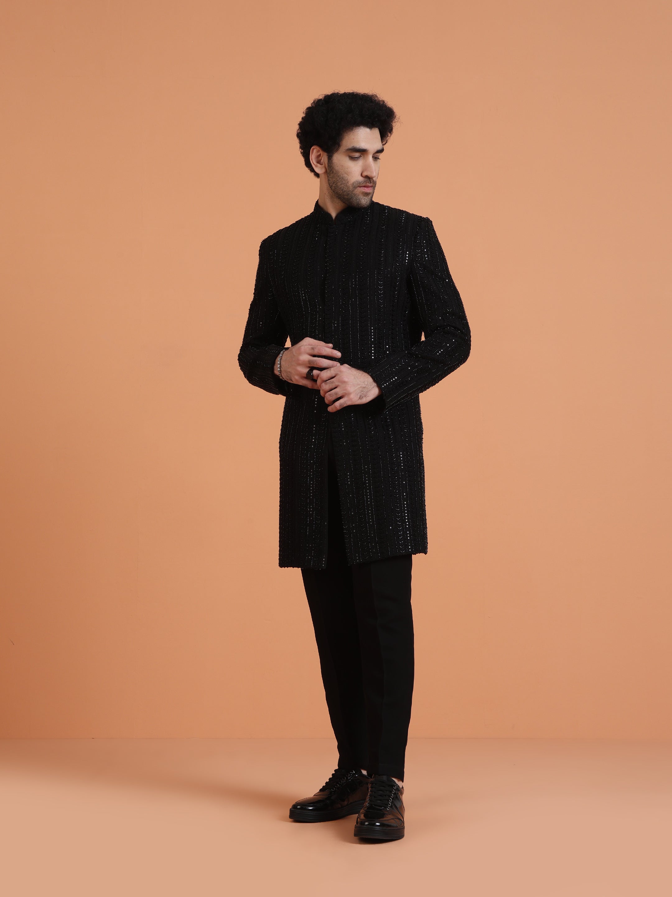 Black velvet blend sherwani with sequin embroidery and matching trouser. A modern Achkan/Jodhpuri set perfect for cocktail, sangeet, and wedding nights.
