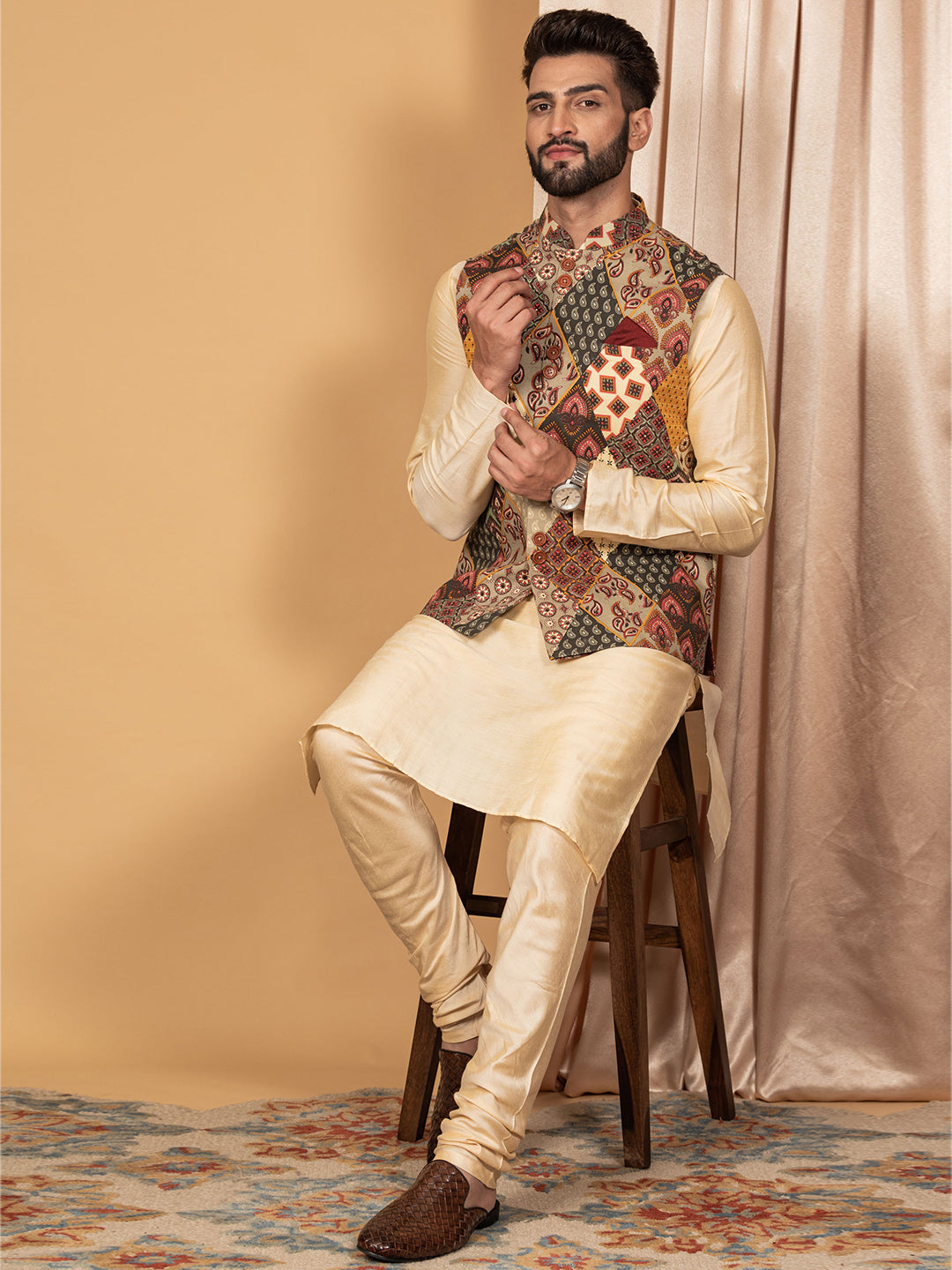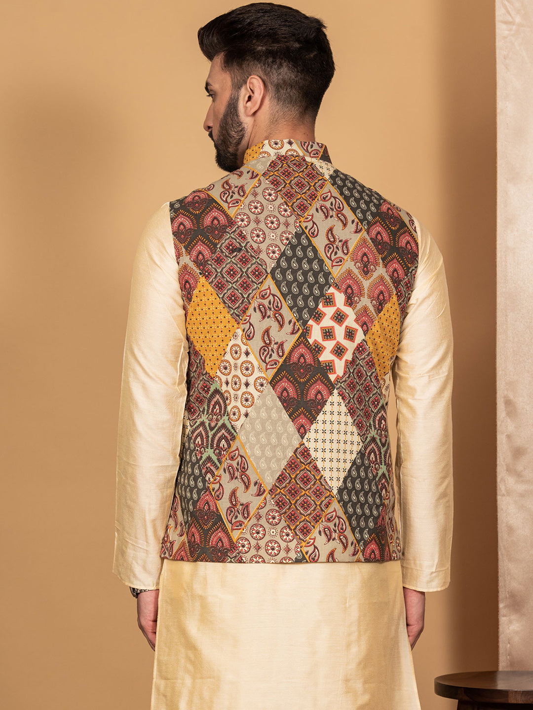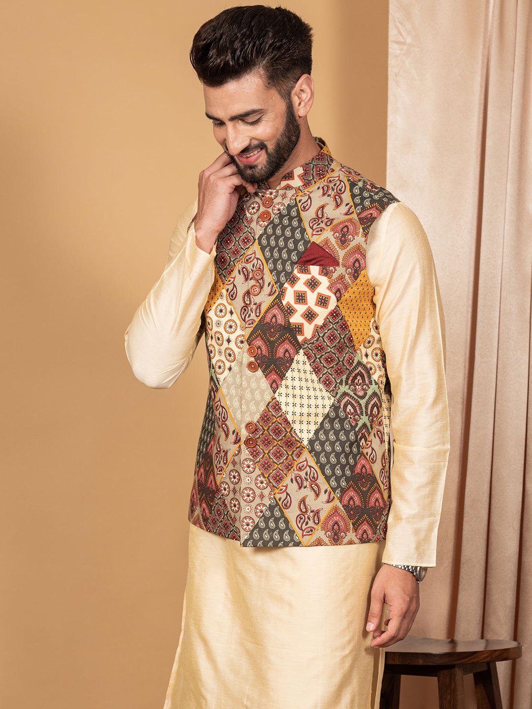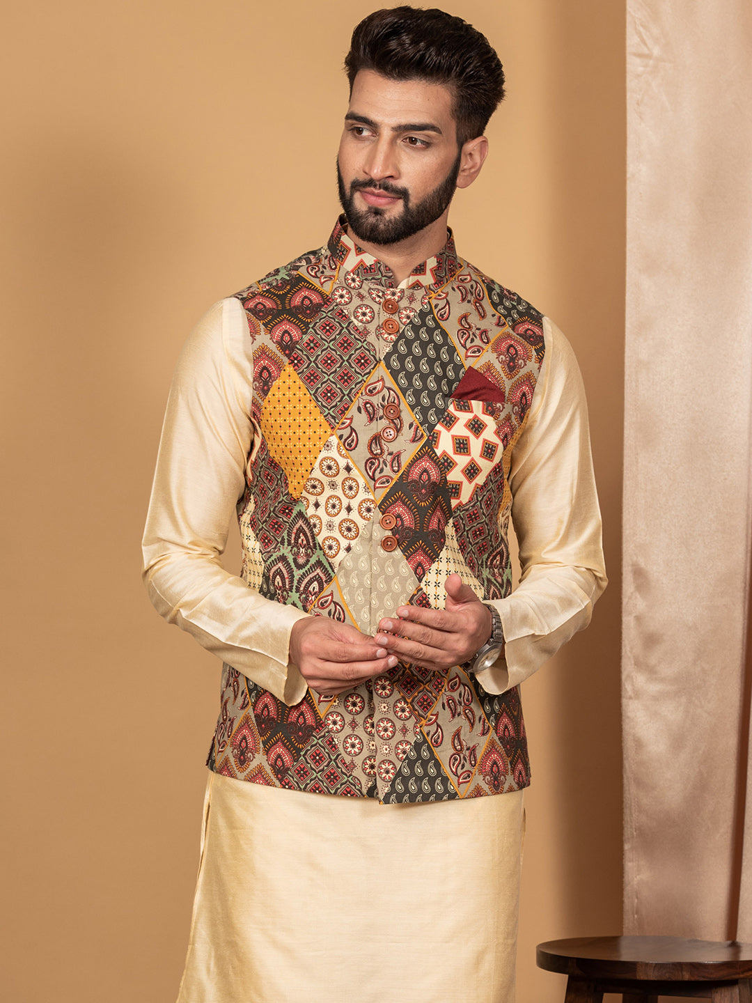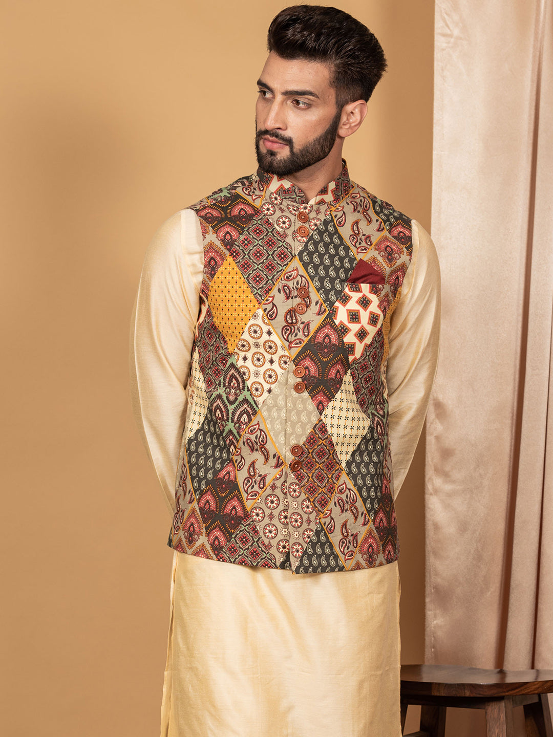 Give your festive wardrobe the creative edge it deserves with this Multi-Coloured Cotton Blend Jacket! Featuring a unique printed design and a comfortable regular fit, it’s a stylish game-changer for your collection. Whether you're layering it over a kurta for a wedding or a festive gathering, this jacket is sure to get you some compliments along the way.