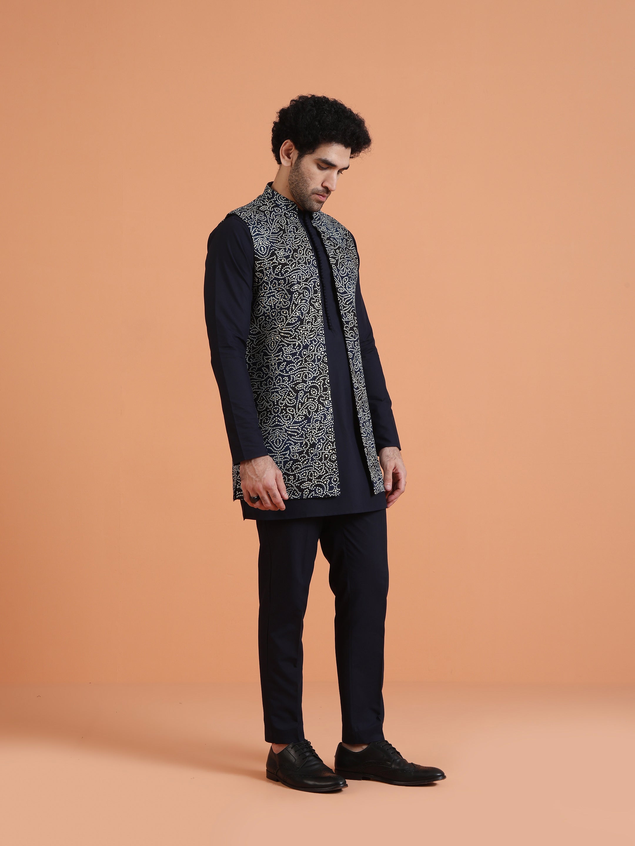 Navy blue long jacket with mirror work, paired with mid kurta and trouser. Modern Indo-western set in cotton silk blend for weddings & festive wear.