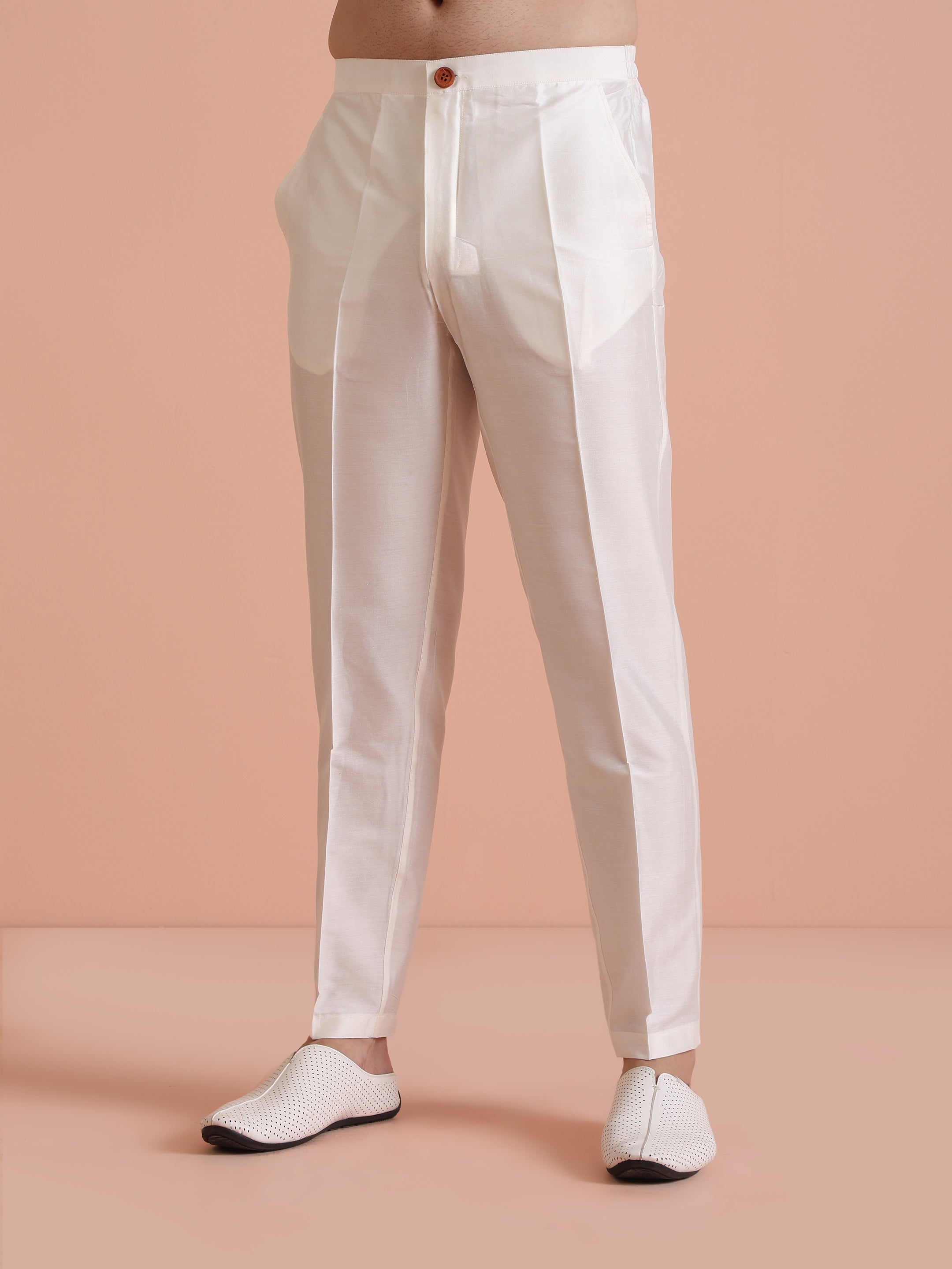 Cream jacquard poly silk kurta trouser set for men. Elegant and comfortable festive wear with subtle self-pattern texture.