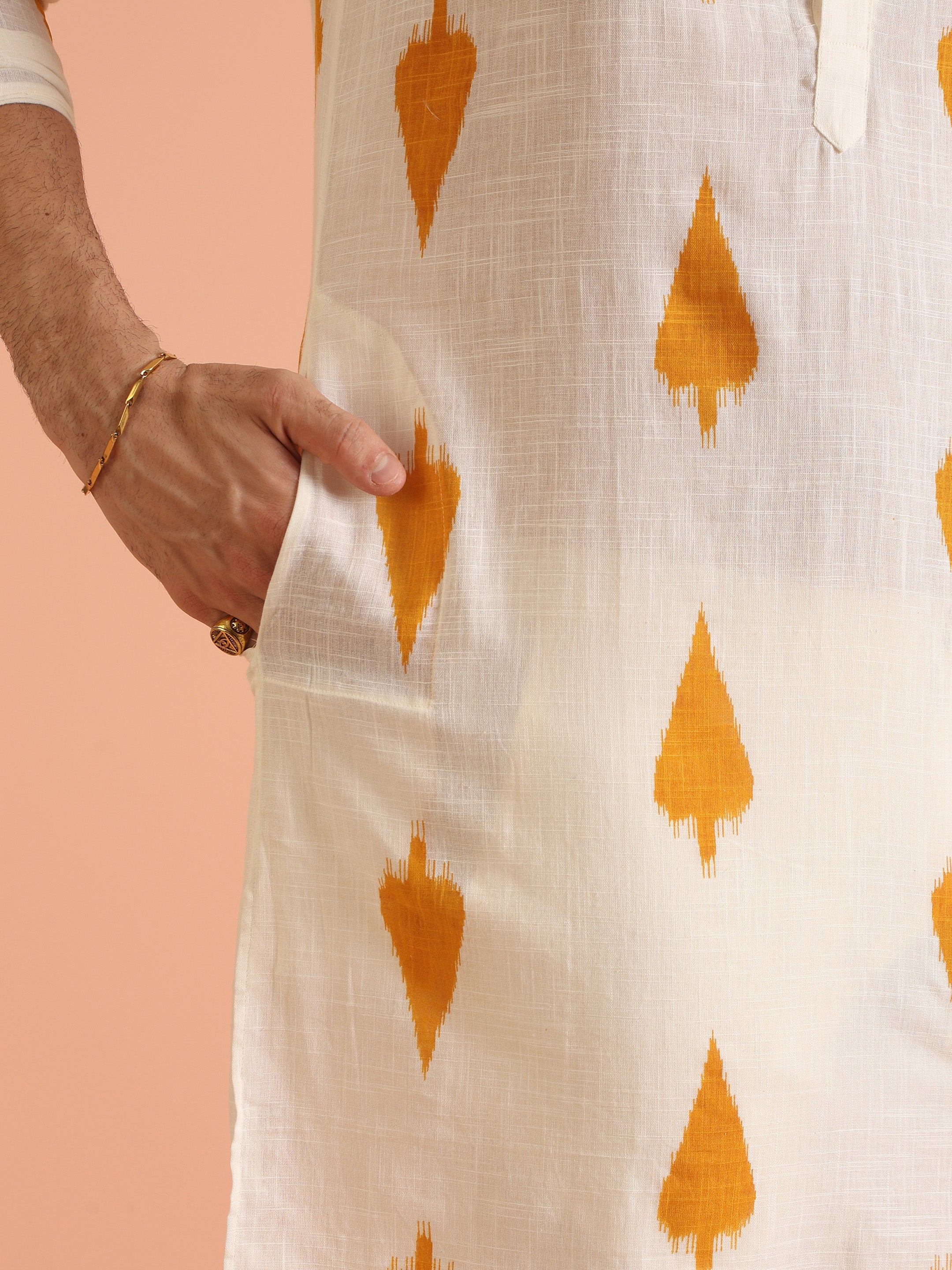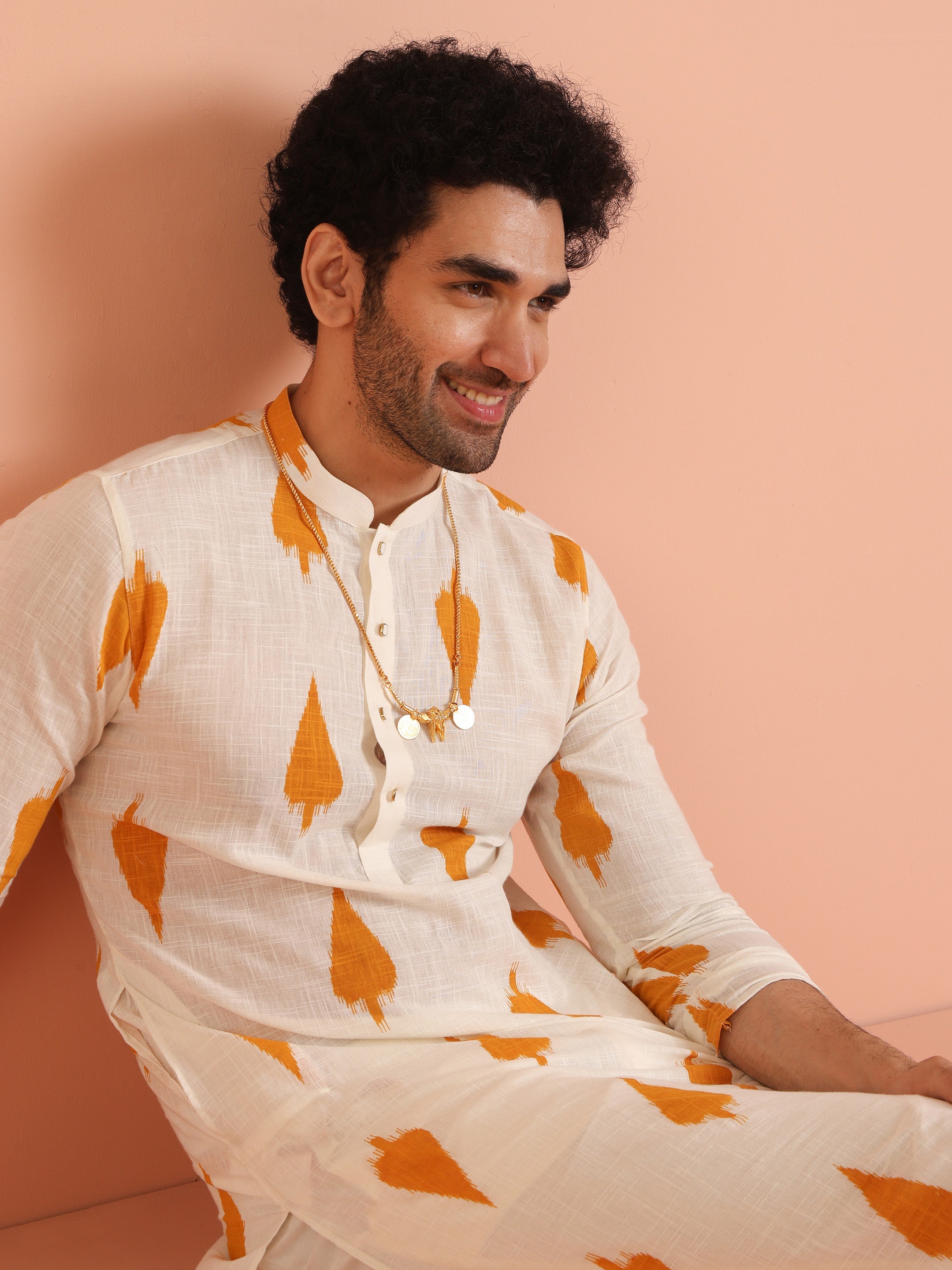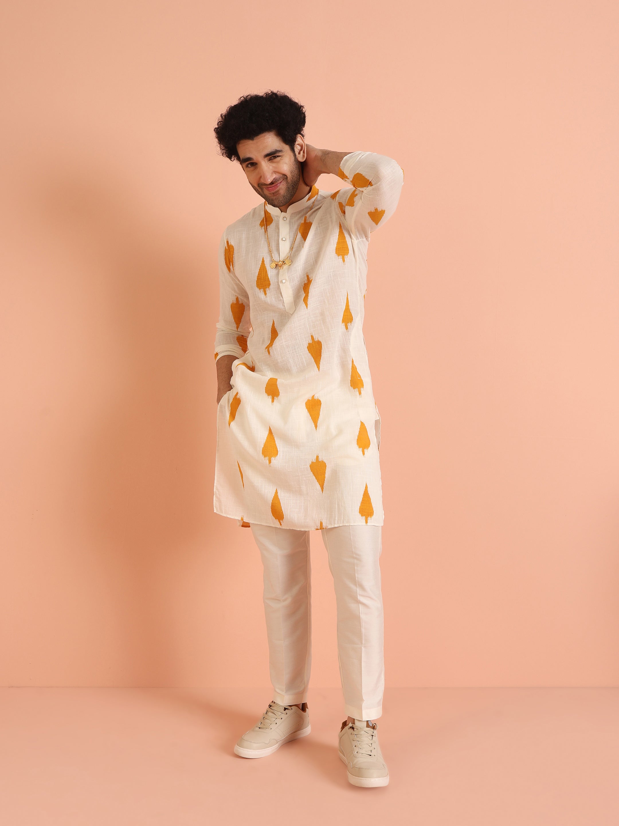 White Cotton Kurta Set with Mustard Ikat-Inspired Prints and Cream Trousers – Festive & Wedding Ensemble