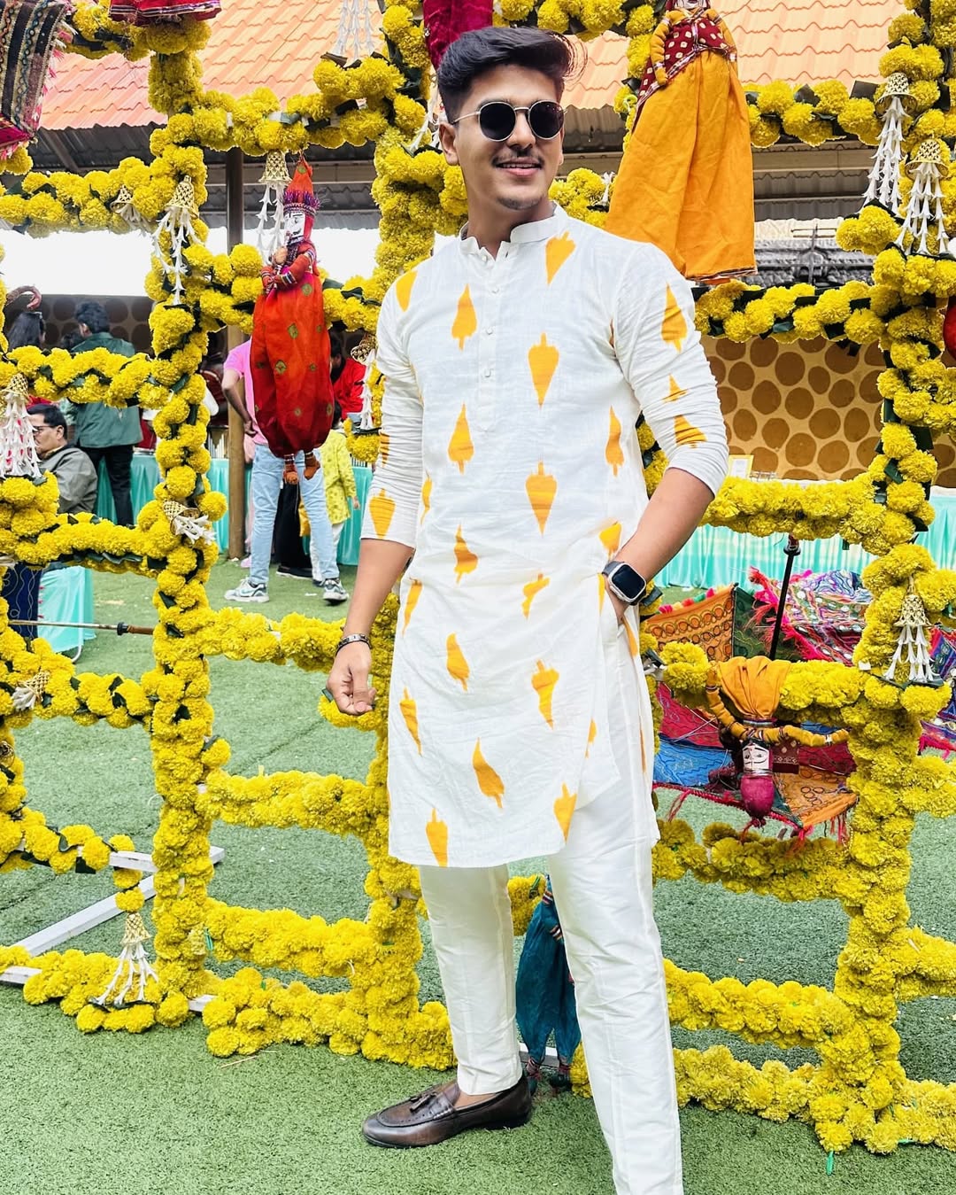 Kisah white cotton kurta set with mustard ikat-inspired prints and cream trousers, a perfect festive choice for haldi, mehendi, pujas, and cultural events.