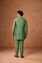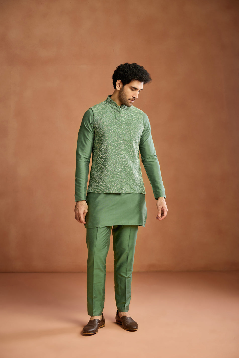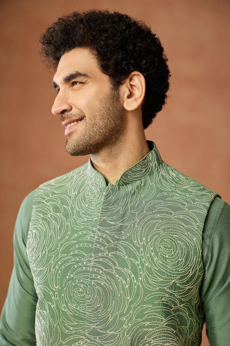 Kisah Menss green silk blend Nehru jacket with circular embroidered motifs. A festive and wedding layering piece, perfect for kurta sets and celebrations.