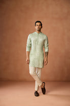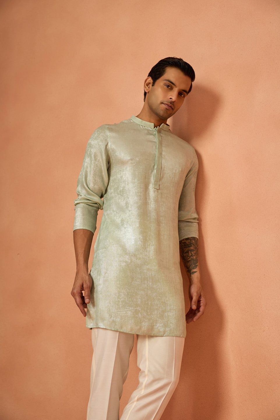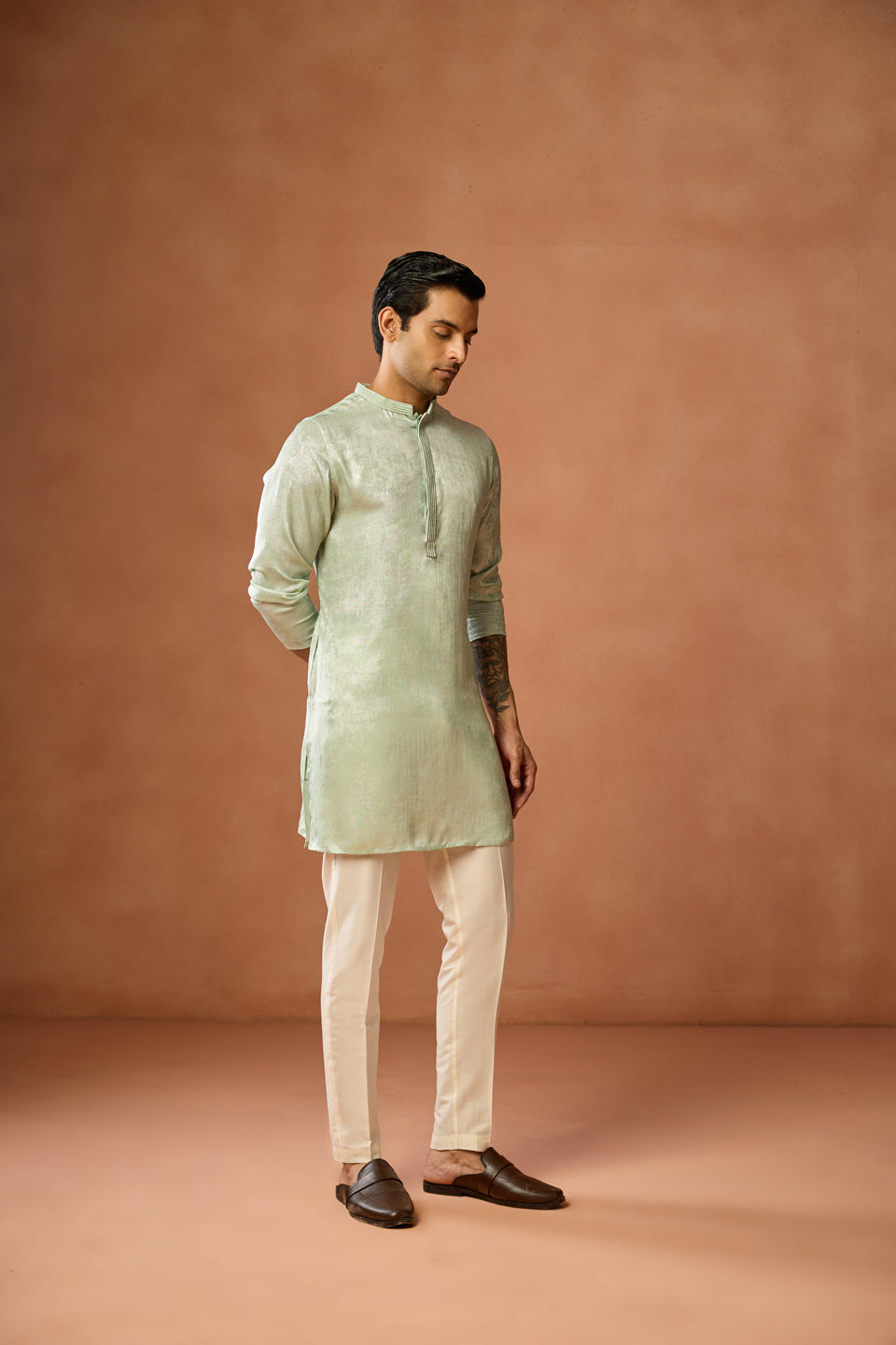 Kisah Menss mint green silk blend mid kurta with shimmer finish and mandarin collar. Perfect festive wear for weddings, puja, and traditional celebrations.