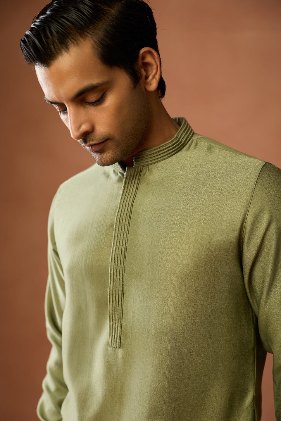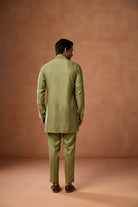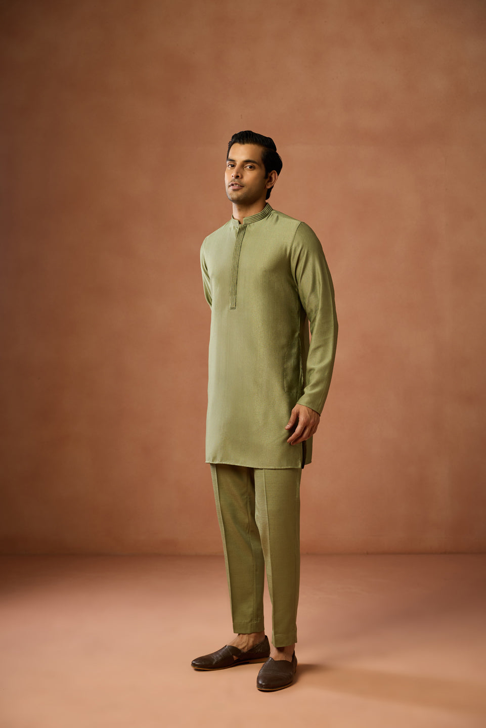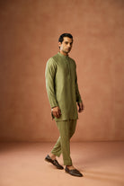 Kisah olive green silk blend mid kurta with slim trousers. Minimal yet stylish kurta trouser set perfect for weddings, puja, and festive occasions.