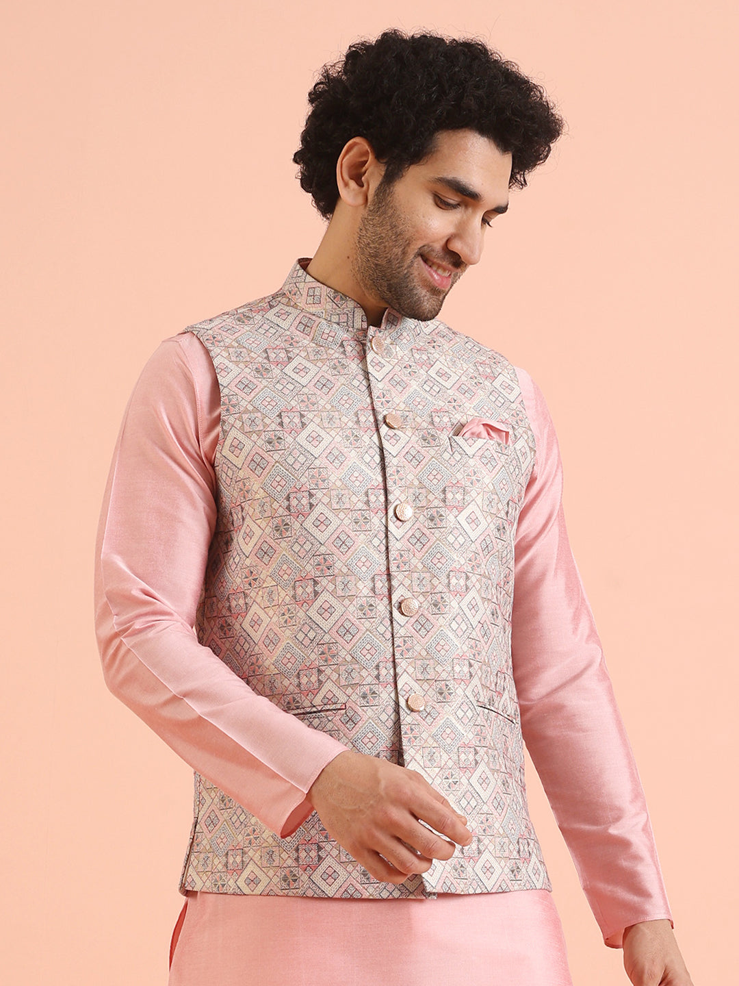 Experience classic elegance with this Men Multi Jacquard Geometric Nehru Jacket. The Jacquard Pattern adds a refined touch, while the breathable Silk Blend fabric ensures comfort throughout the day. Ideal for festive events or casual wear, this Nehru Jacket is a wardrobe essential..