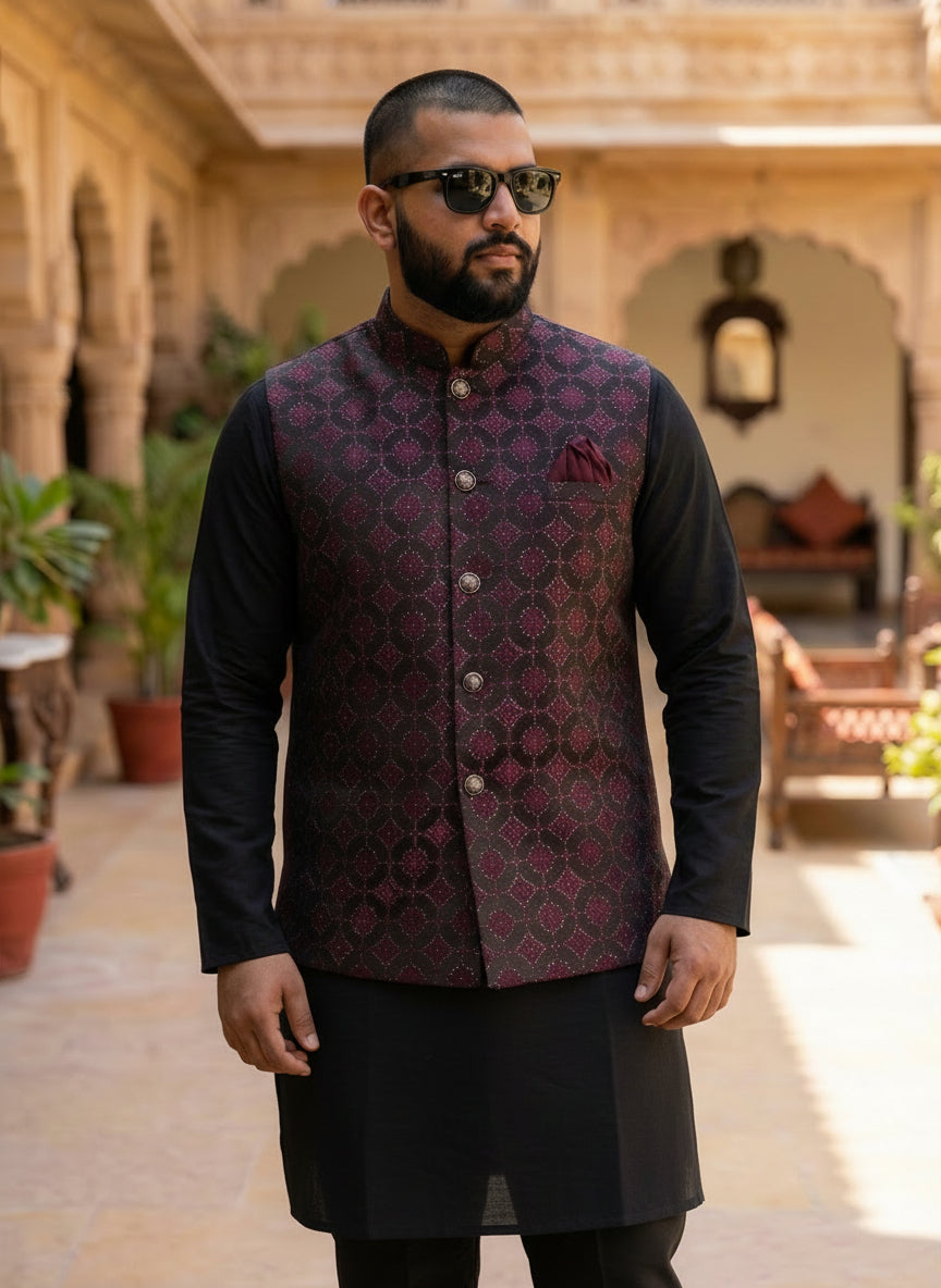 Kisah men’s black & maroon cotton silk Nehru jacket with woven motifs and metallic buttons. Perfect festive layer for weddings and receptions.