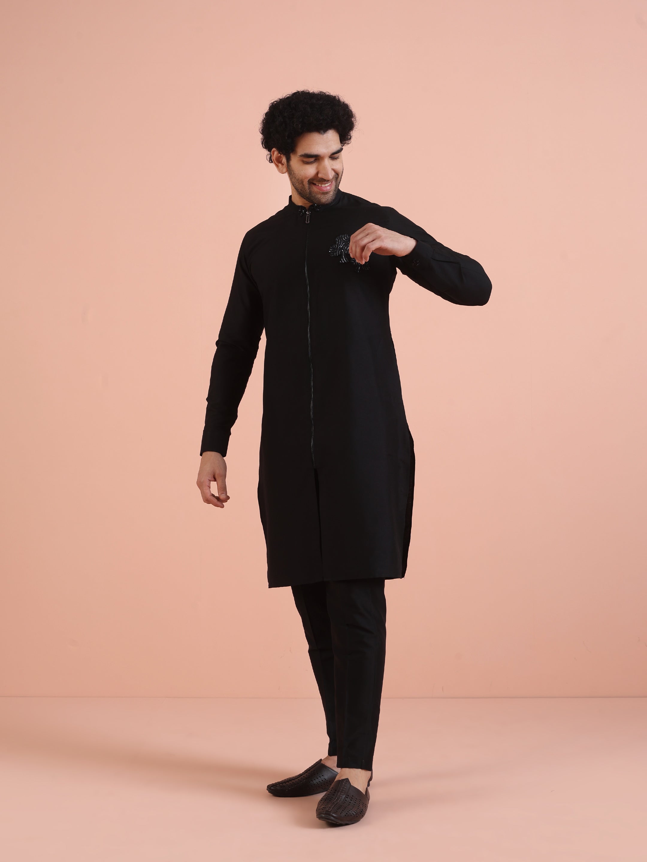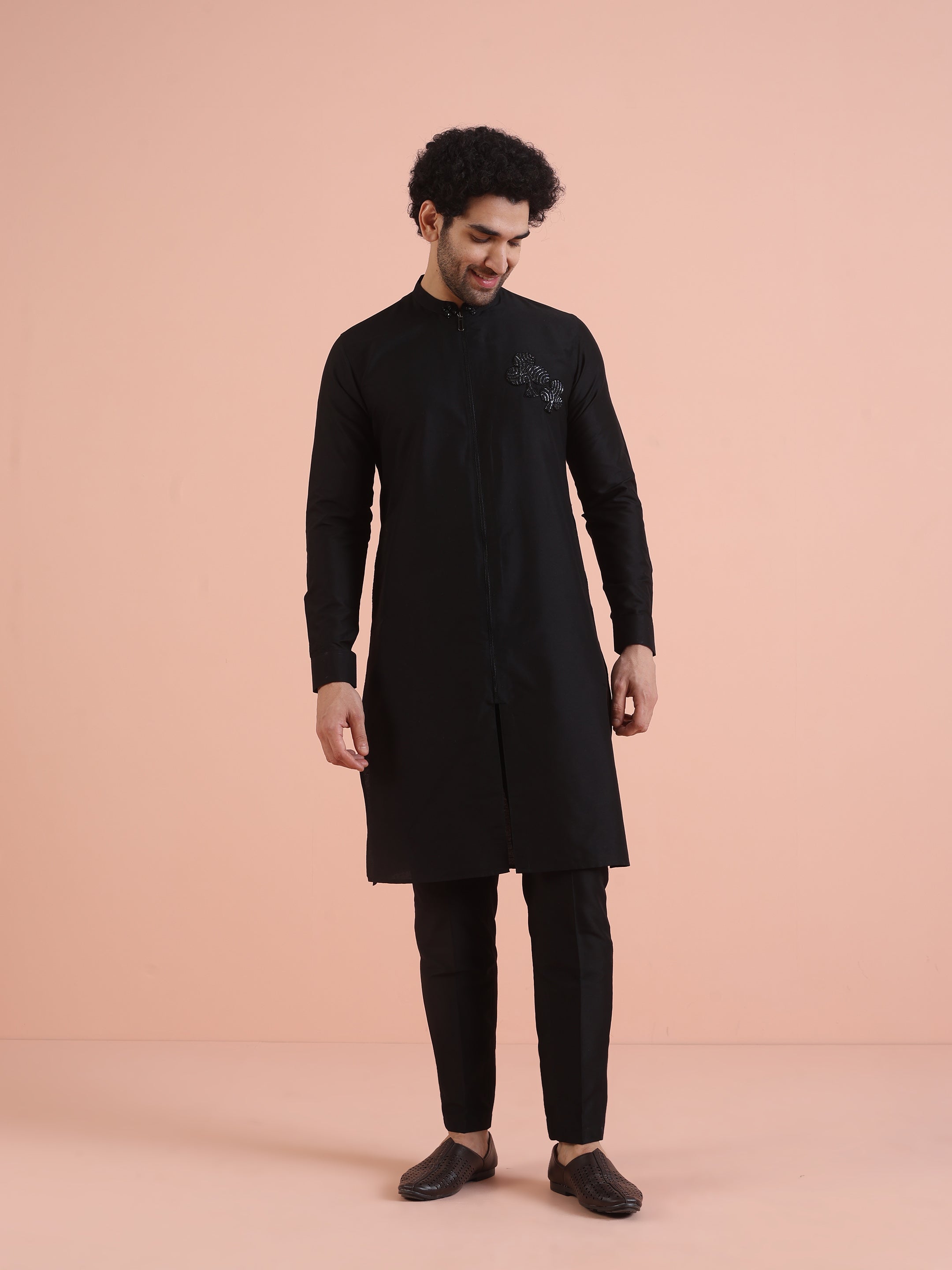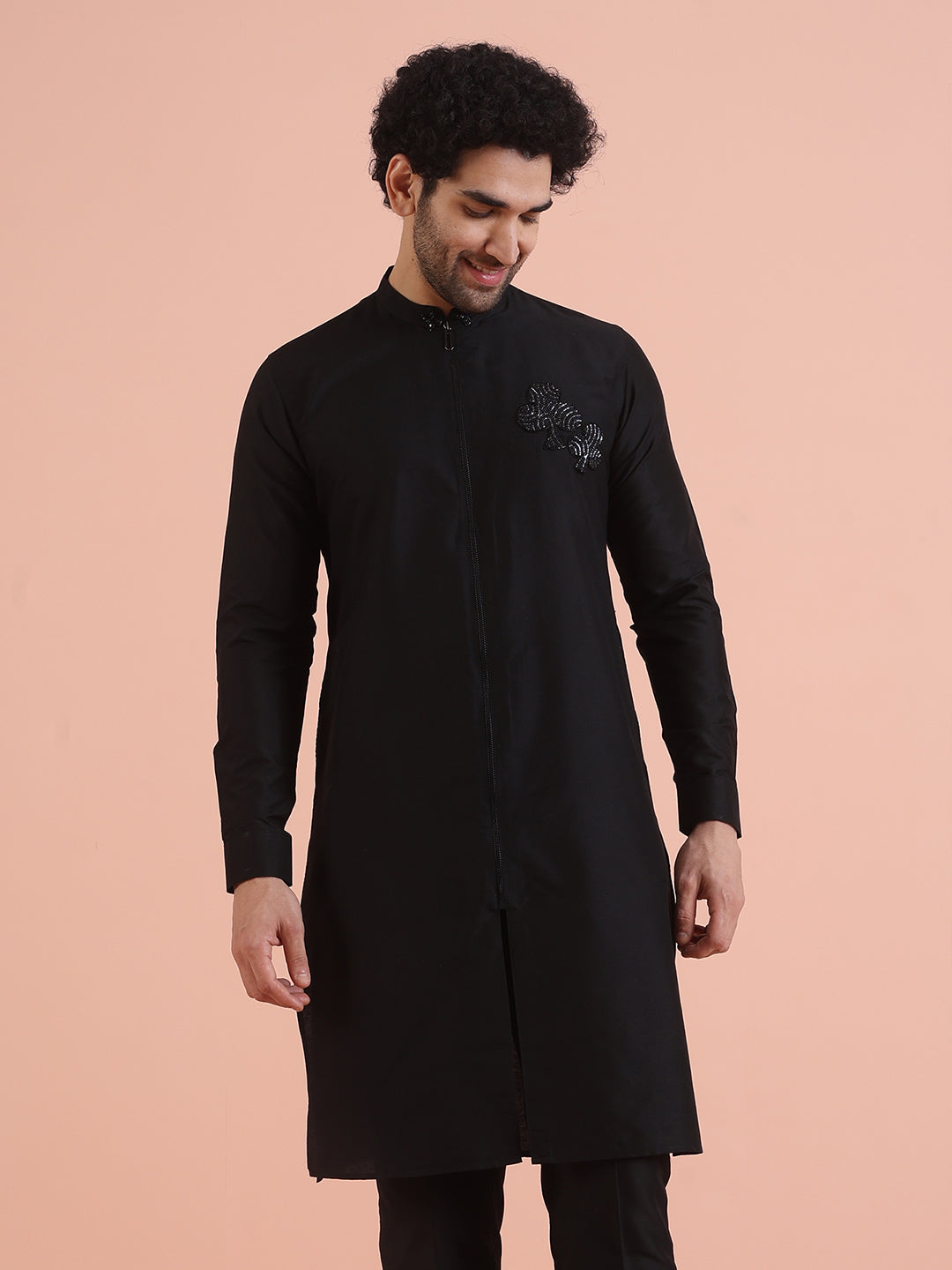 Experience classic elegance with this Men Black Solid Kurta with Patch Work. The breathable Silk Blend fabric ensures comfort throughout the day. Ideal for festive events or casual wear.