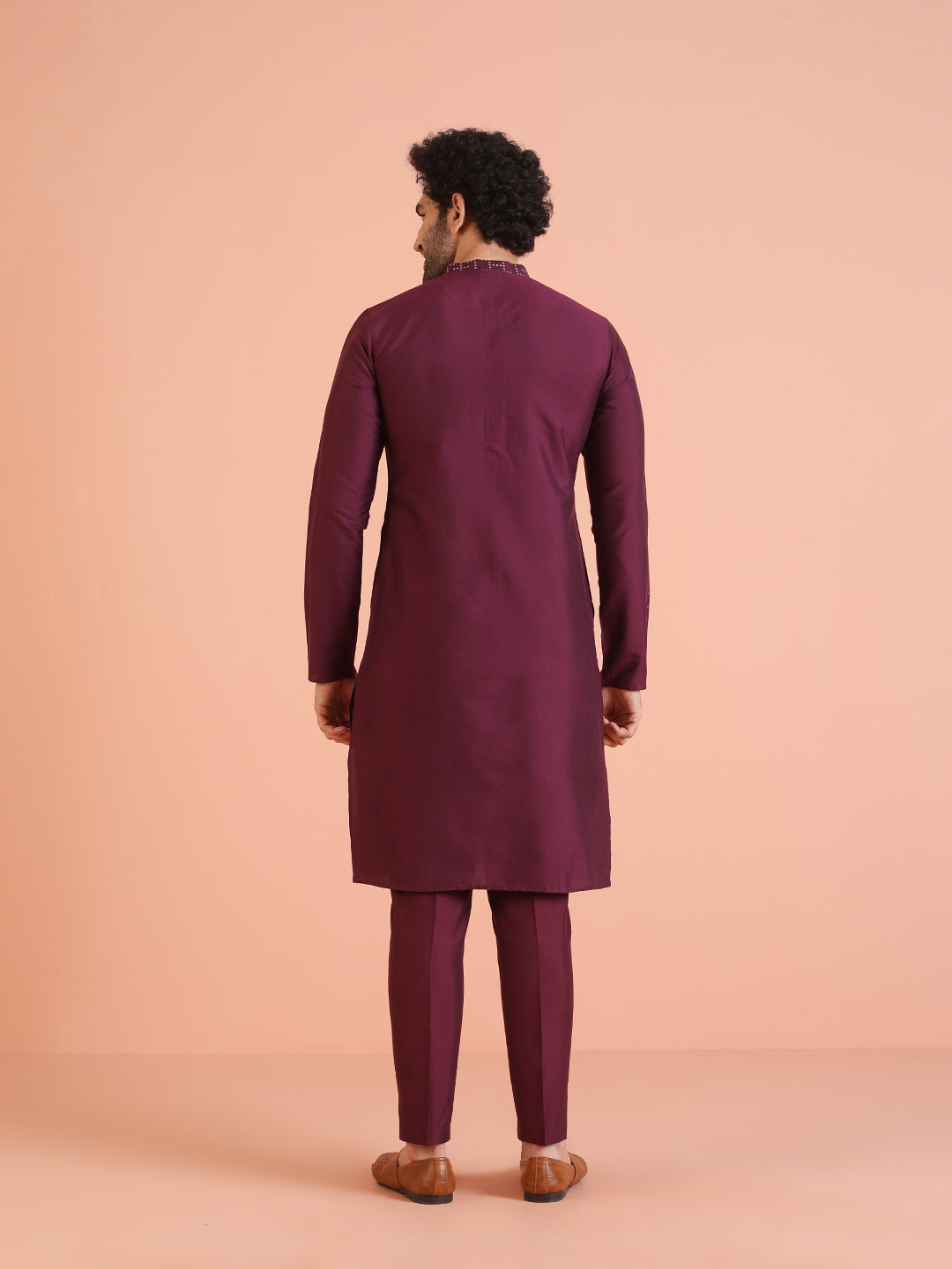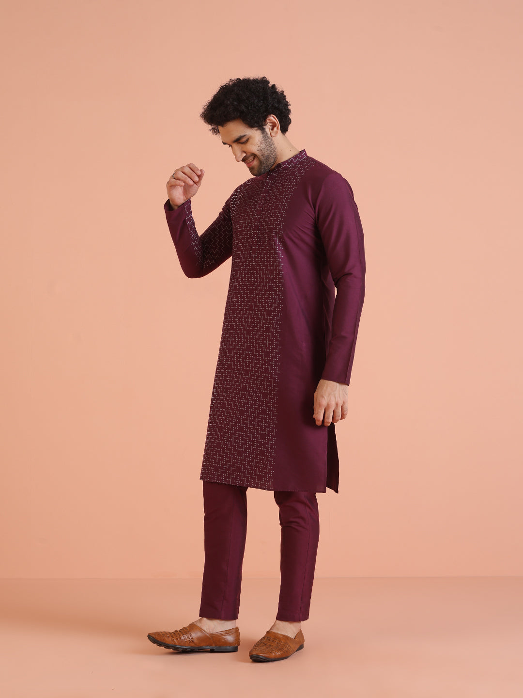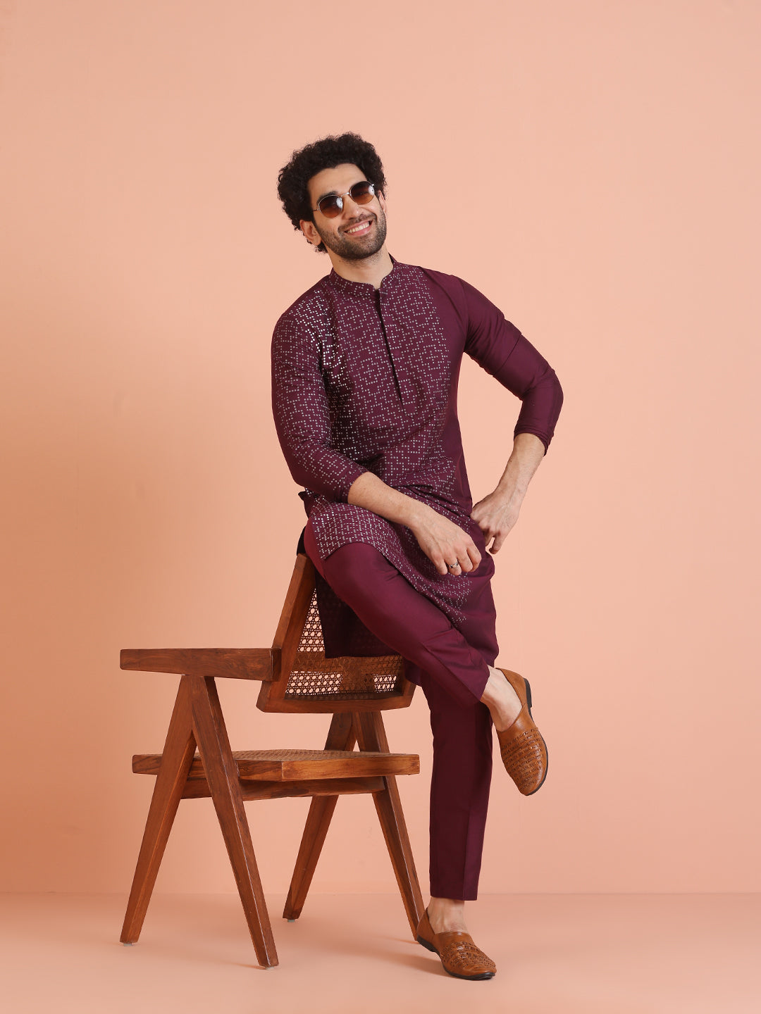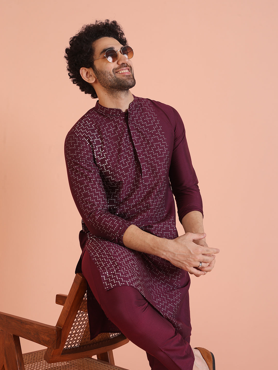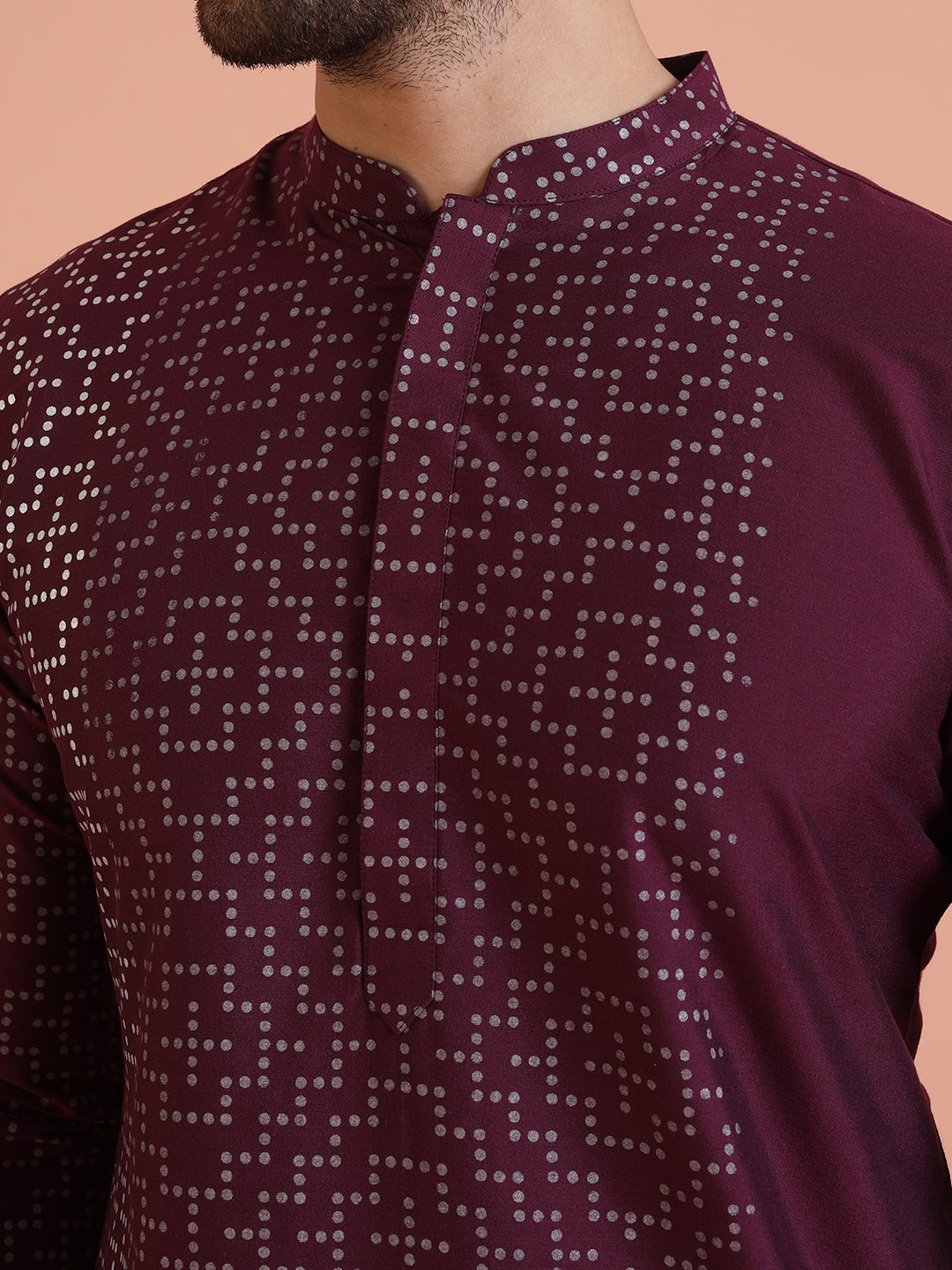 Experience classic elegance with this Men Wine Printed Geometric Kurta. The Printed Pattern adds a refined touch, while the breathable Cotton Blend fabric ensures comfort throughout the day. Ideal for festive events or casual wear, this Kurta is a wardrobe essential..