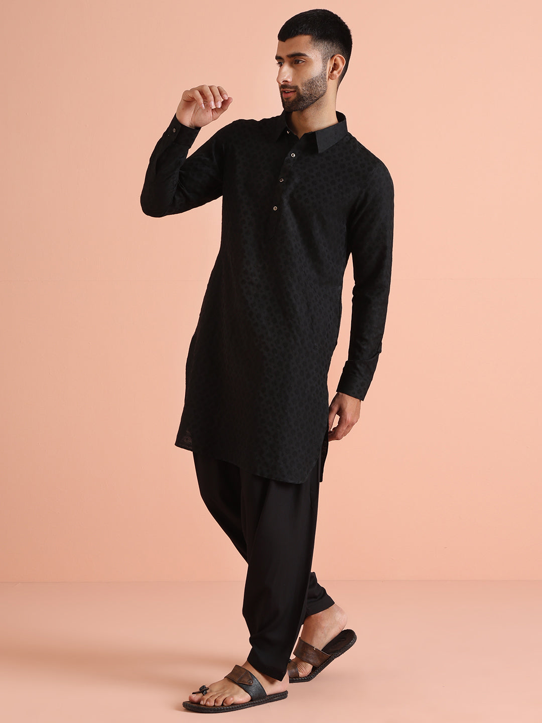 Black Self-Patterned Jacquard Long Kurta with Collar