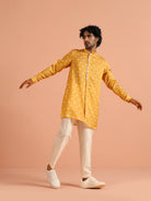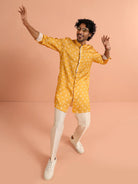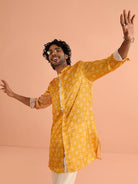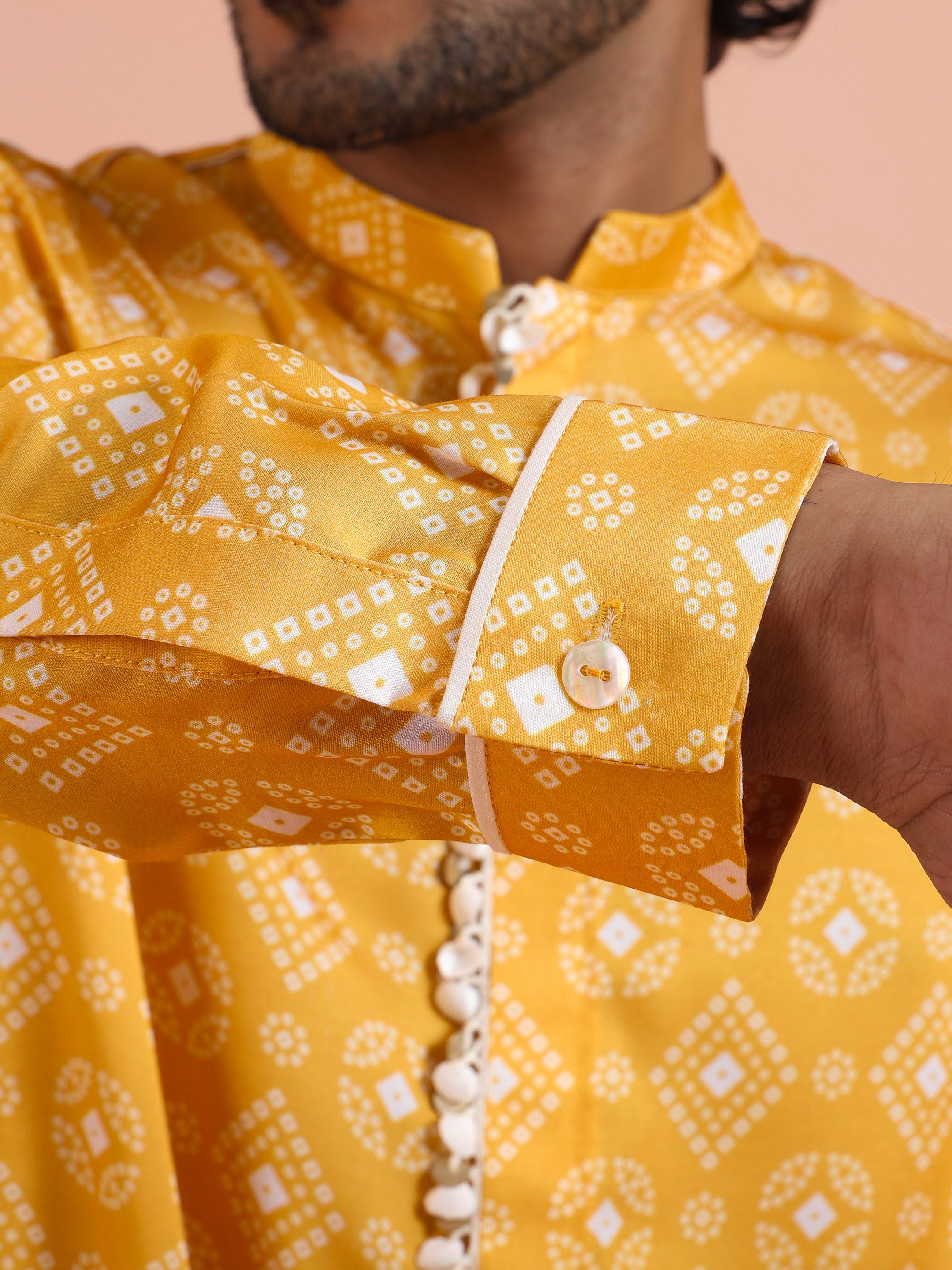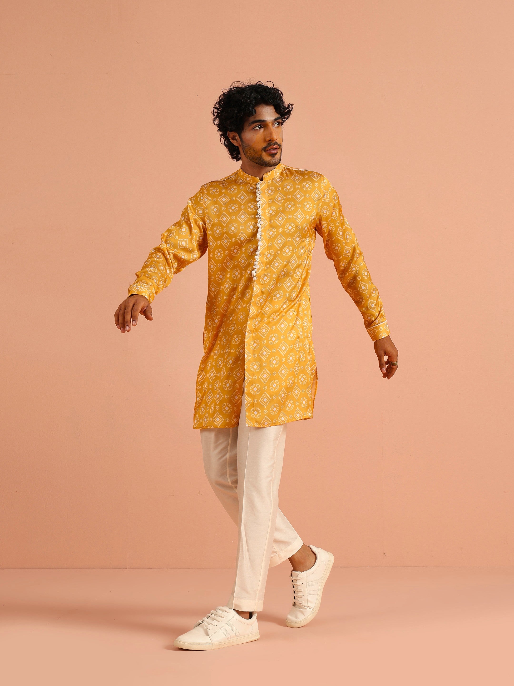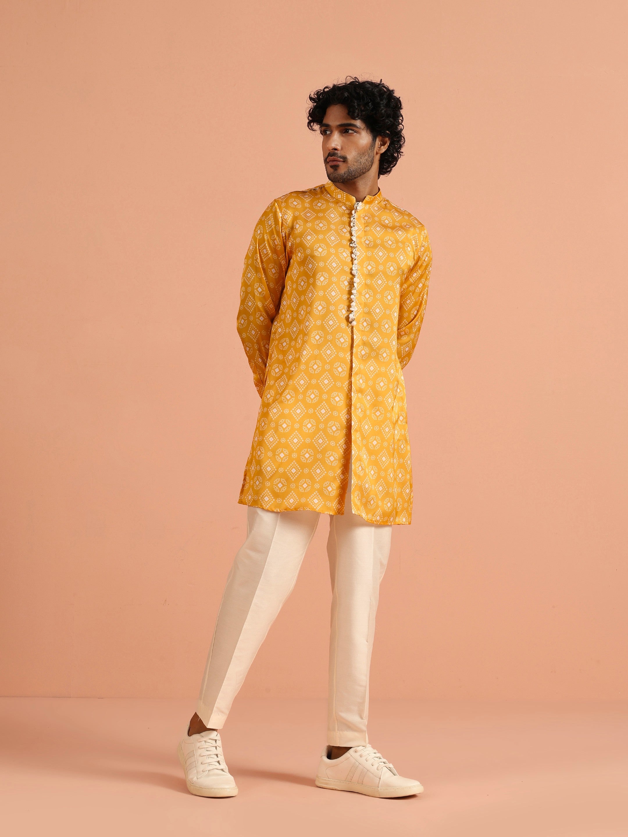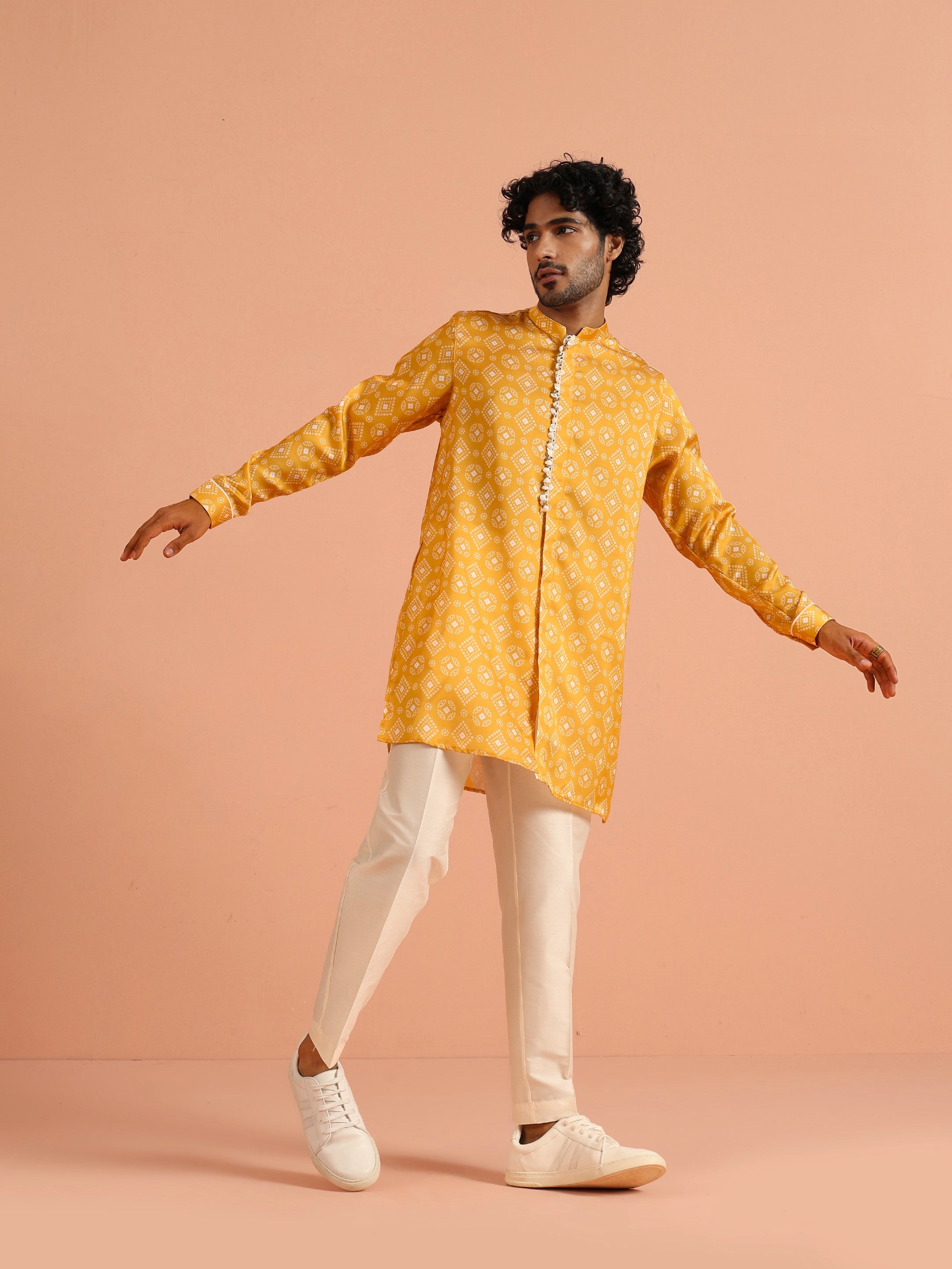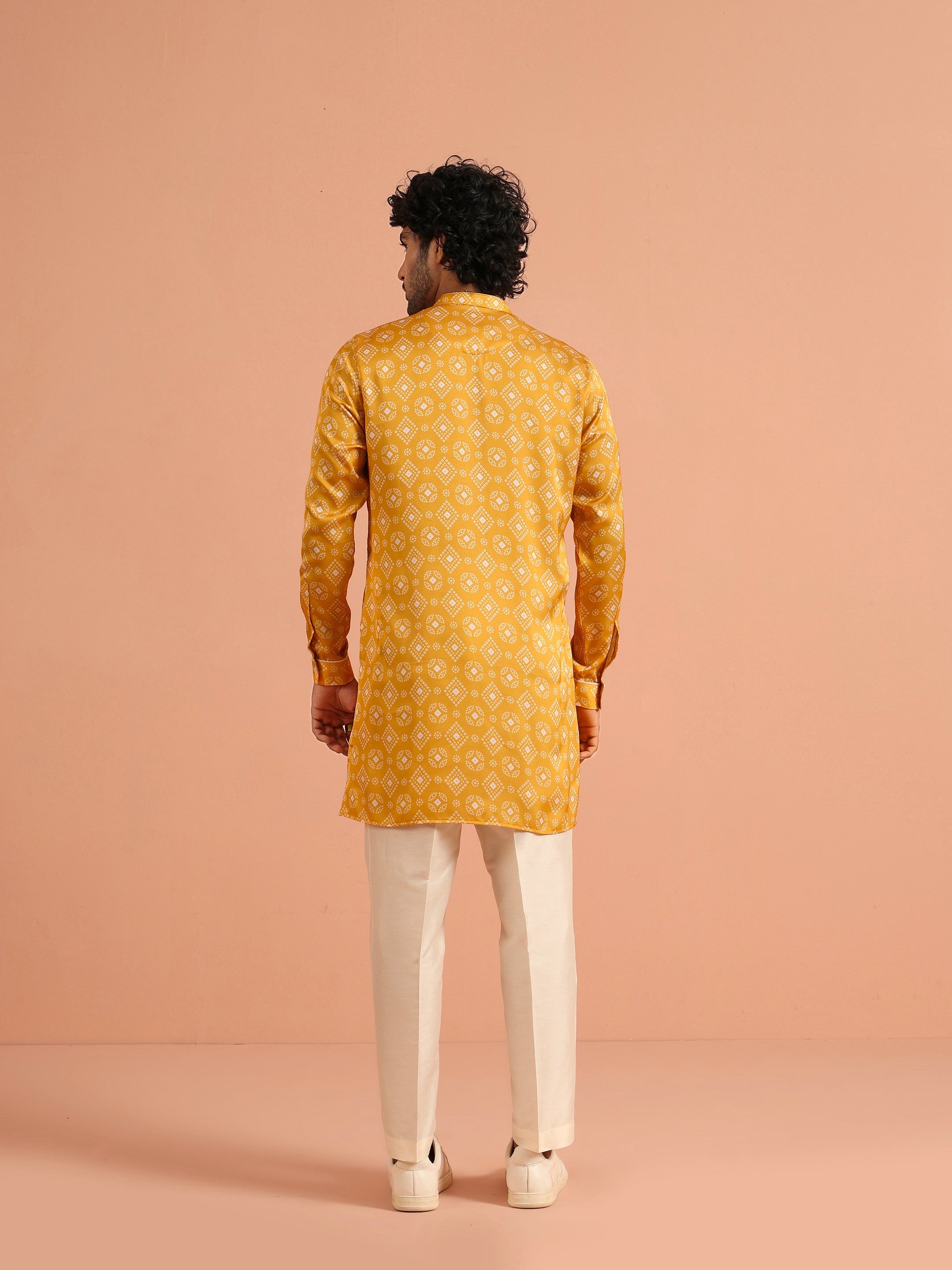 Kisah Menss Mustard Bandhani Printed Mid Kurta festive printed kurta with a modern cut. Perfect for haldi, weddings, and celebratory gatherings.