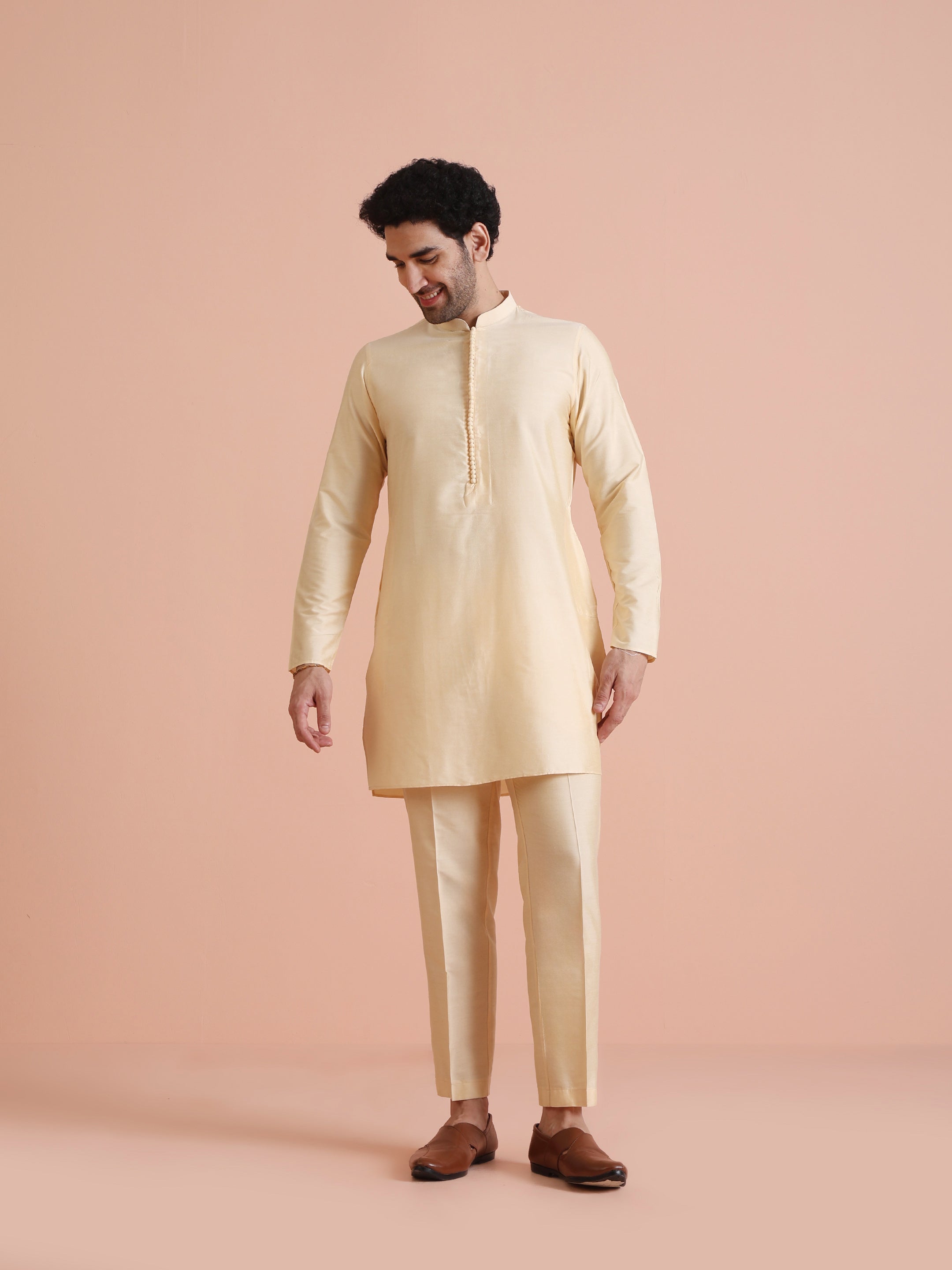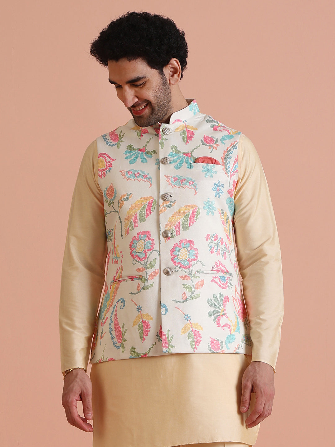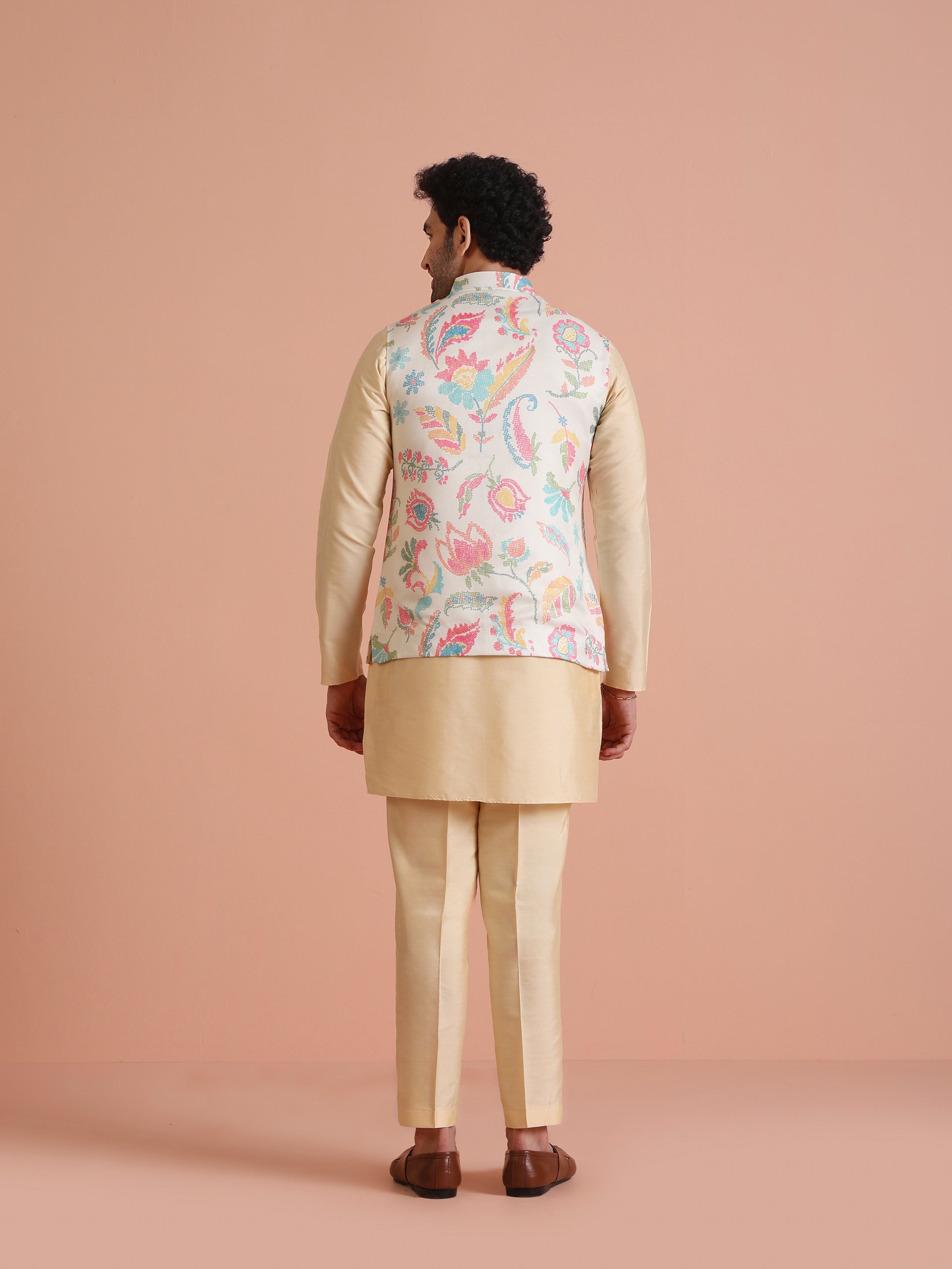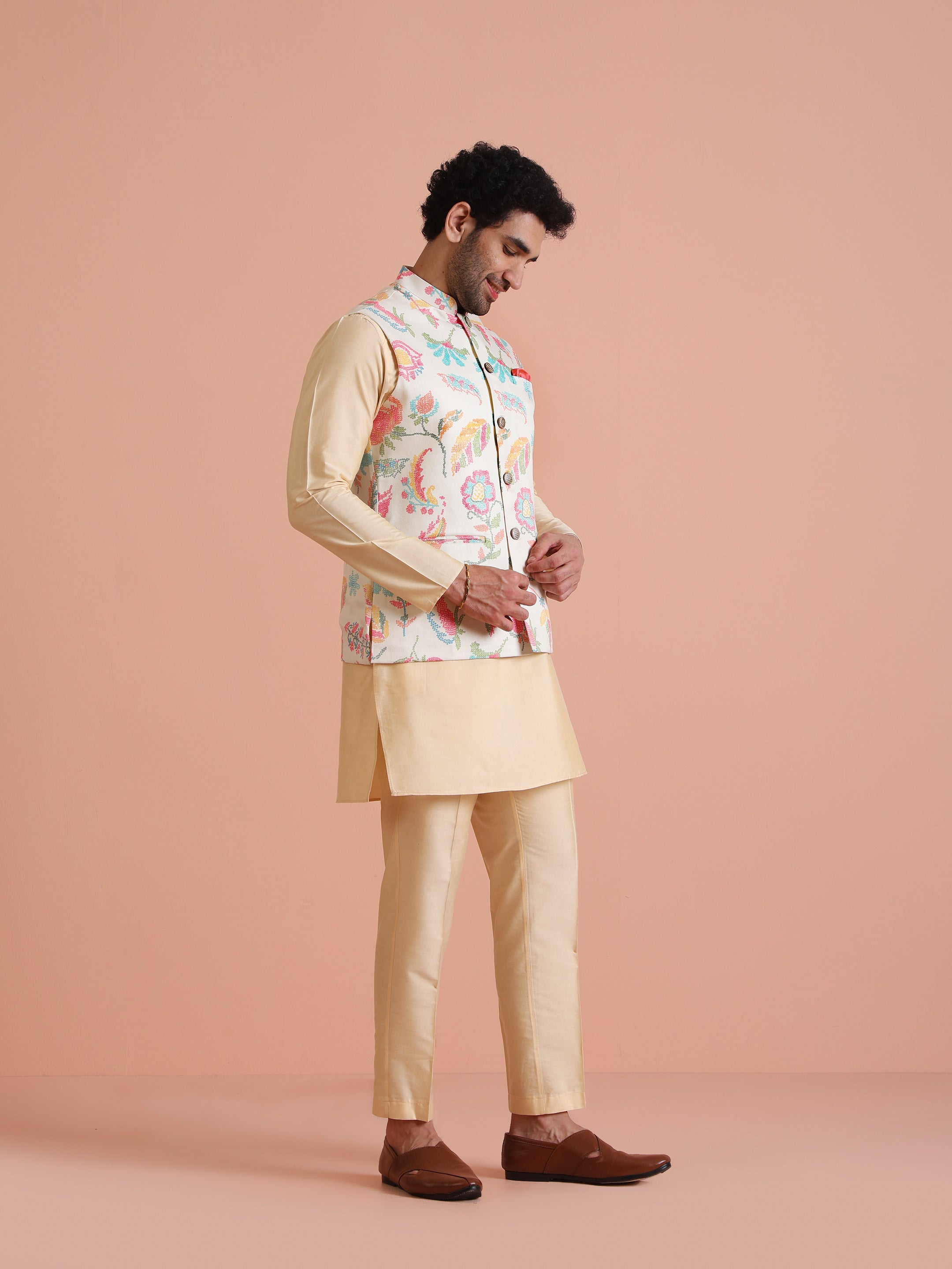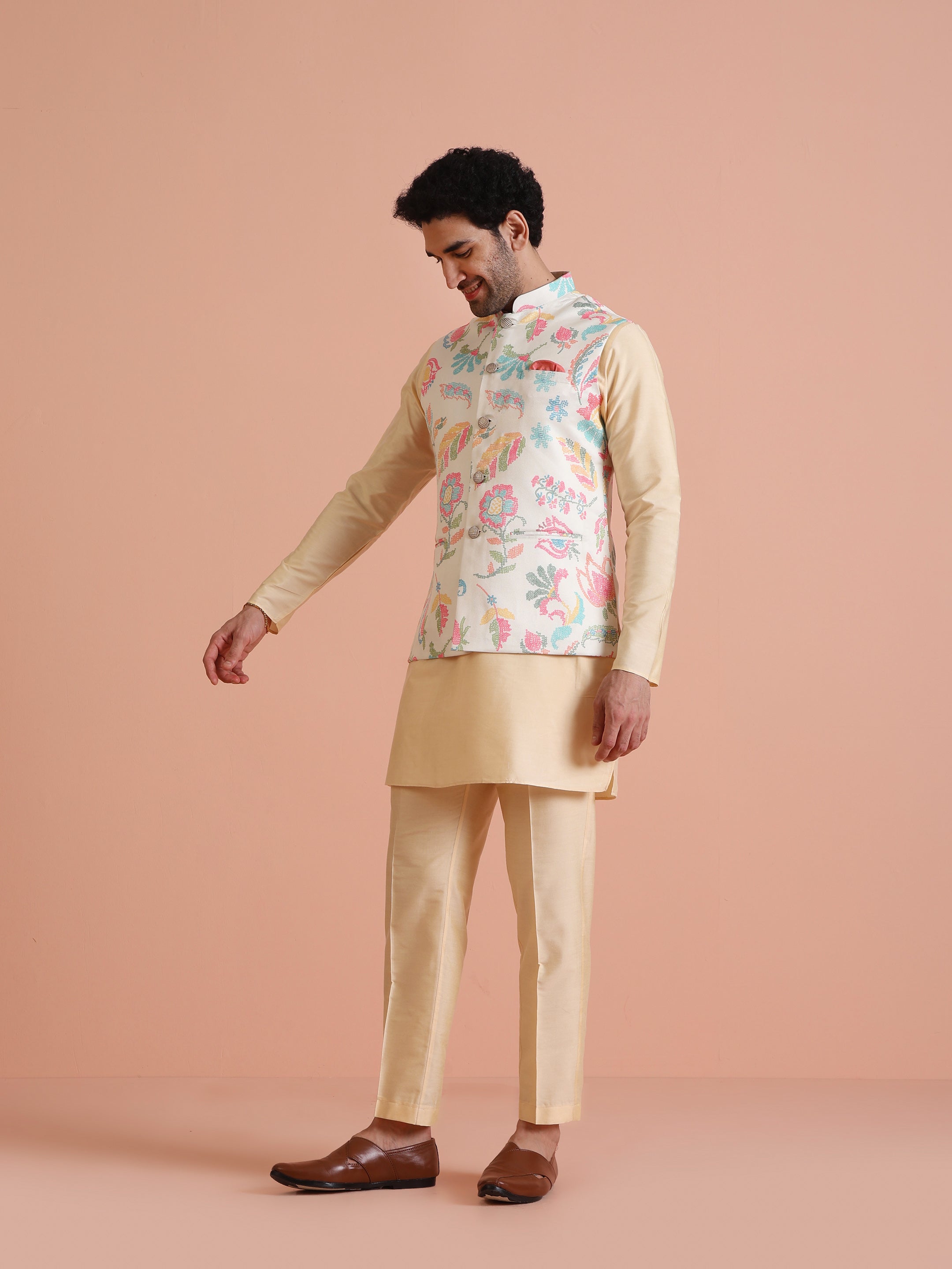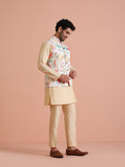 Beige cotton blend digital printed kurta jacket trouser set for men. A pastel floral ensemble ideal for Haldi, Mehendi, and festive celebrations.