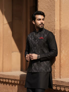 Black Jacquard Silk Blend Kurta Jacket Set