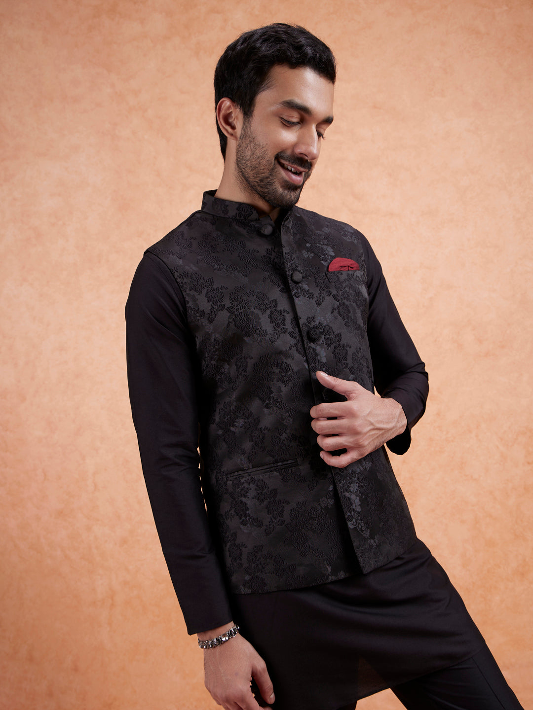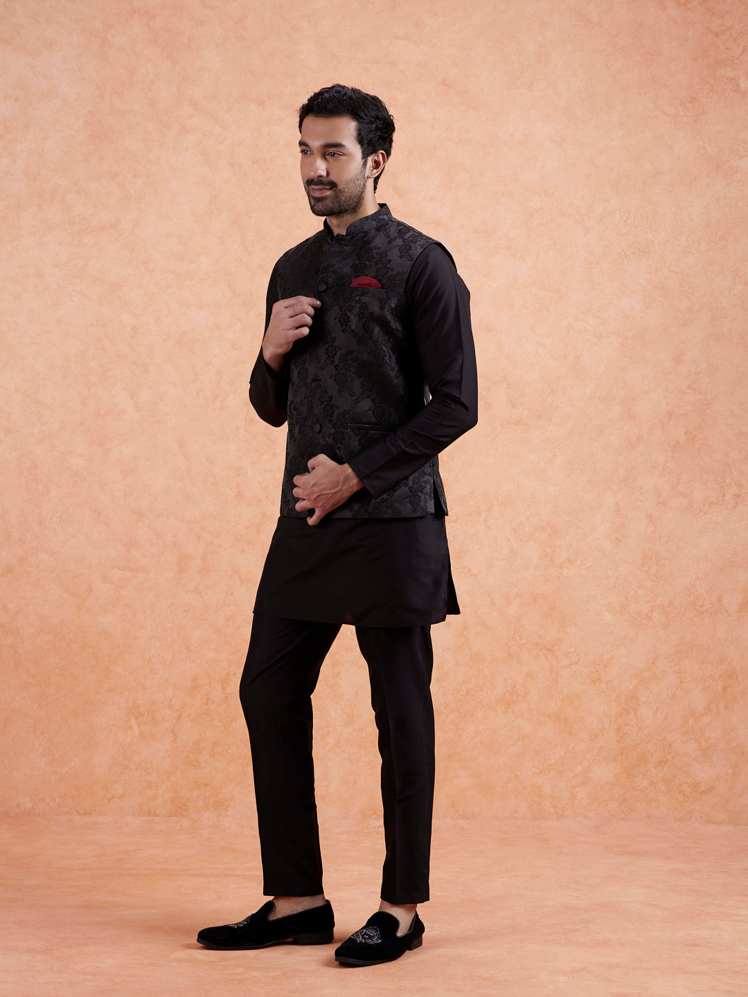Black Silk Blend Jacquard Mid Kurta Jacket Trouser Set, Perfect festive ethnic wear for men, ideal festive and casual occasions.