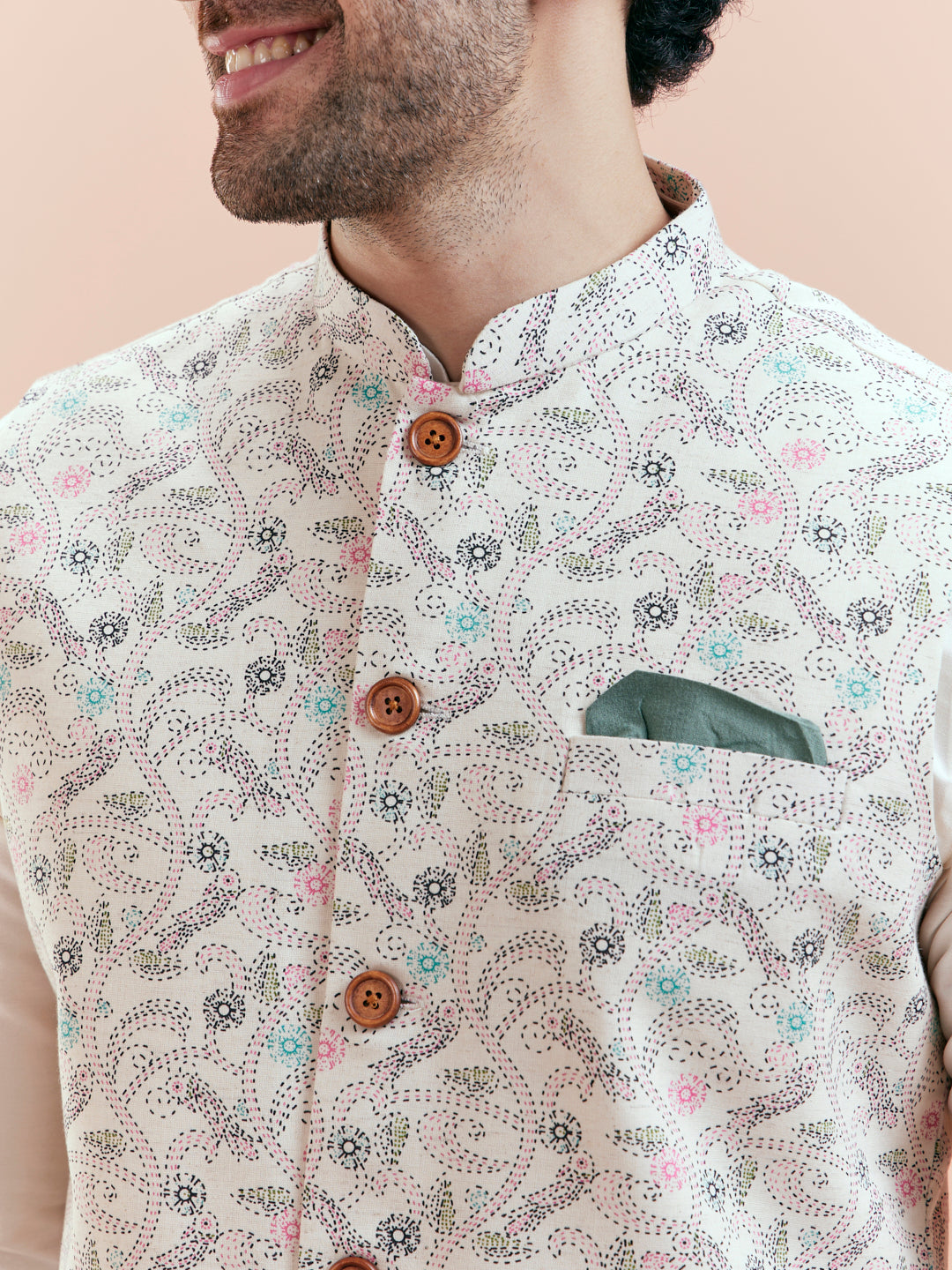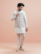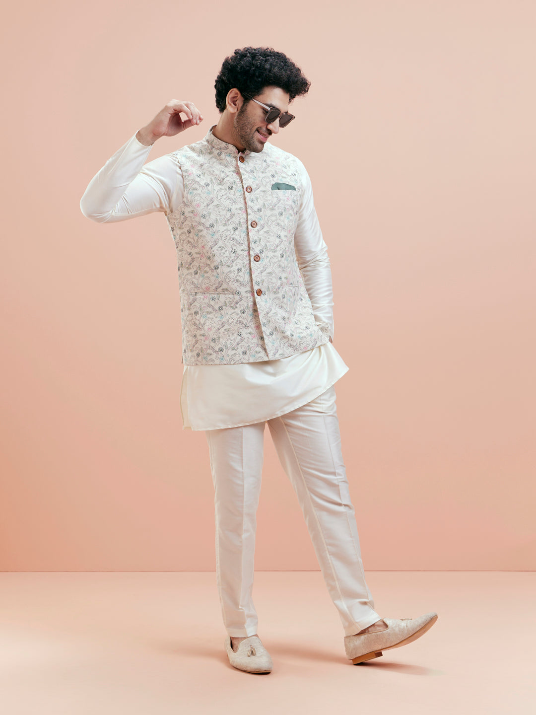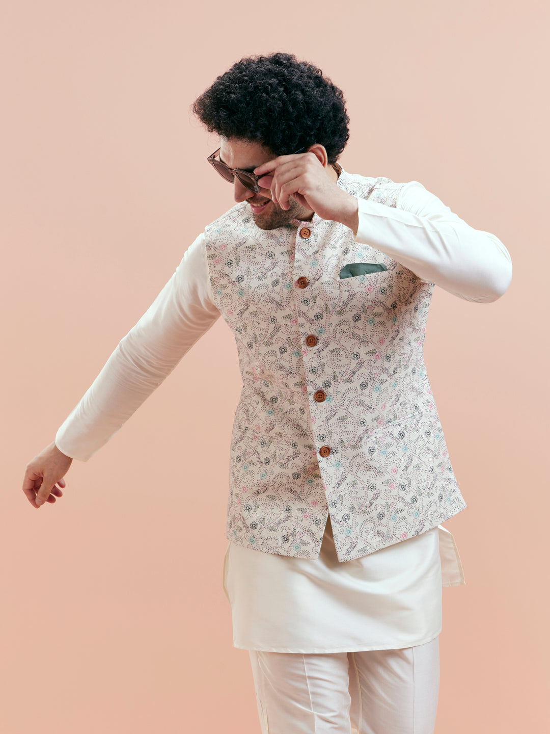 This Multicolor Cotton Blend Kurta Jacket Trouser Set includes a printed Nehru Jacket (aka Bundi), black mid kurta and trousers. A fresh, statement ethnic look ideal for Haldi, Mehendi or day events.