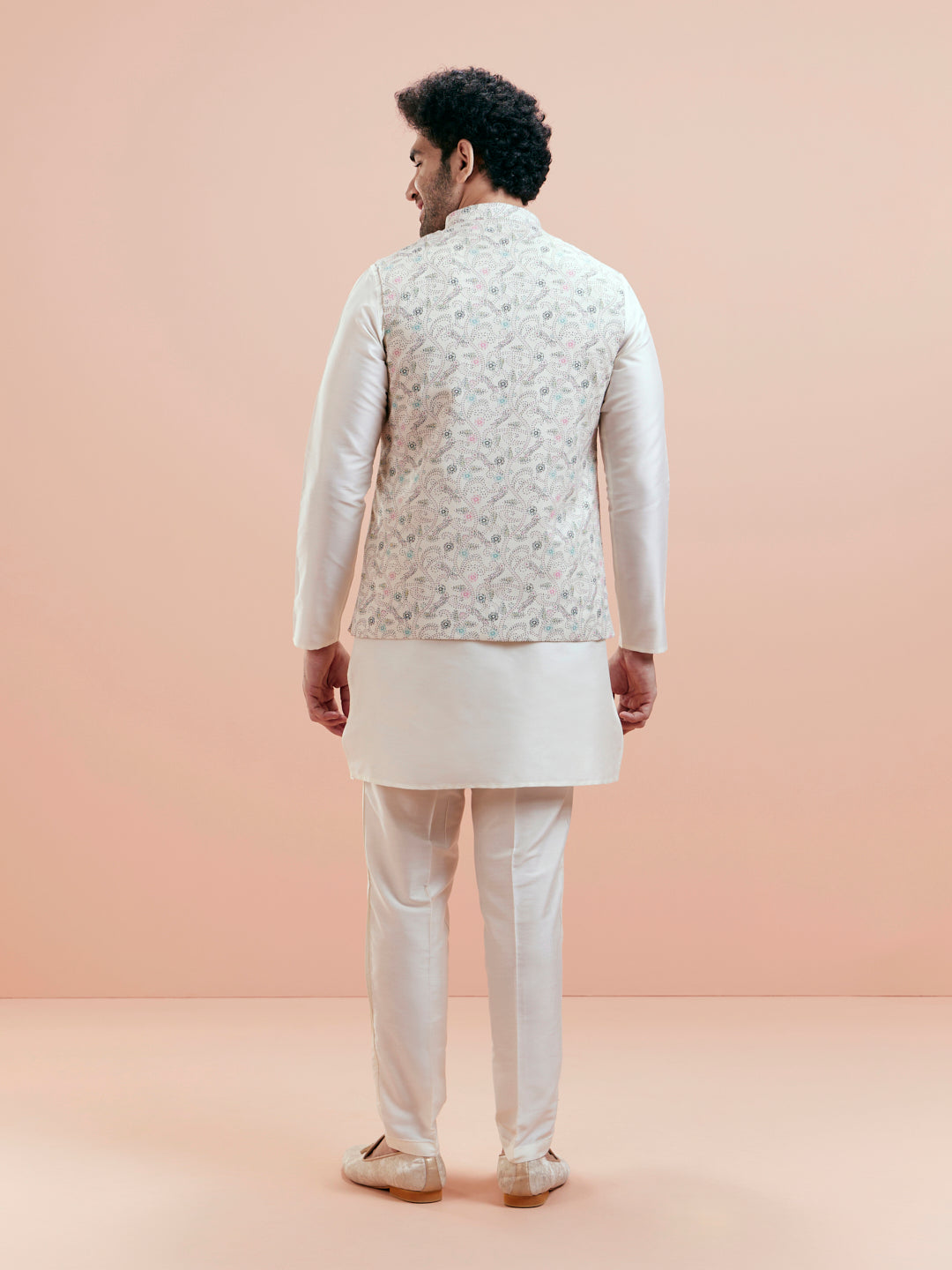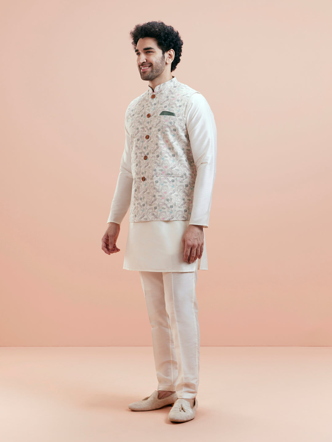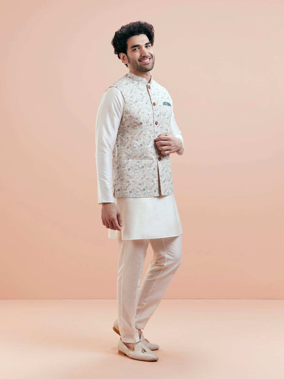 This Multicolor Cotton Blend Kurta Jacket Trouser Set includes a printed Nehru Jacket (aka Bundi), black mid kurta and trousers. A fresh, statement ethnic look ideal for Haldi, Mehendi or day events.