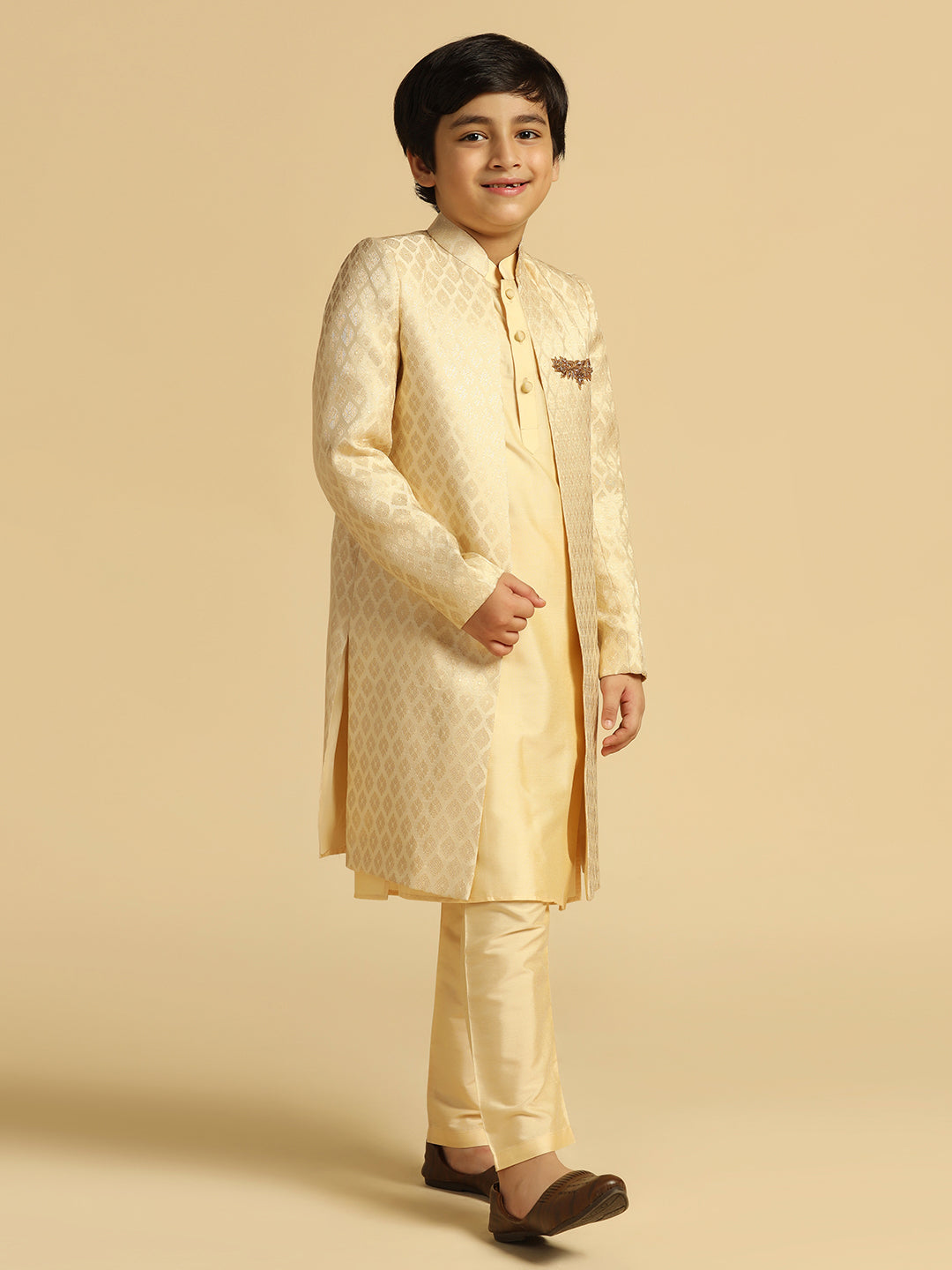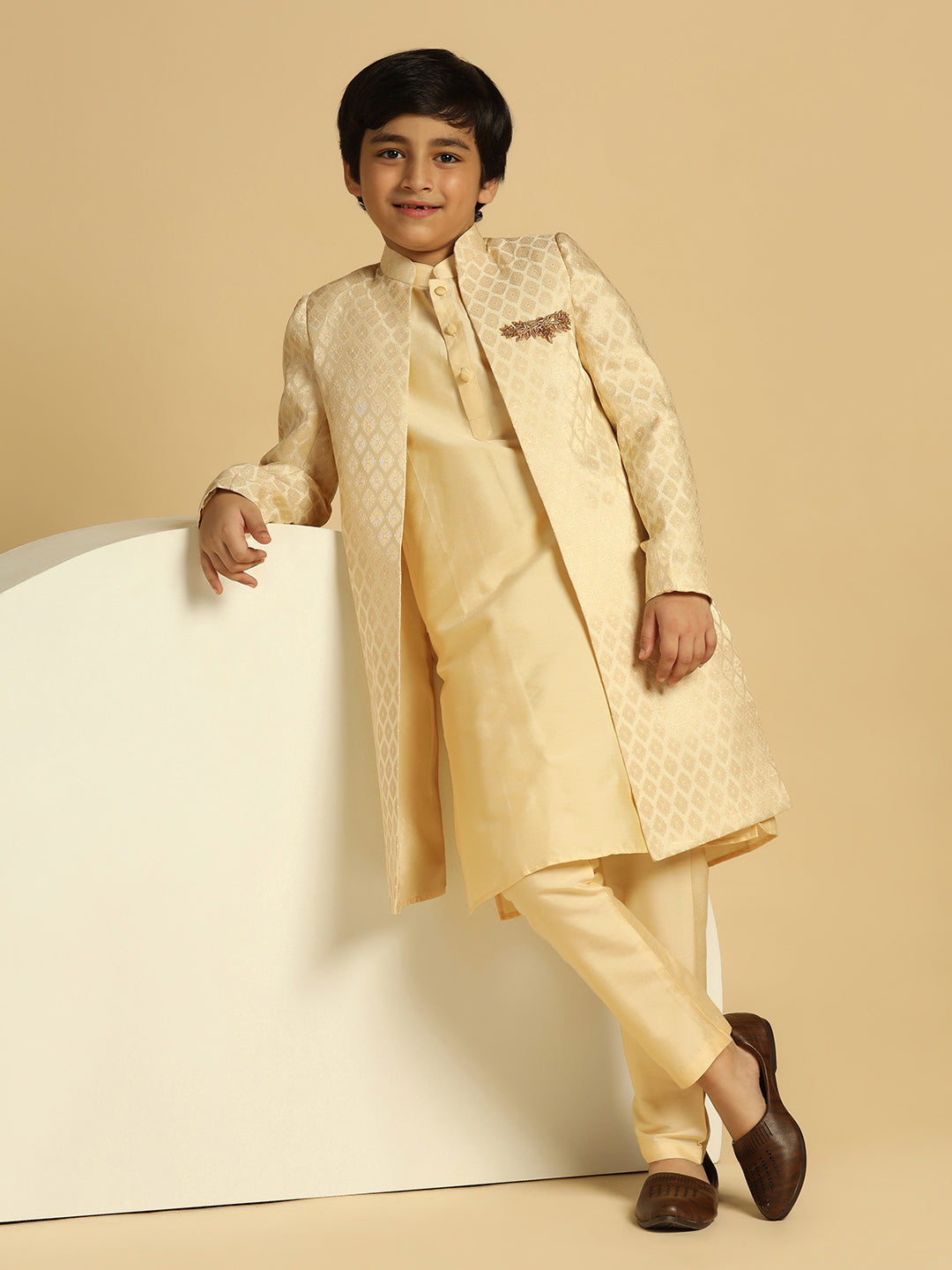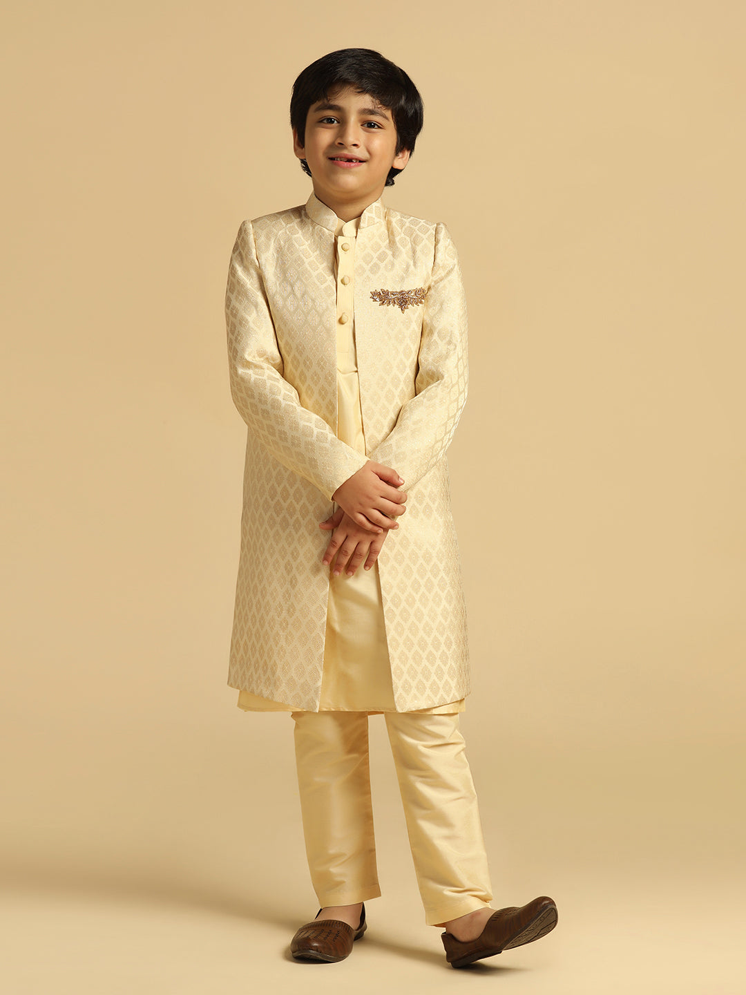 Experience classic elegance with this Kisah Boy's Cream Embellished Kurta Indowestern Pyjama Set. The breathable fabric ensures comfort throughout the day. Ideal for festive events or casual wear.