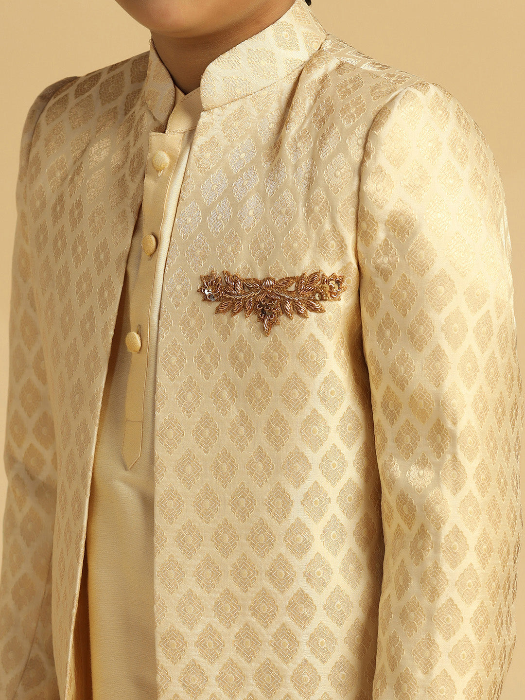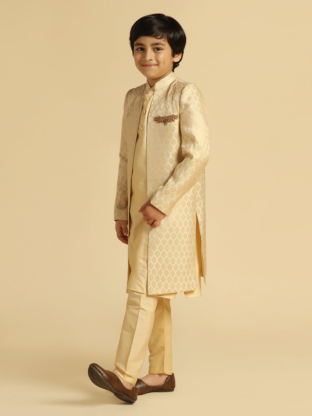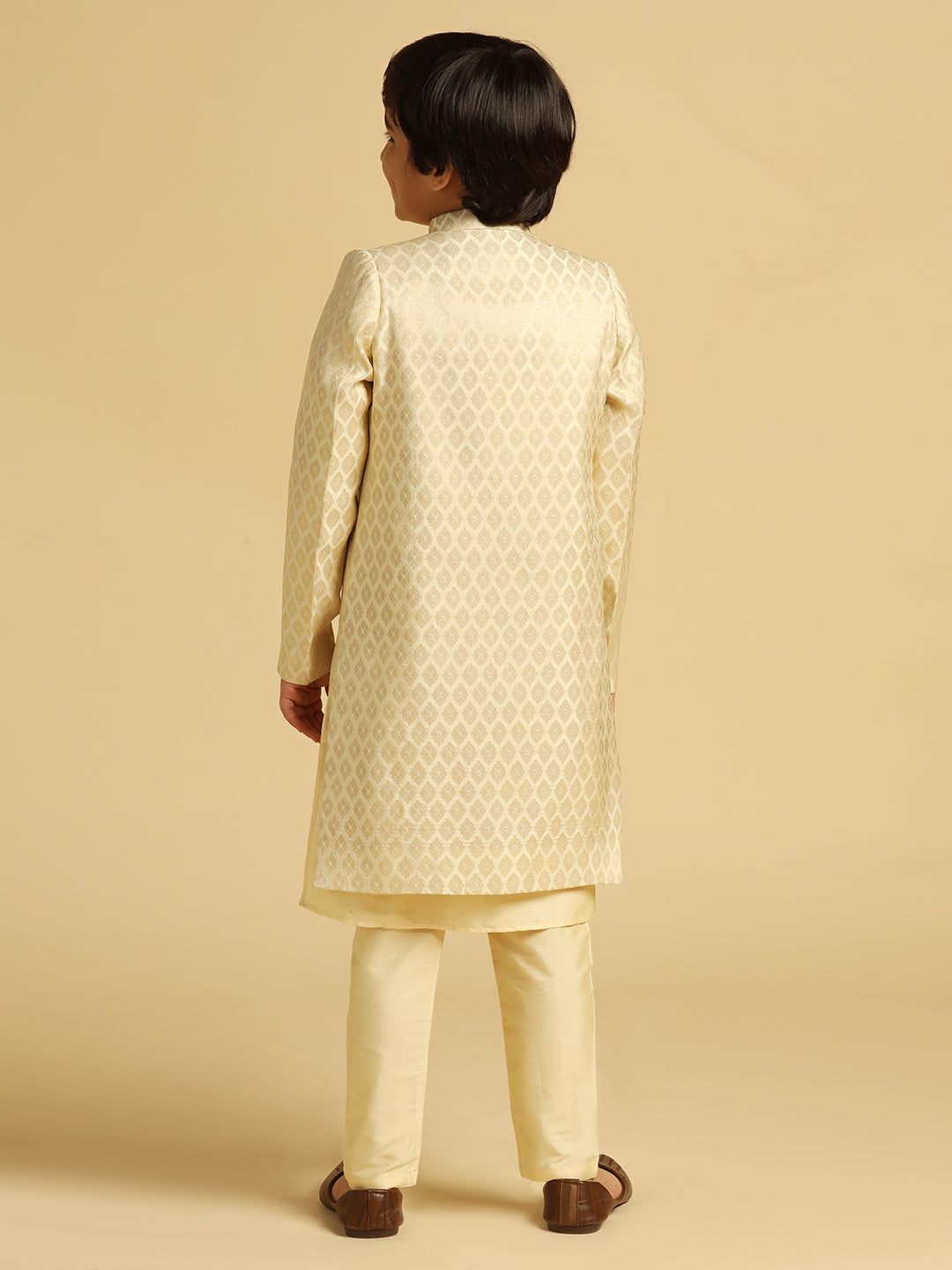 Experience classic elegance with this Kisah Boy's Cream Embellished Kurta Indowestern Pyjama Set. The breathable fabric ensures comfort throughout the day. Ideal for festive events or casual wear.