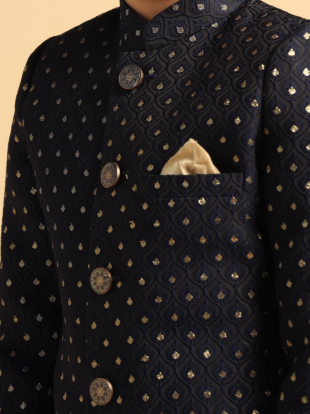 Experience classic elegance with this Kisah Boy's Navy Blue Self Design Indowestern Pyjama Set. The breathable fabric ensures comfort throughout the day. Ideal for festive events or casual wear.