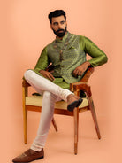 Experience classic elegance with this Kisah Men Green Silk Blend Ethnic Motifs Pattern, Kurta Jacket Churidar Set. The breathable fabric ensures comfort throughout the day. Ideal for festive events or casual wear.