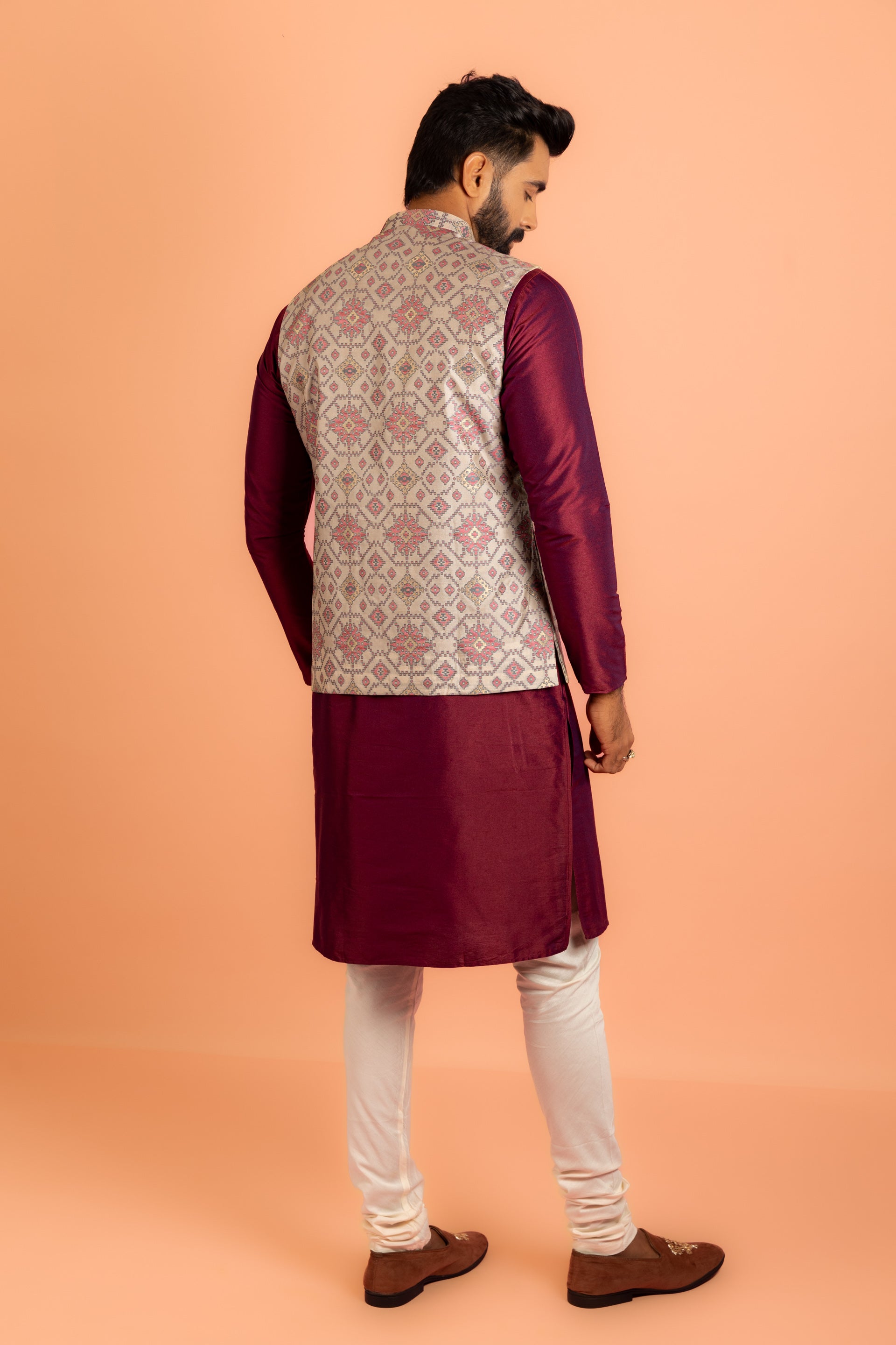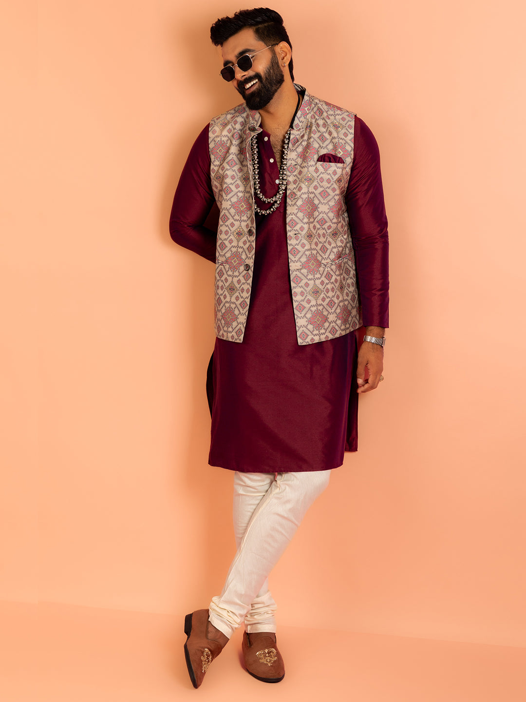 Experience classic elegance with this Kisah Men Grey Cotton Blend Geometric Pattern, Kurta Jacket Churidar Set. The breathable fabric ensures comfort throughout the day. Ideal for festive events or casual wear.