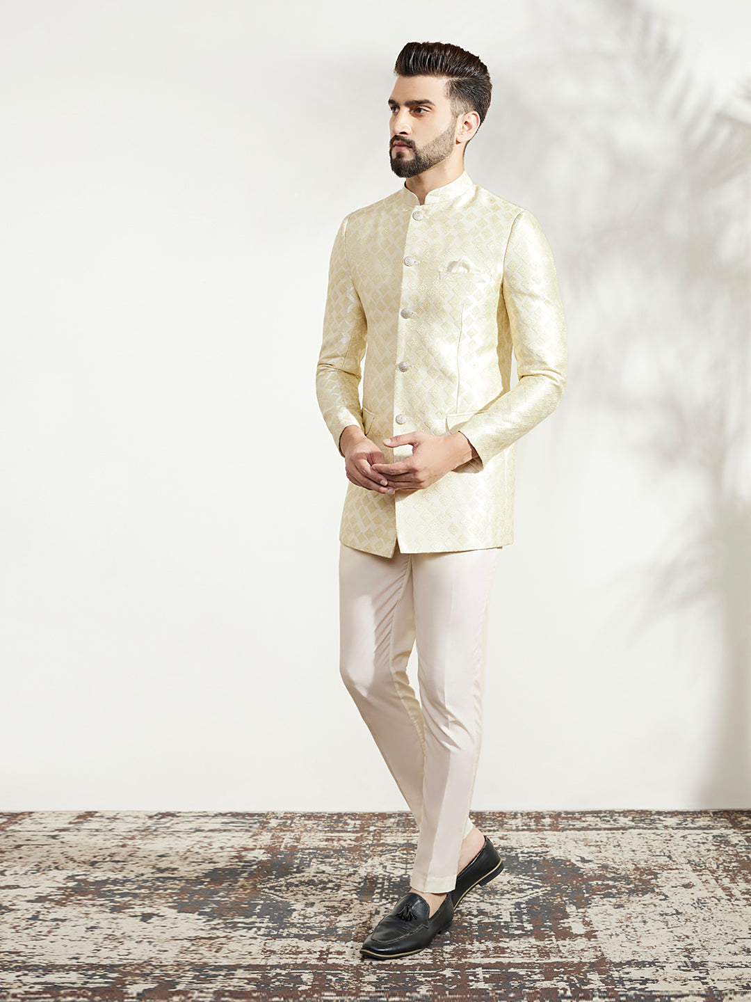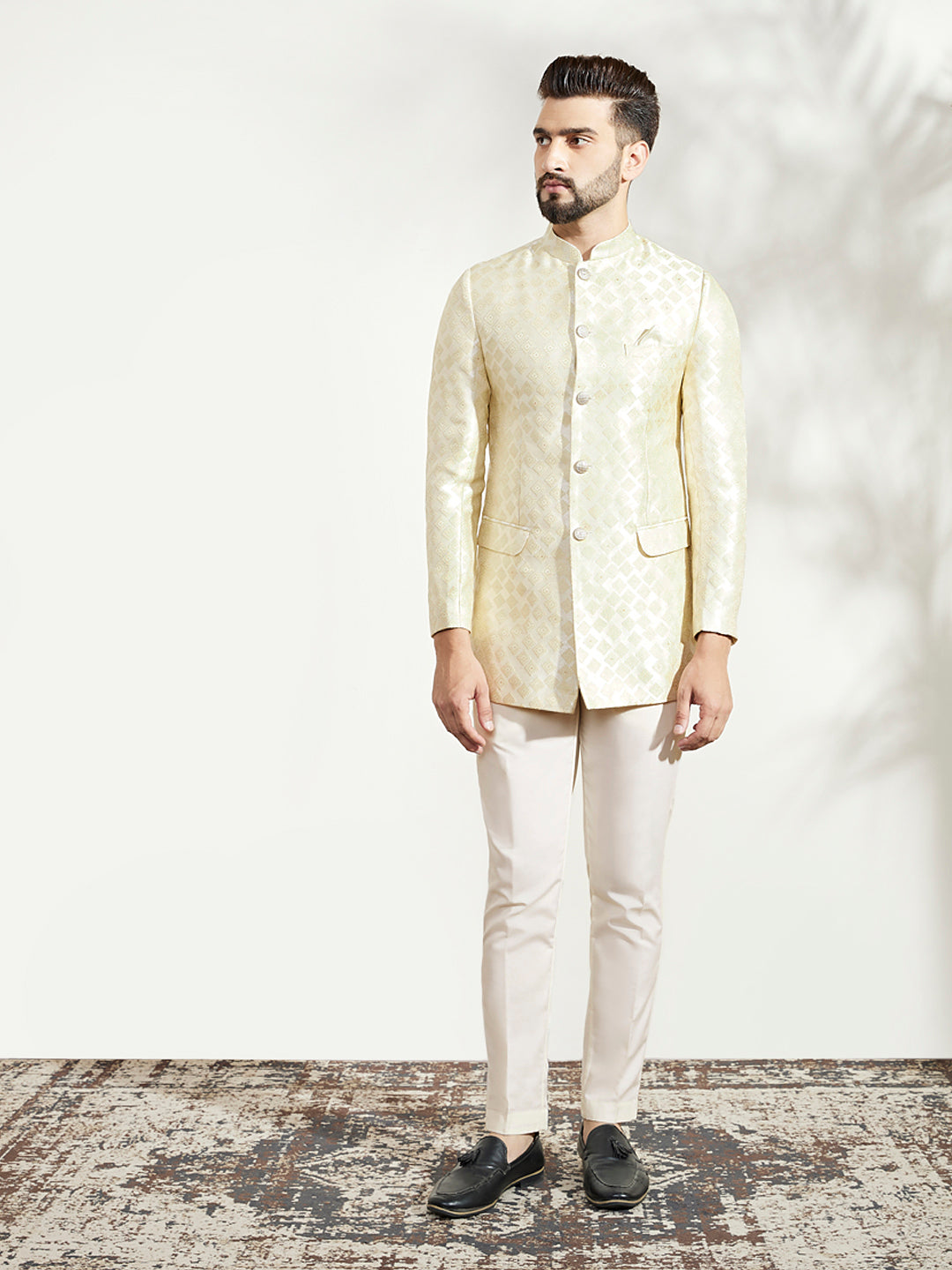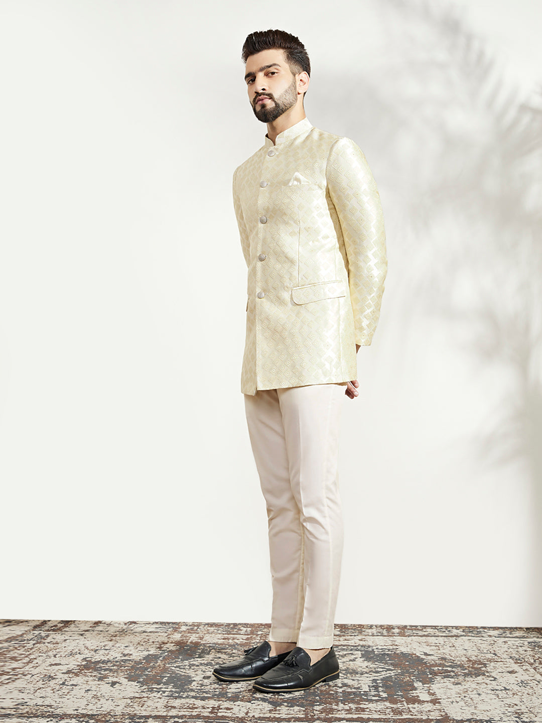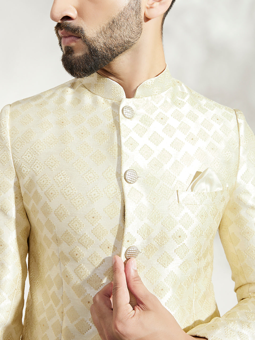 Add charm to your wardrobe with this off-white silk blend jacquard textured bandhgala and trouser set. Its refined look and comfortable fit make it perfect for special occasions.