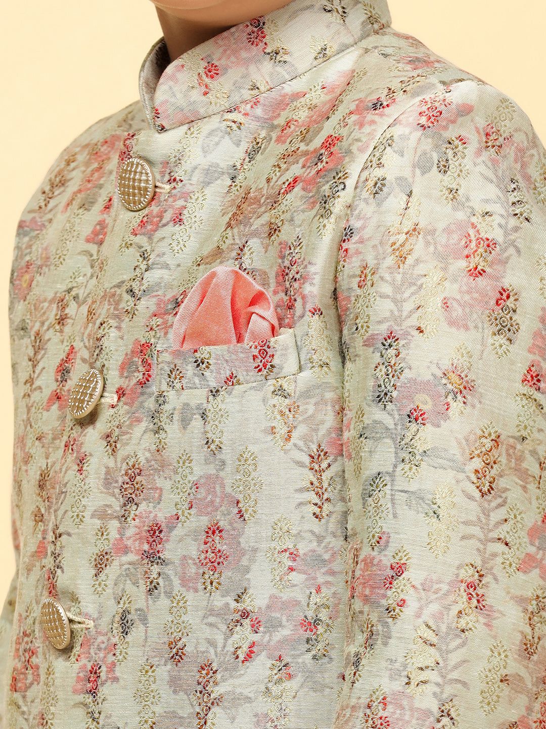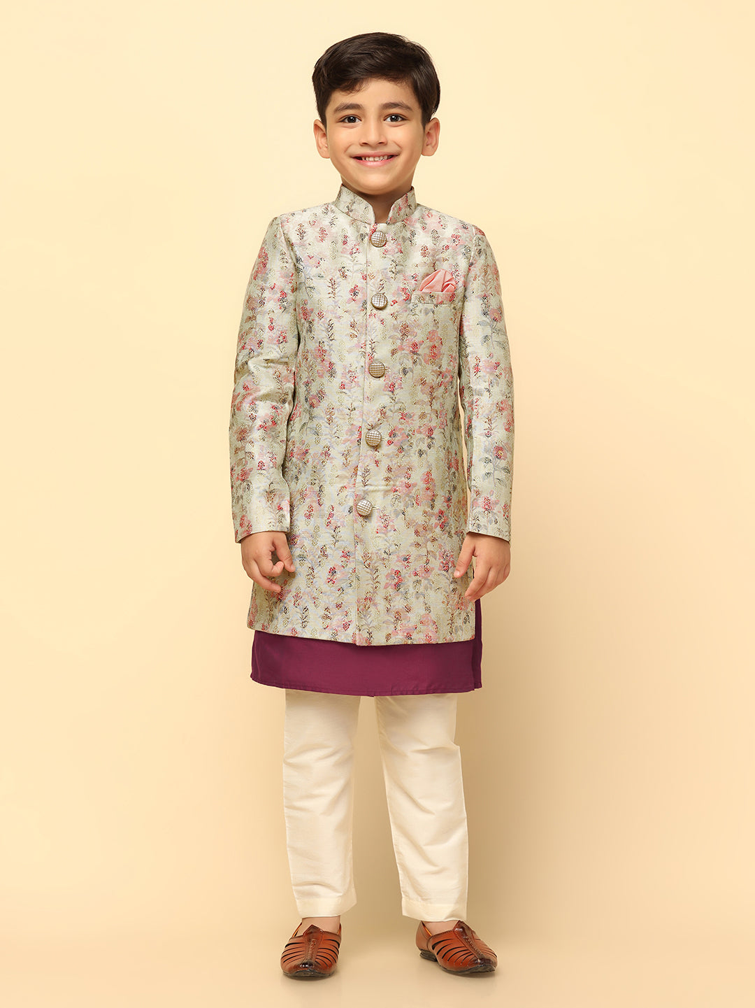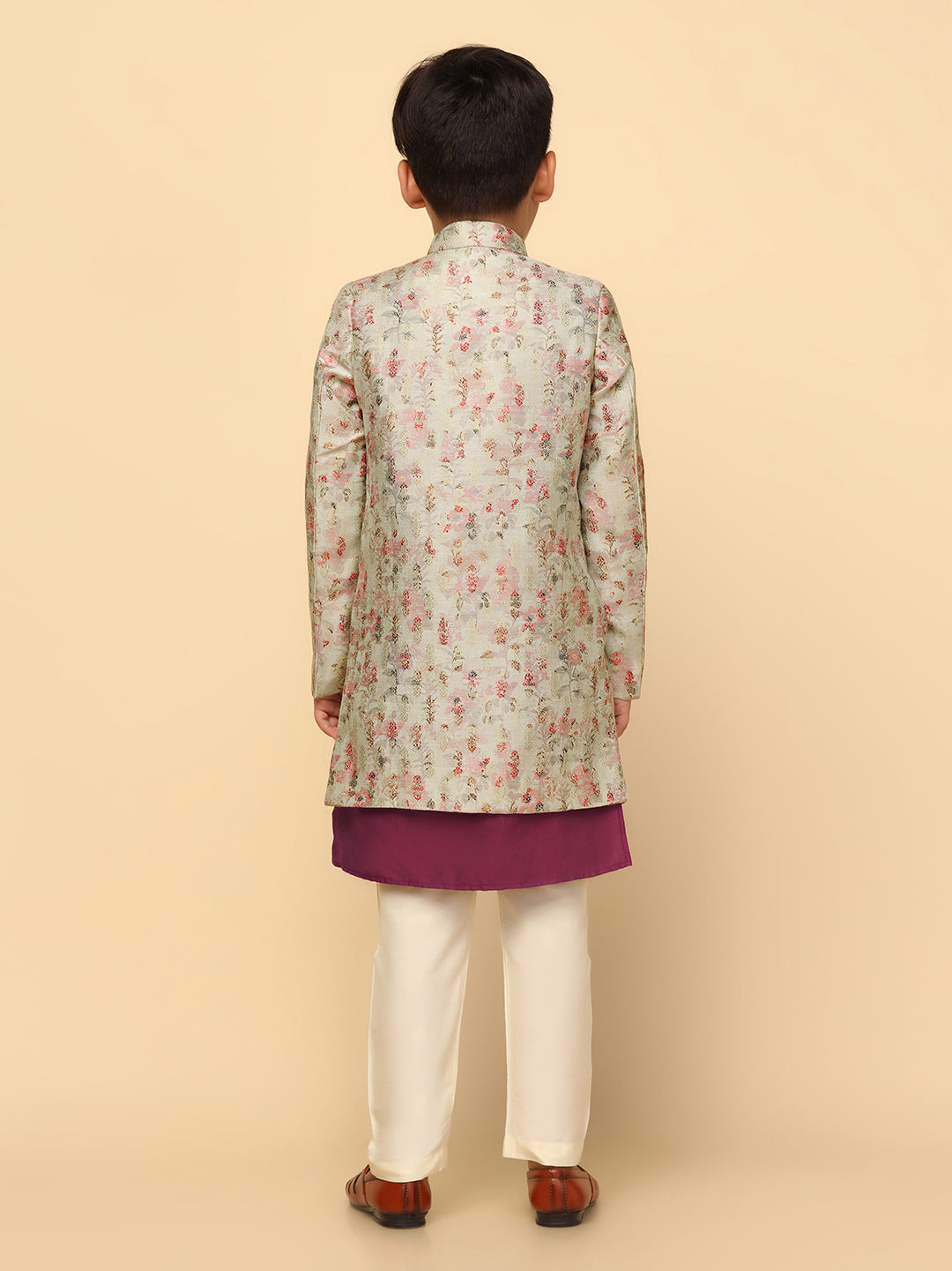 This multi-coloured printed silk blend jacquard kurta and churidar set, paired with an indowestern, offers a stylish fusion of tradition and modernity. A regular fit for comfort.