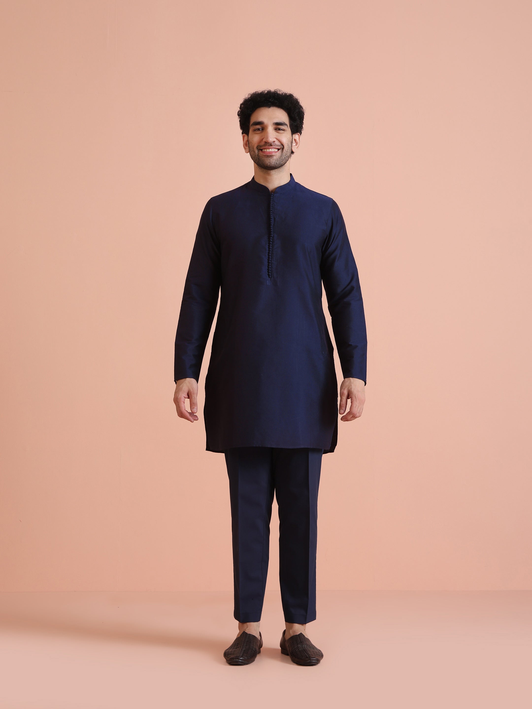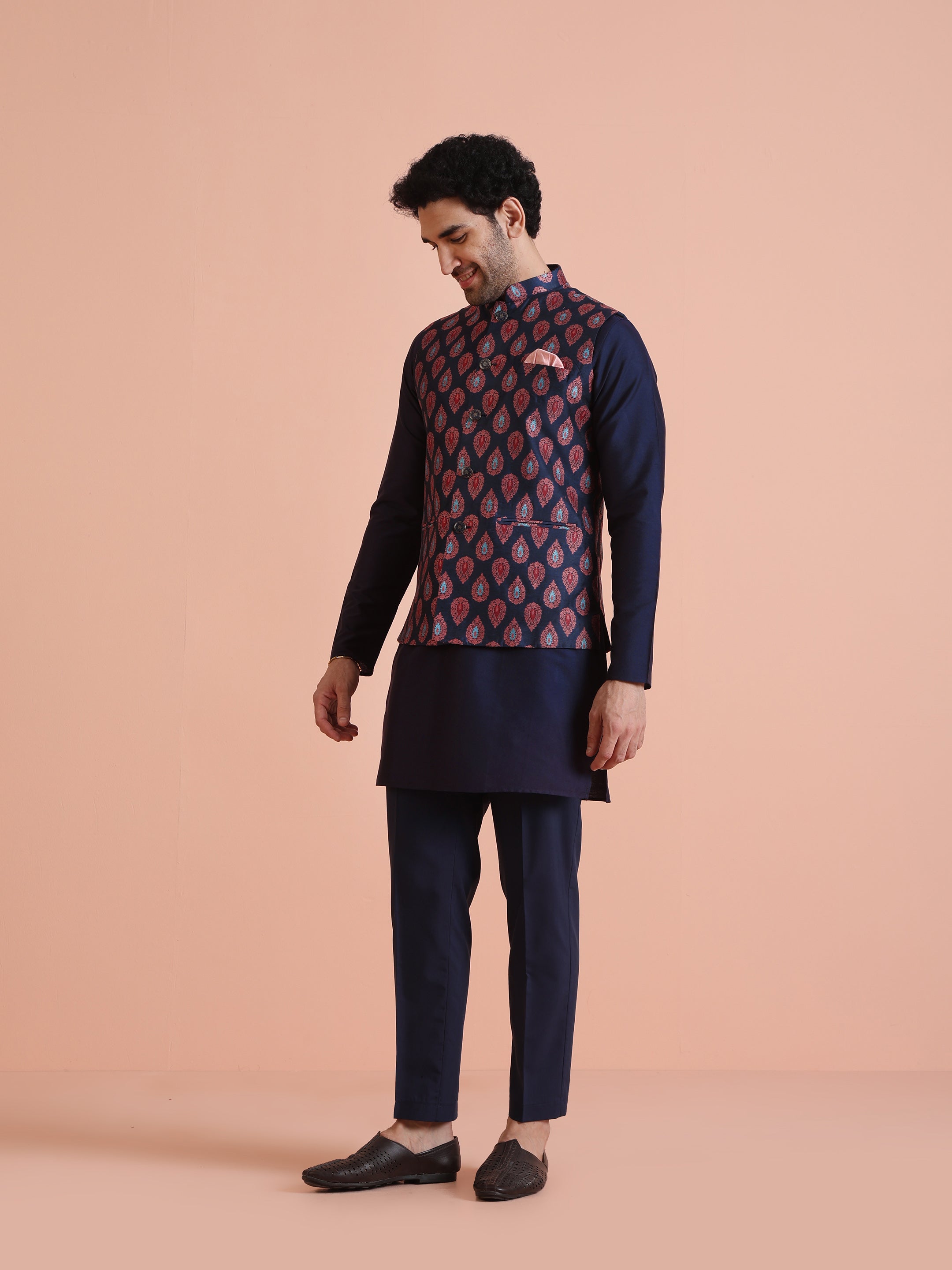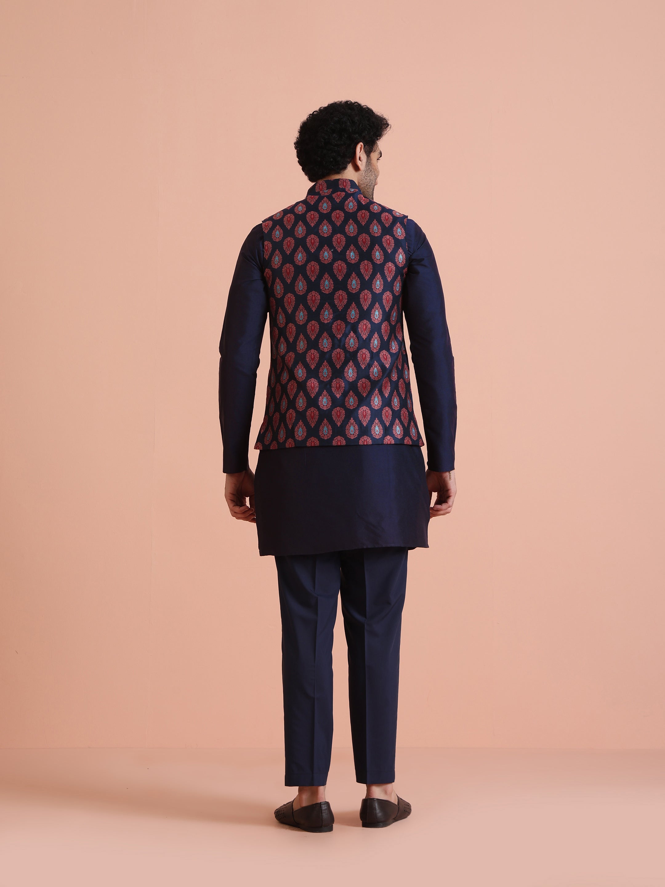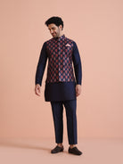 Navy blue silk blend jacquard kurta jacket trouser set for men. Elegant festive outfit ideal for weddings, cocktails, and celebrations.