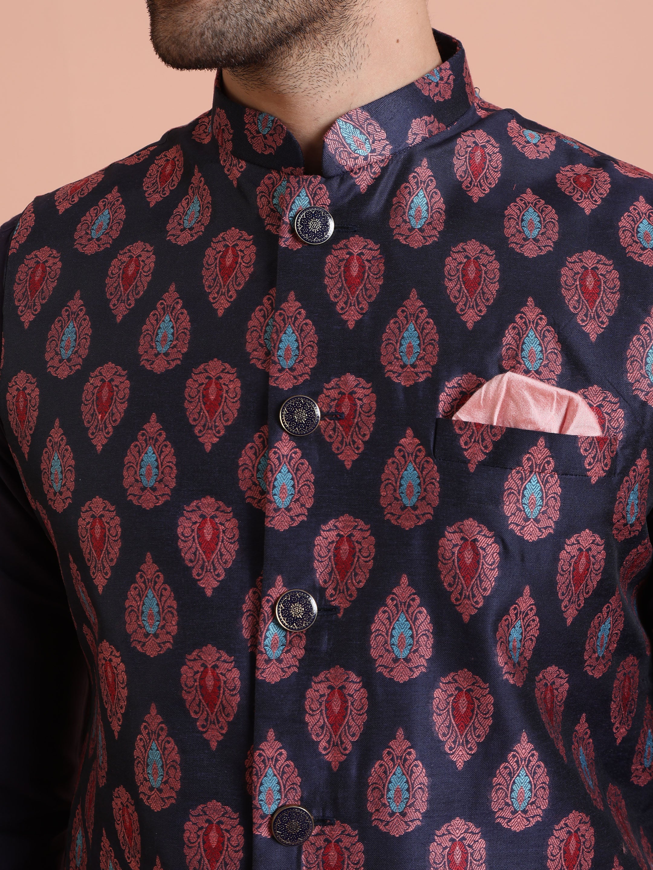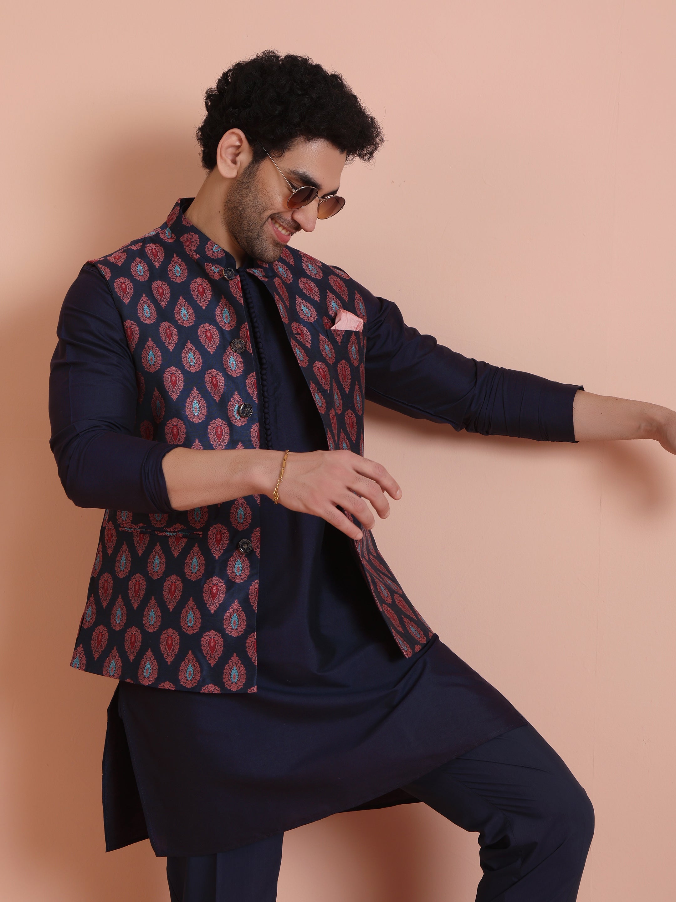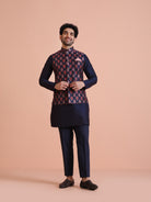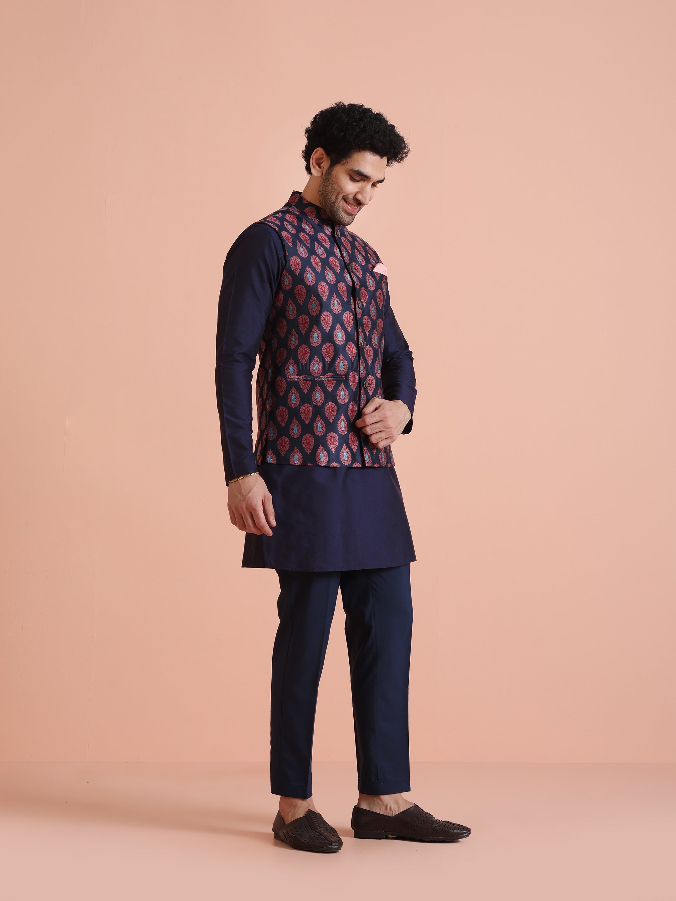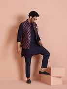 Navy blue silk blend jacquard kurta jacket trouser set for men. Elegant festive outfit ideal for weddings, cocktails, and celebrations.