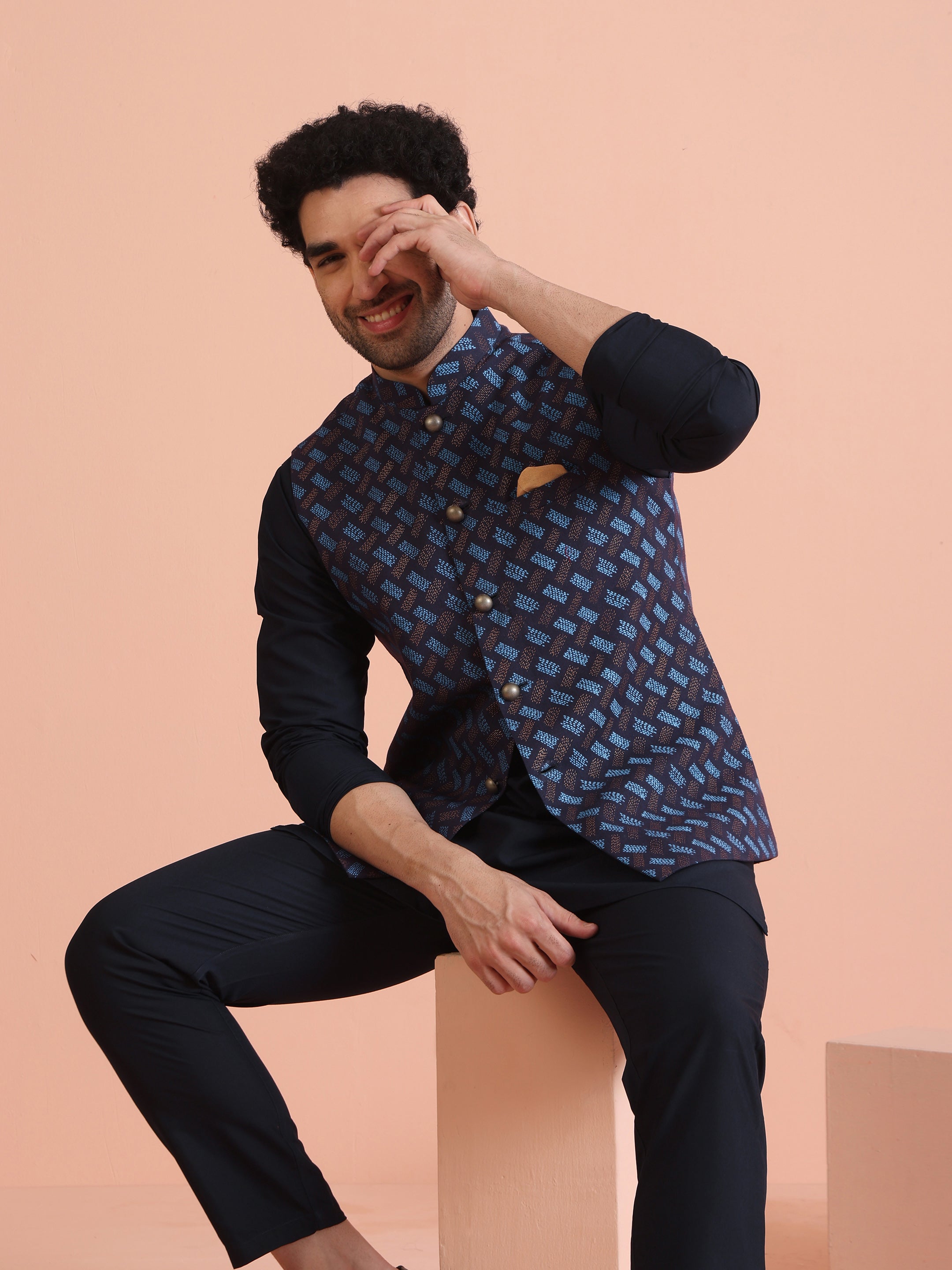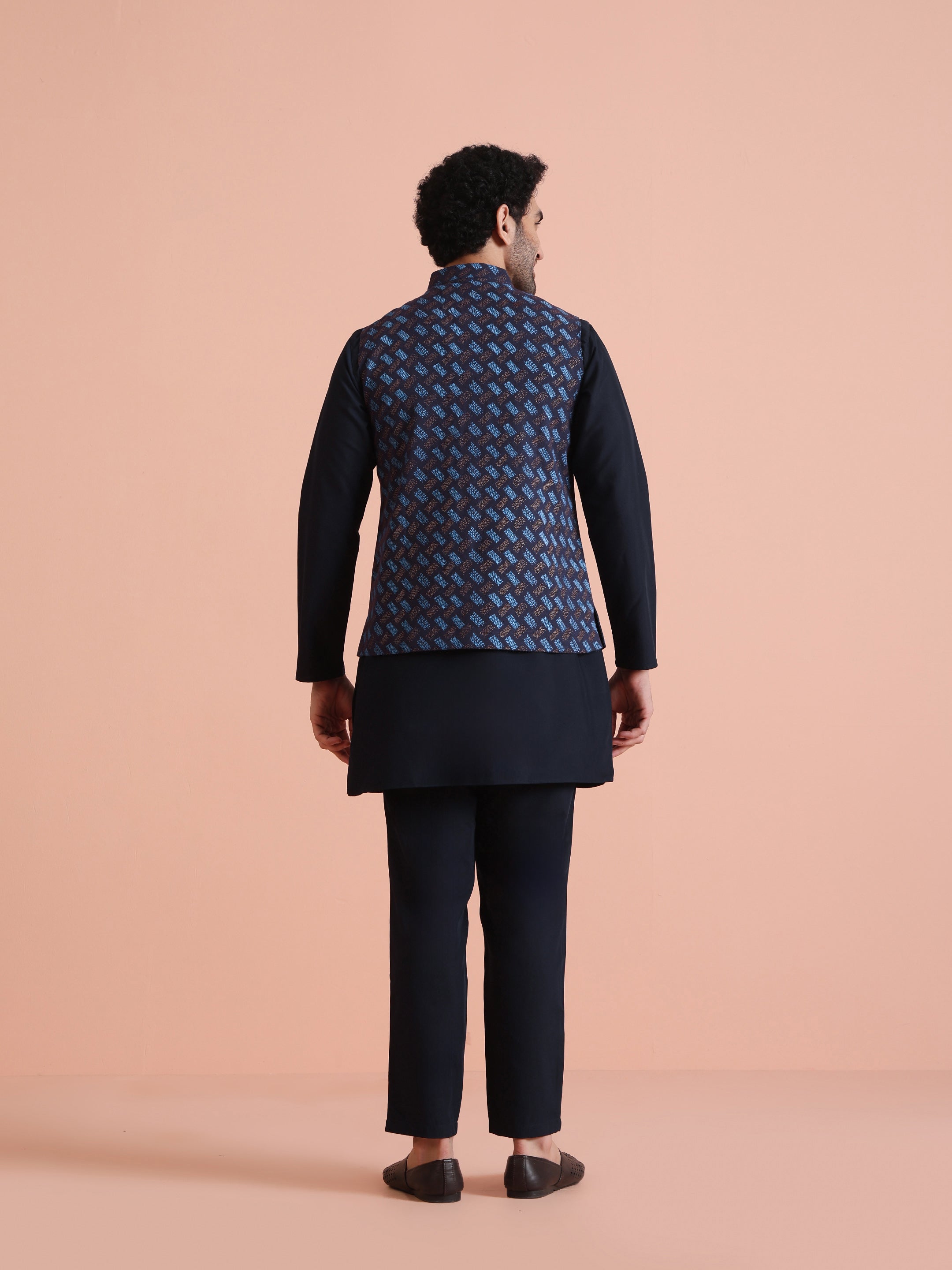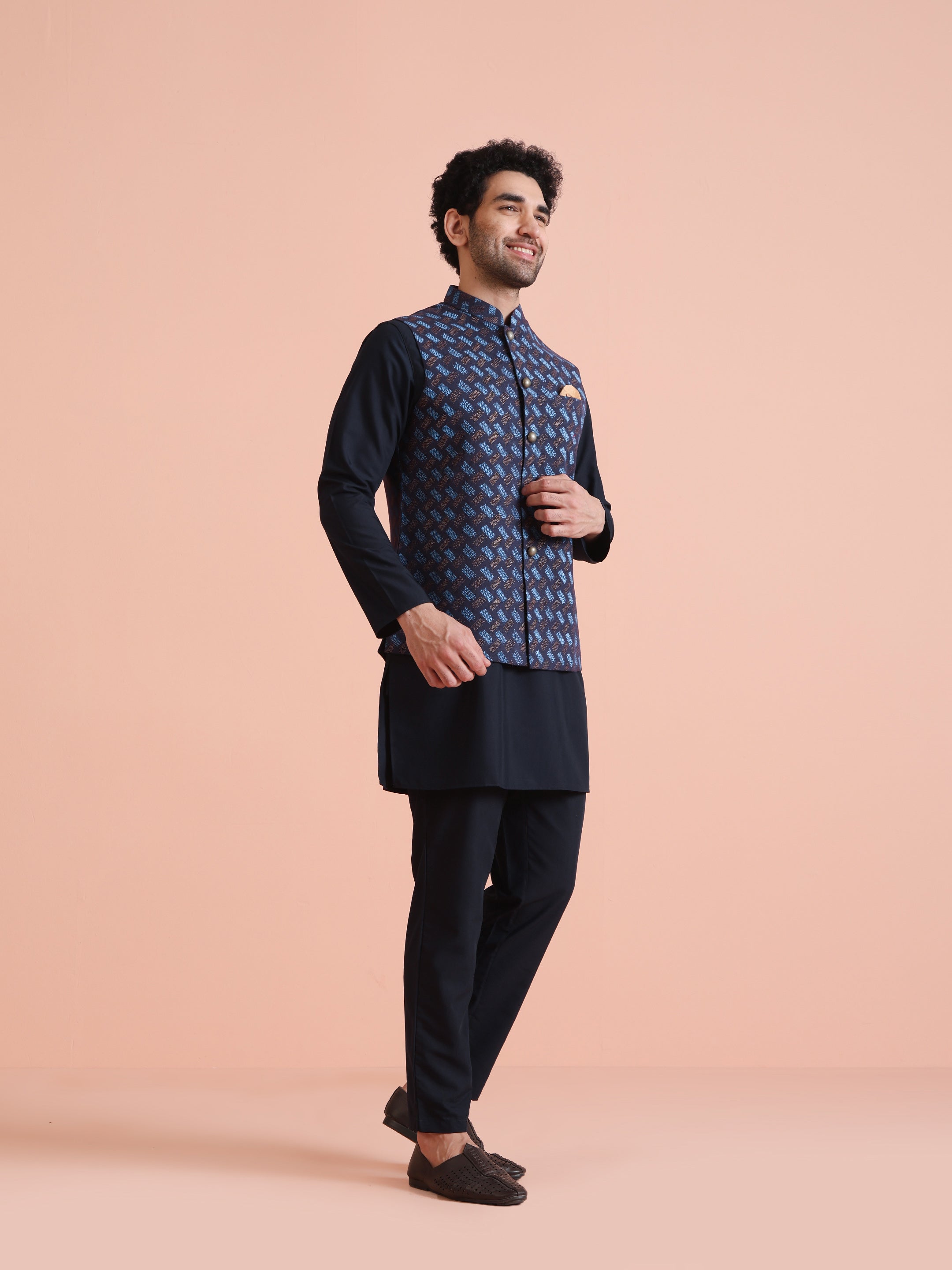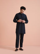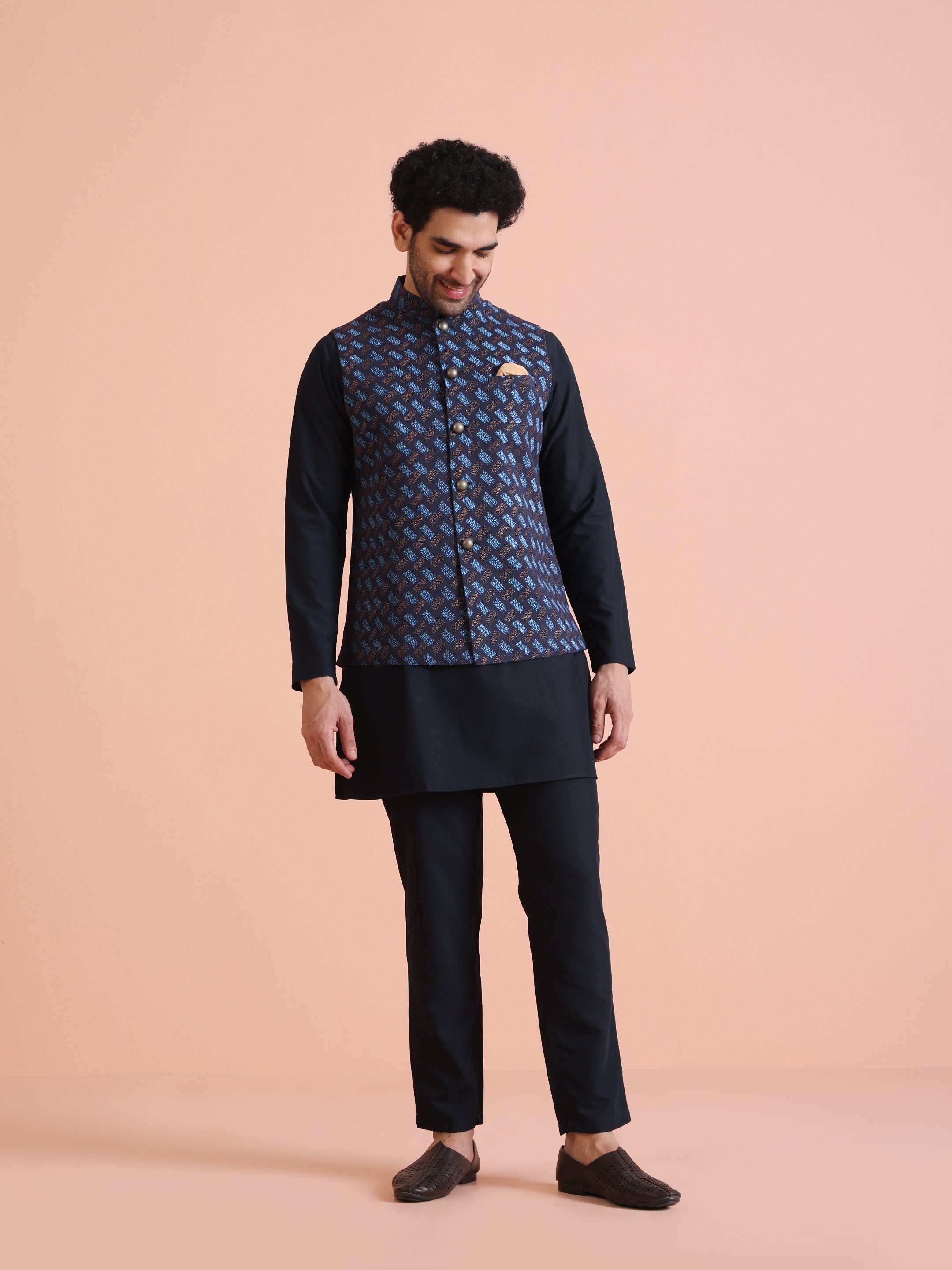 Navy blue cotton blend printed kurta jacket trouser set for men. Elegant festive look with modern geometric print and premium finish.