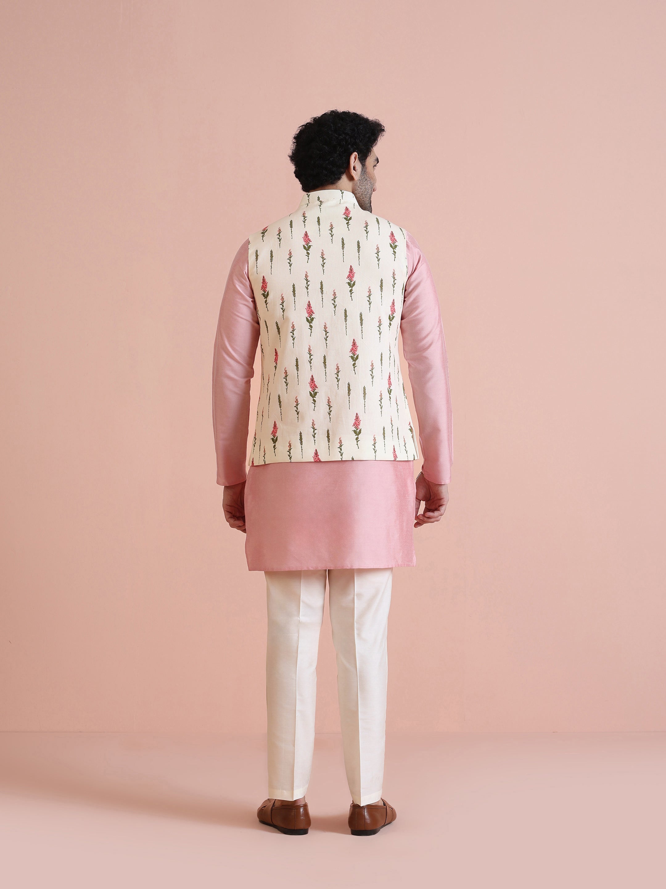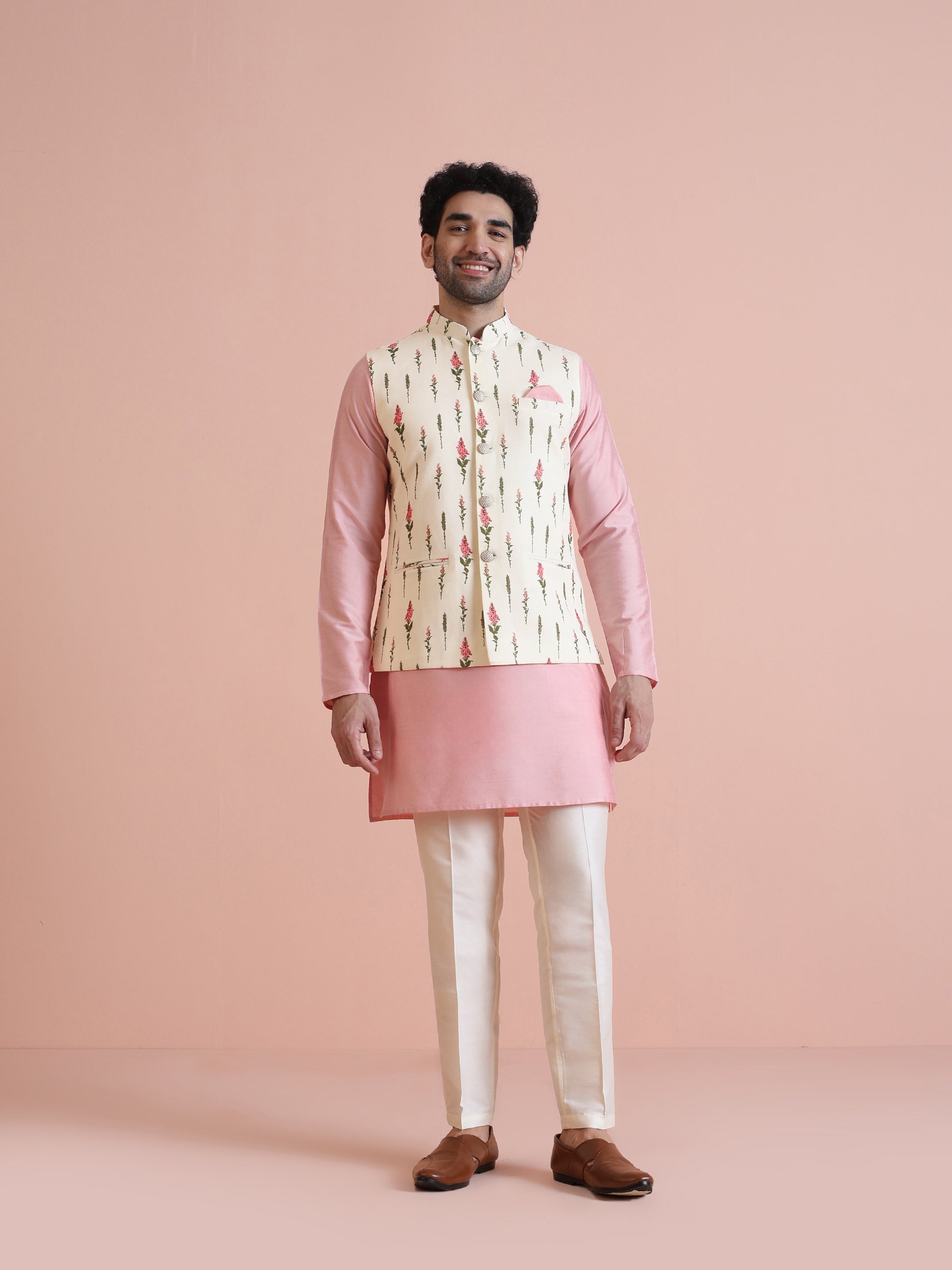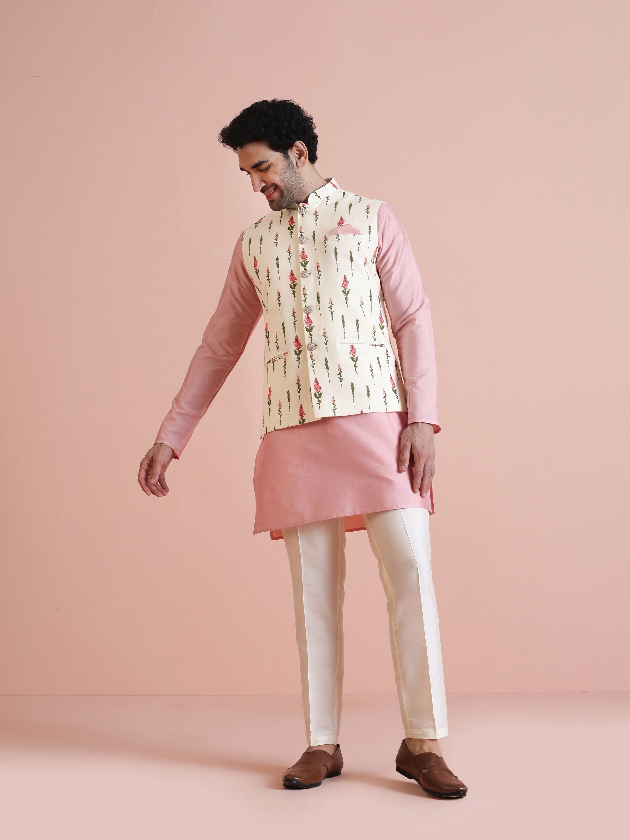 Pink cotton blend printed kurta jacket trouser set for men. Ideal pastel festive look for Haldi, Mehendi & summer weddings.