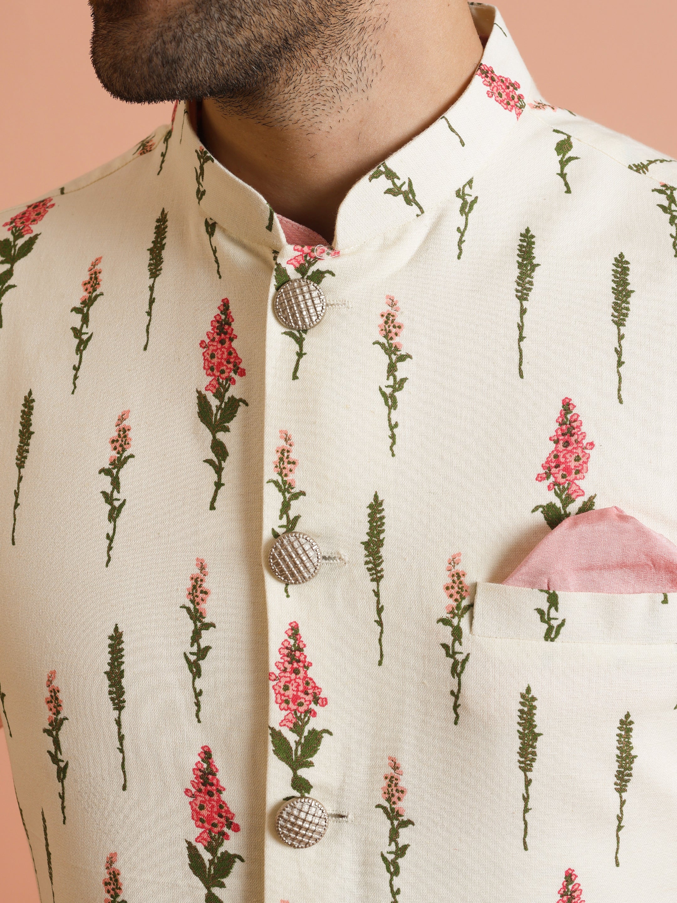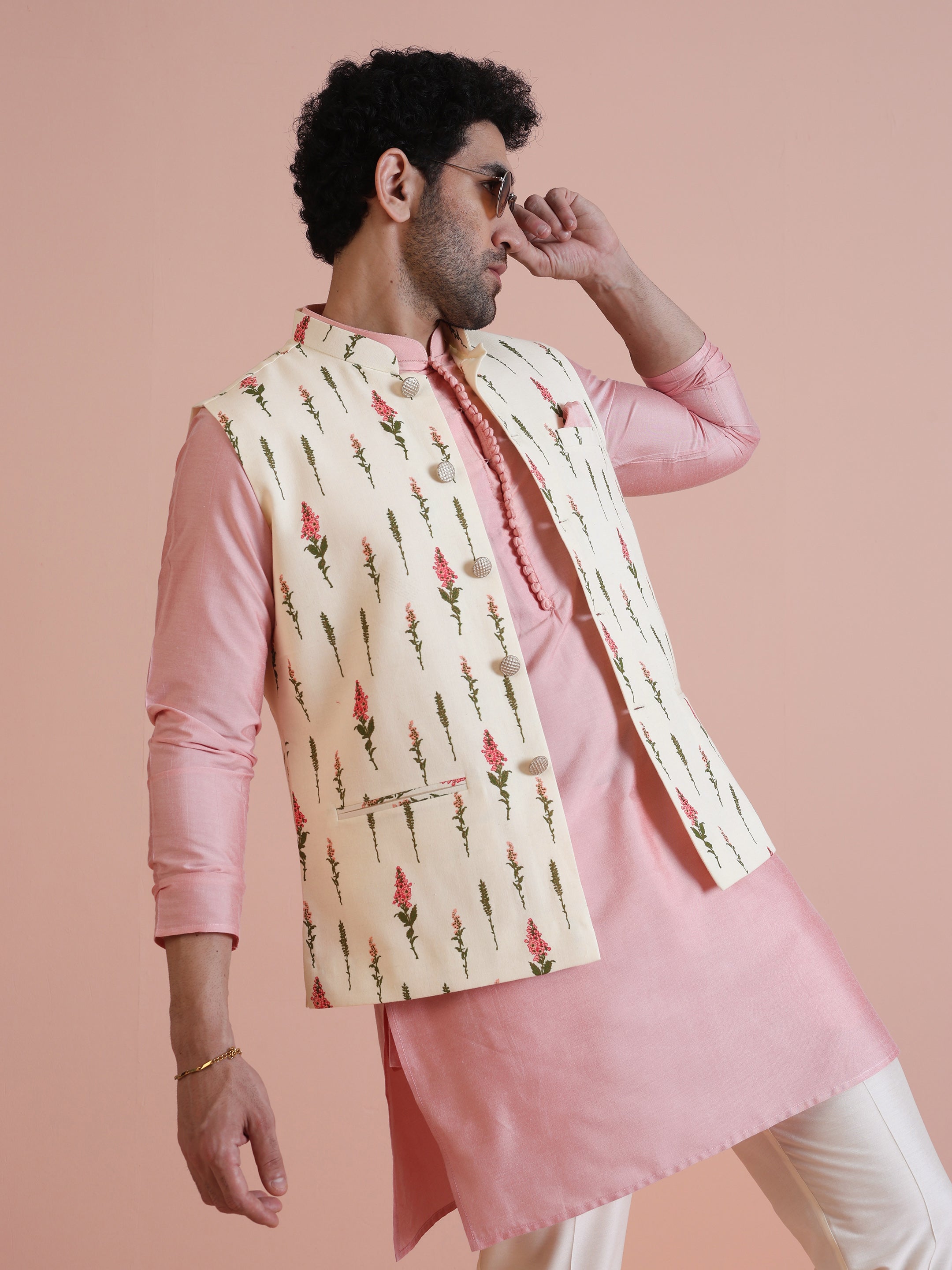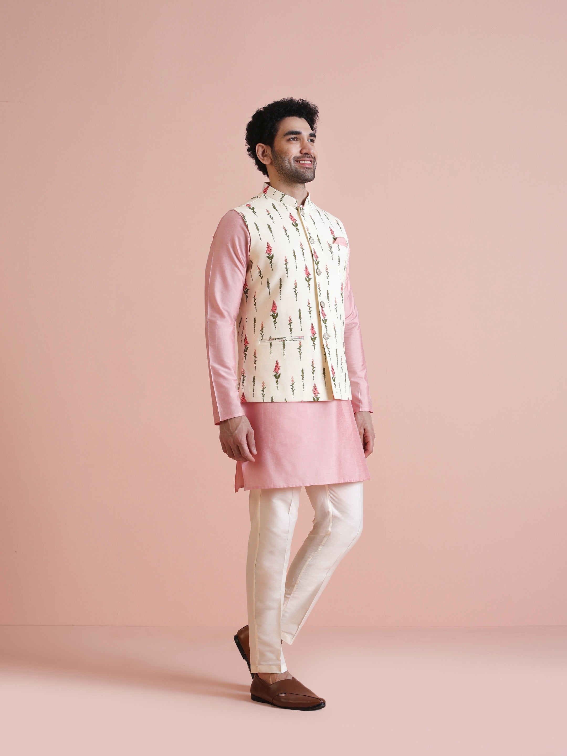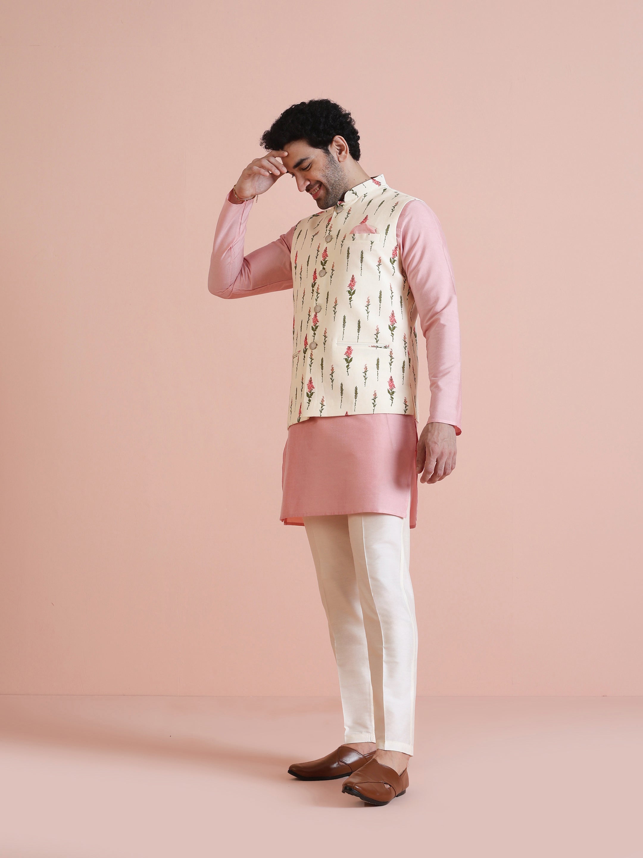 Pink cotton blend printed kurta jacket trouser set for men. Ideal pastel festive look for Haldi, Mehendi & summer weddings.